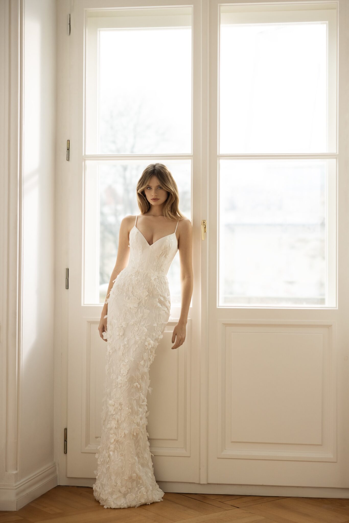 Less is more 2023The Genevieve gown speaks confidence and sophistication. The breathtaking floral-patterned 3D lace with transparent sequins and pearls on the sheath silhouette creates a truly unique look. A tender V-neckline with thin spaghetti straps make the corset look even more feminine. The Chantilly lace enriches the style. Detachable Mikado cape creates gorgeous off-shoulder wrap sleeves and a bow train on the back that adds a touch of royalty to the final look