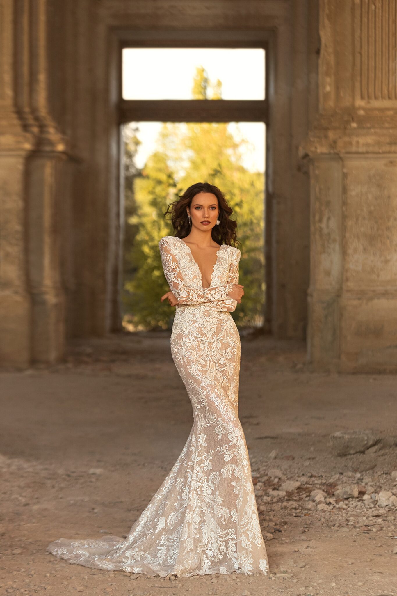 Golden Hour, Plus Size, Sample SaleGeorgina mermaid silhouette dress is made of spectacular lace decorated with beads. The lace and silhouette is perfectly matching with a transparent long sleeves and V-shaped neckline.