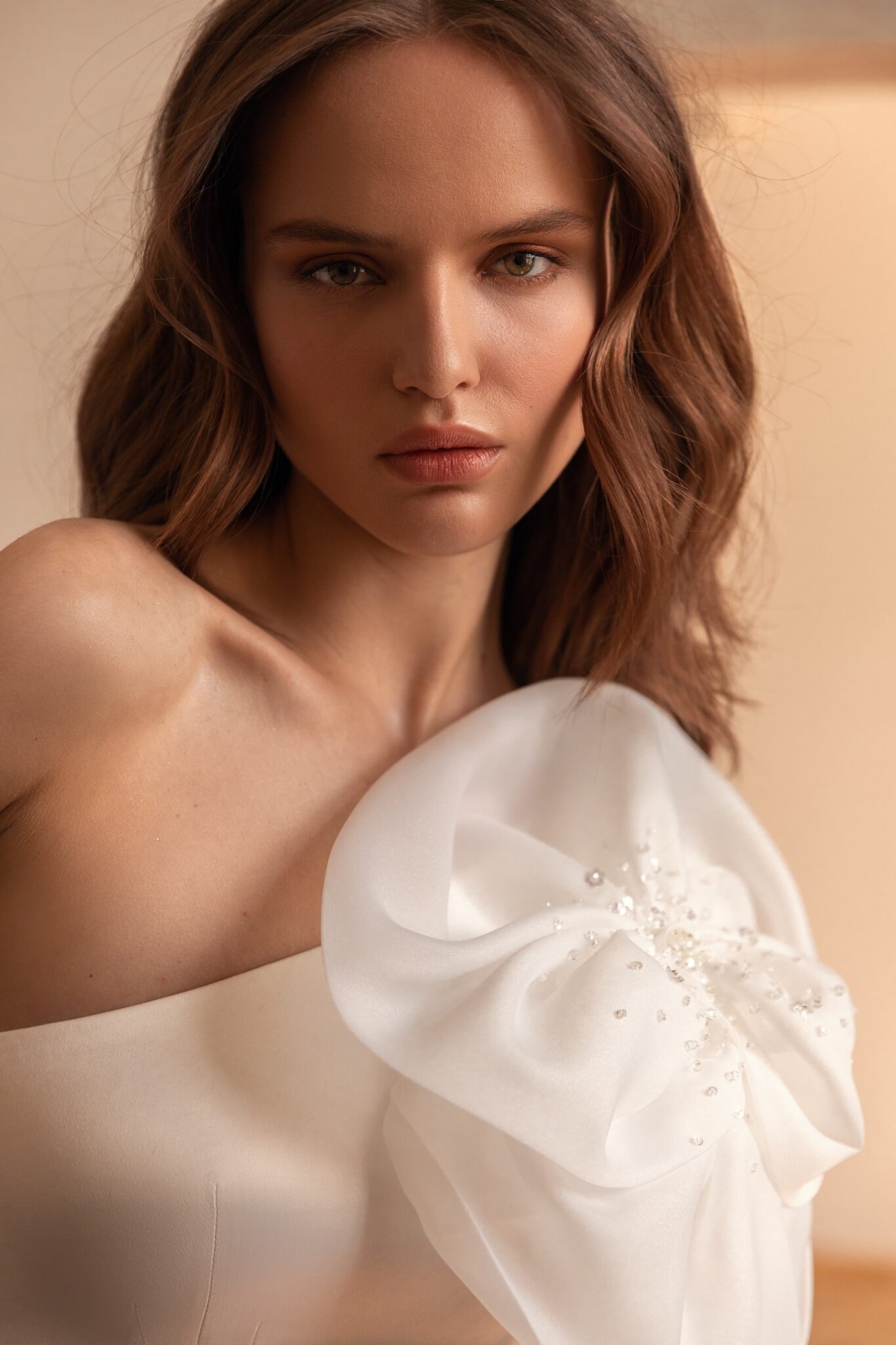 Less is more 2022Gillian is an absolutely eye-catching wedding dress. This dress of stylish mermaid silhouette is made of glossy satin. The fitted corset passes into a long sleeve on one hand and a fantastic volumetric flower made of Tulle and decorated with pearls is placed on the shoulder. The skirt is fitted on the hips and becomes a little flair down its length and has a small train.