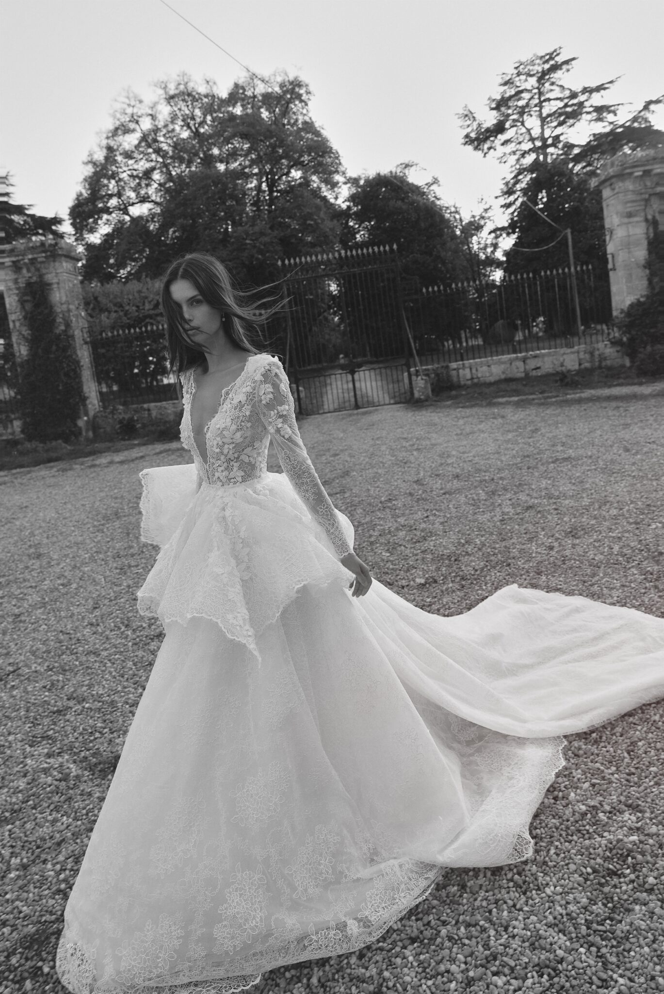 Atelier La Femme EditionGrandis gown is a luxurious A-line masterpiece, featuring long sleeves and a deep V-neckline for an elegant, elongated silhouette.