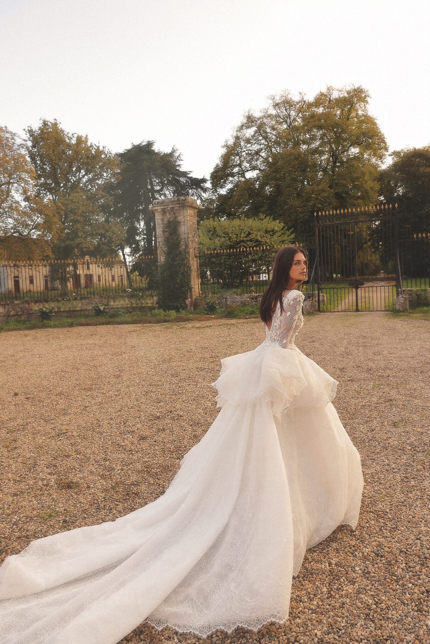 The back mirrors the front with a captivating V-shaped opening, leading into a sweeping, dramatic train.