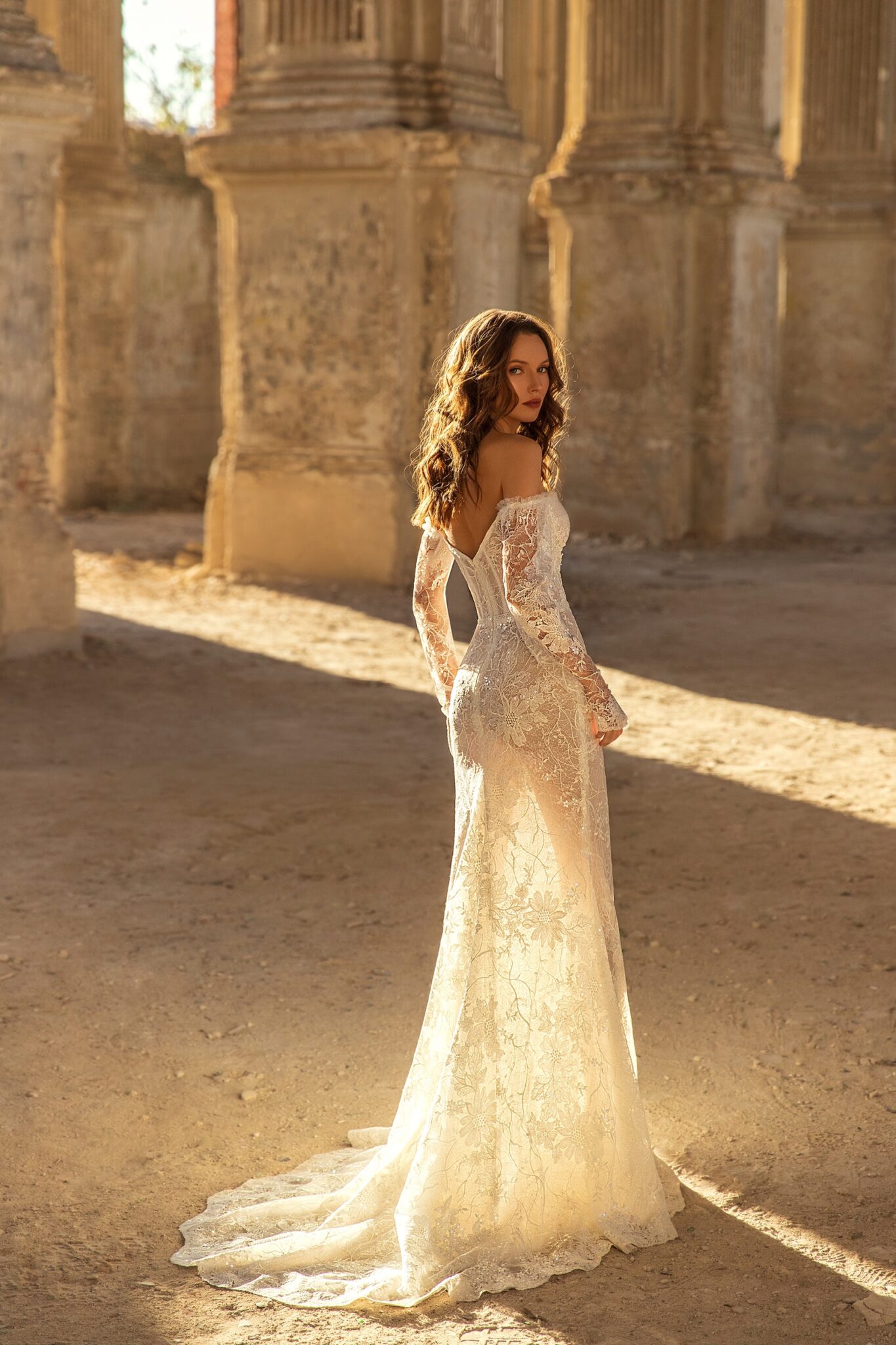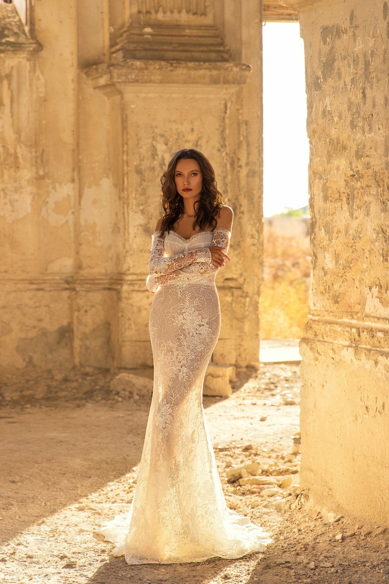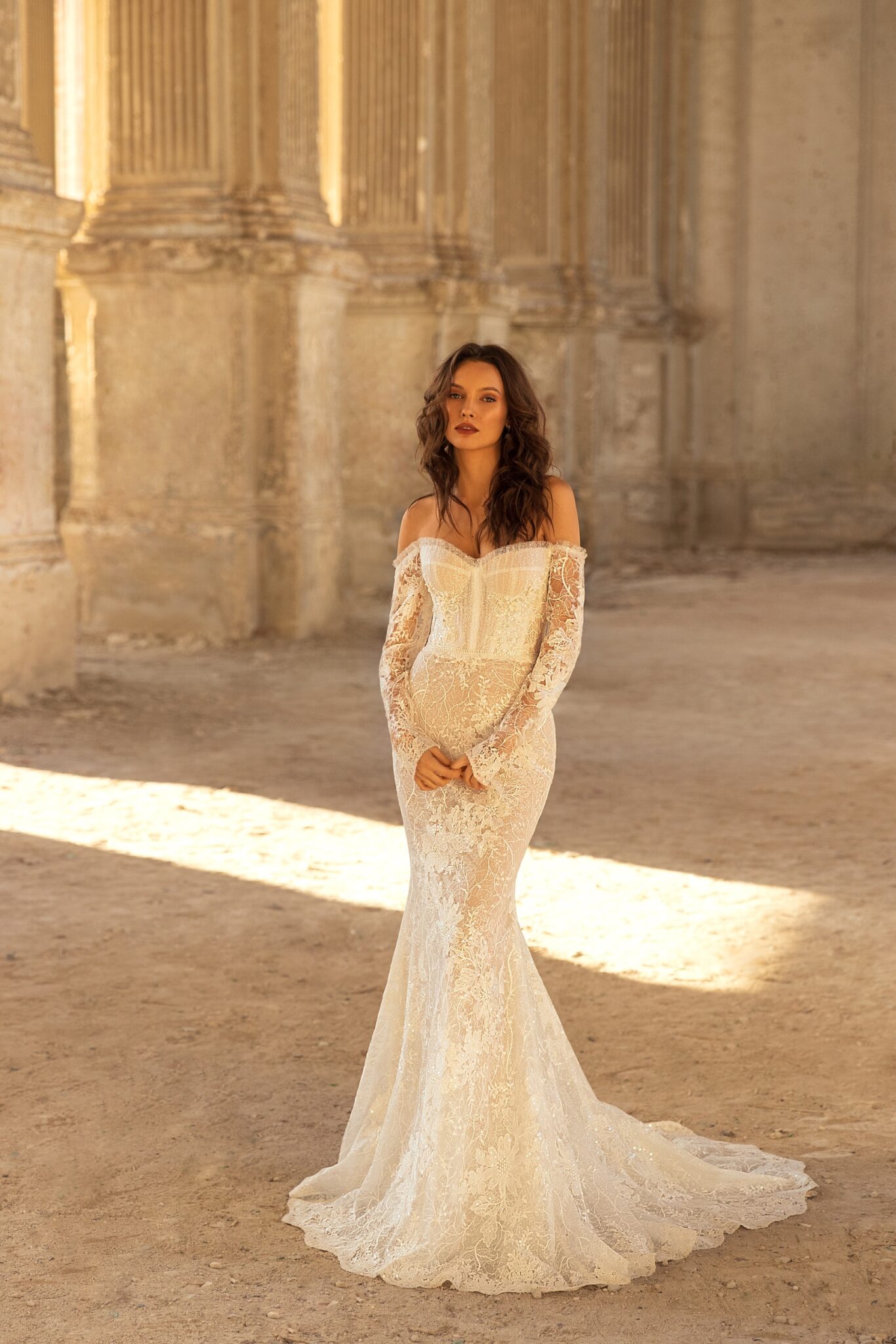 Golden HourDelicate Gwen gown it is a tender combination of sweetheart neckline, mermaid silhouette and off shoulders long sleeves. The corset is made of shiny fabrics and decorated with beads and pearls.