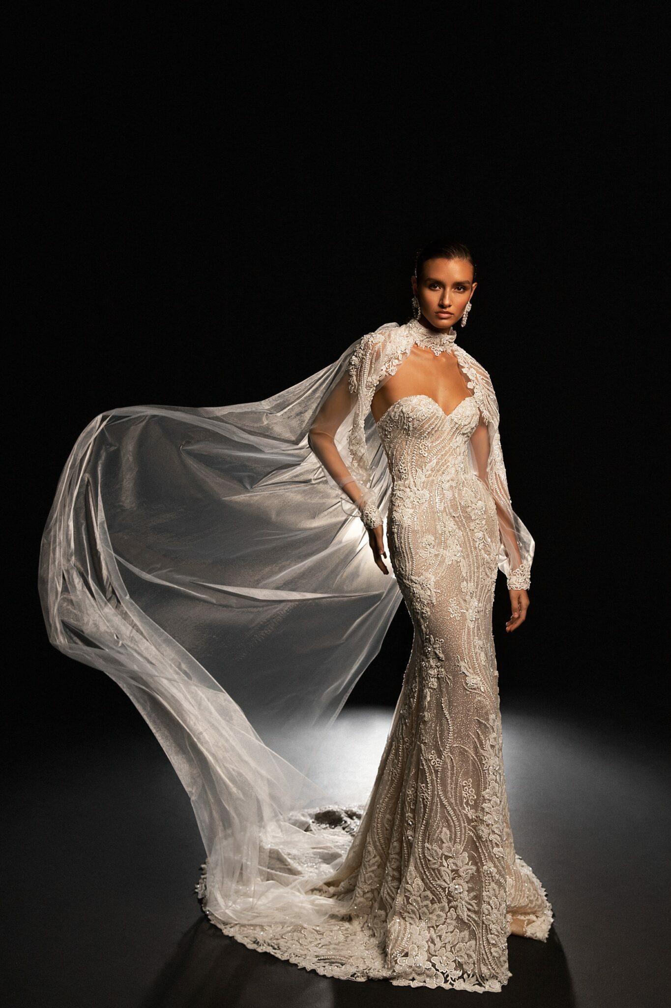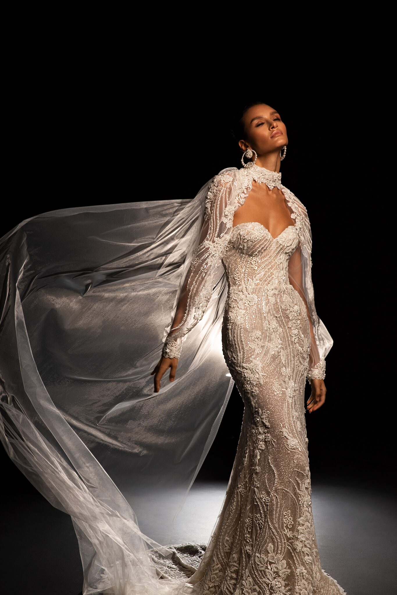 StardustHaidi is a wedding gown with an additional wrap with long sleeves. The dress with a sweetheart neckline is decorated with gorgeous lace. There is a short train. The wrap is made of striking fabric. The scrunched up sleeves are decorated with small Buttons. The wrap fastens with a buckle.