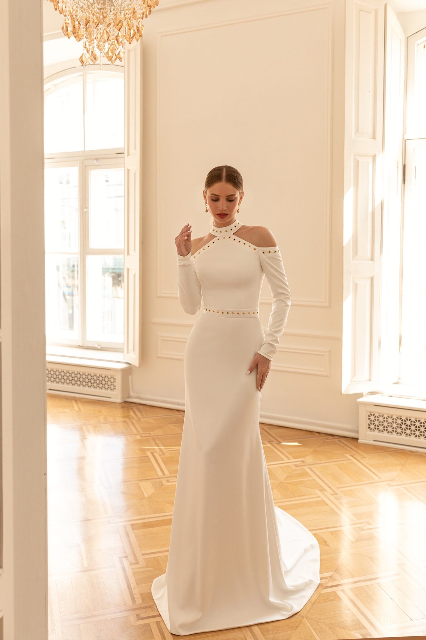 Less is more 2022Hardy wedding dress is a perfect option to create a confident bridal look. The dress of Straight silhouette is made of soft fabric. The top of the dress is decorated with metal details with off-shoulder long sleeves and tight neckline. The waistline is highlighted with a belt with same decorations. The skirt falls loosely and ends with a small train.