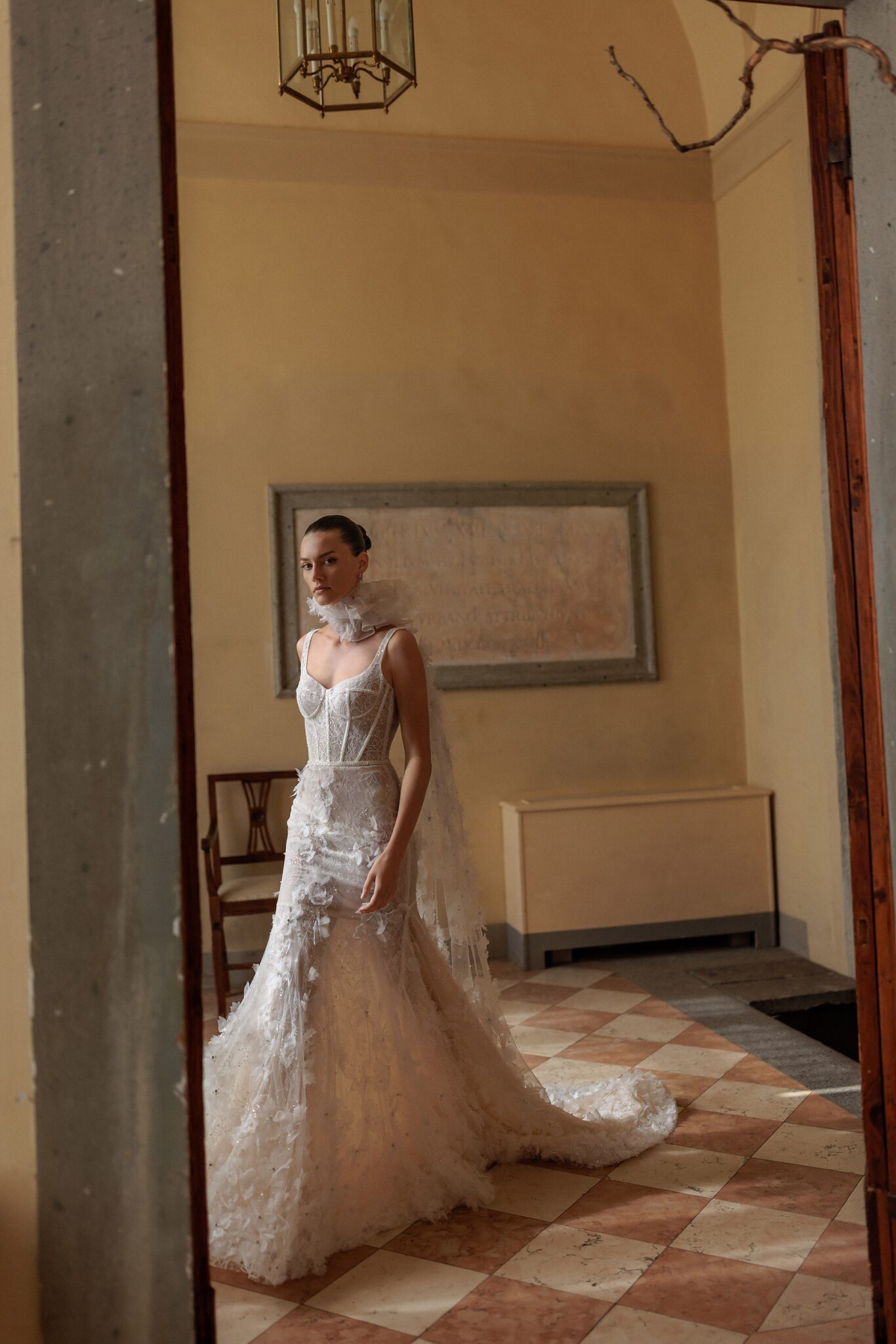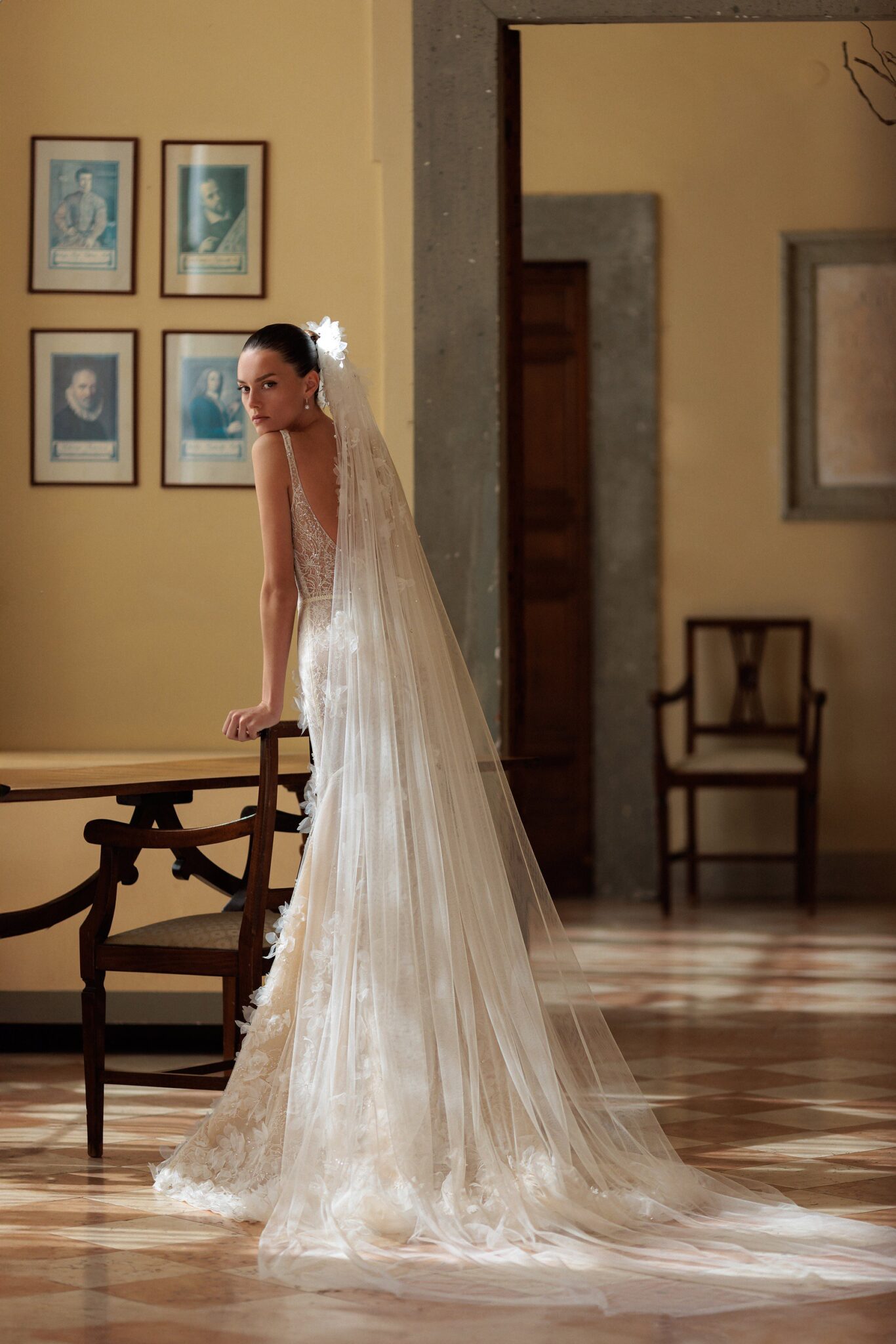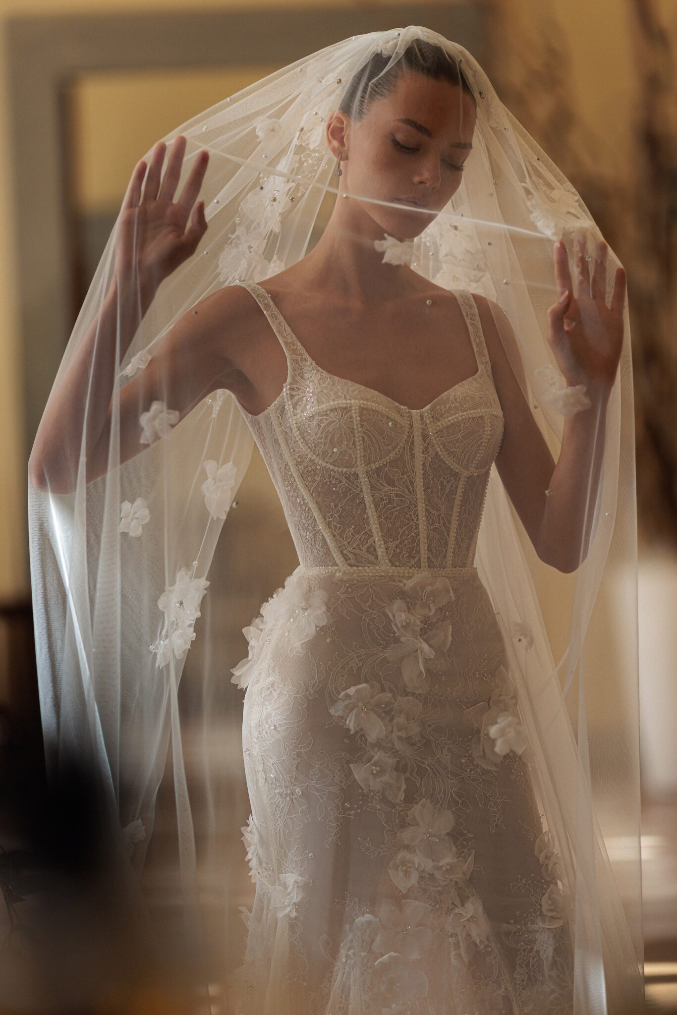 L'UnicoModern classics: detailed strapped corset with highlighted waistline and smooth skirt, featuring handcrafted embroideries all over the dress and complemented with a veil decorated with floral elements.