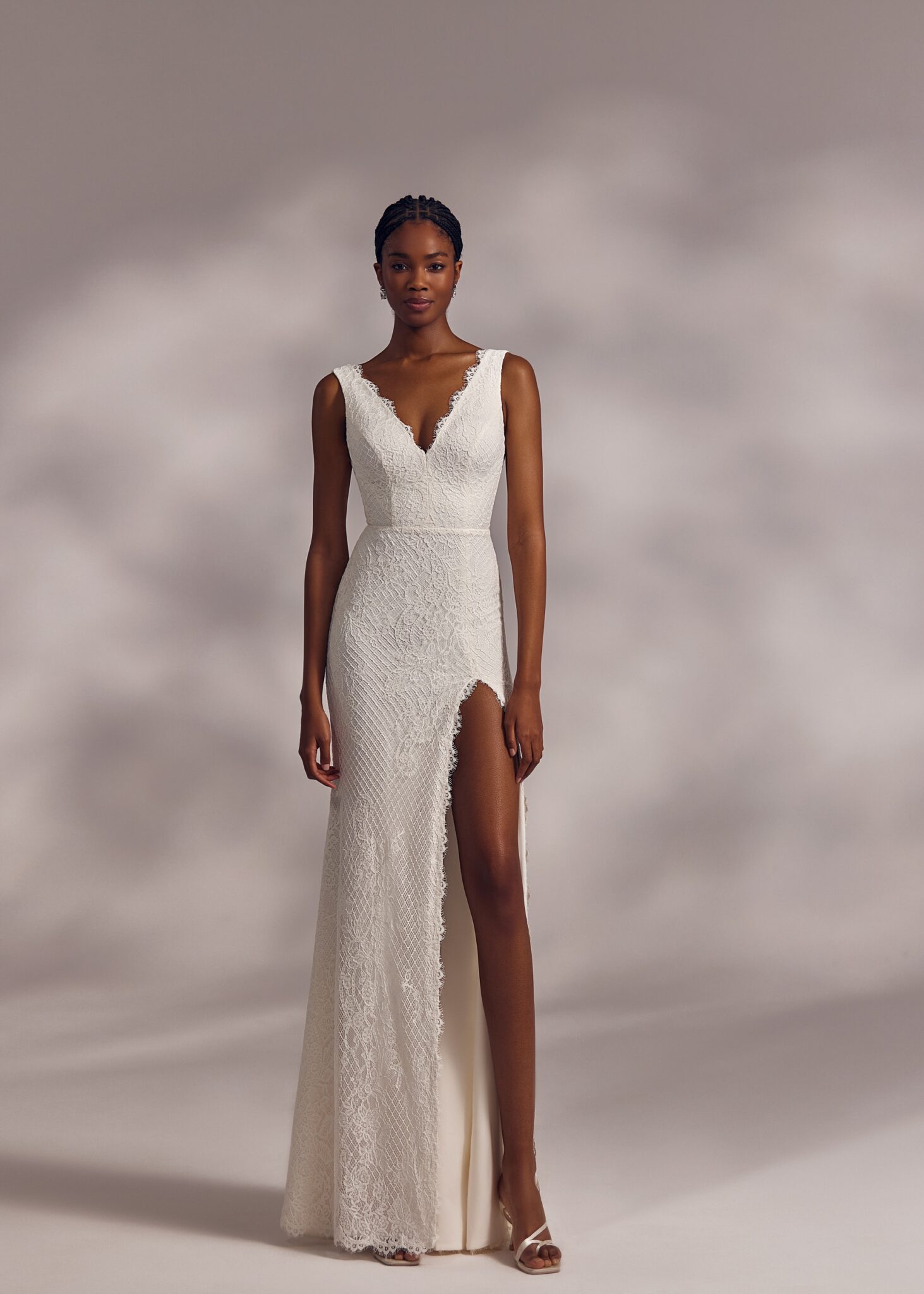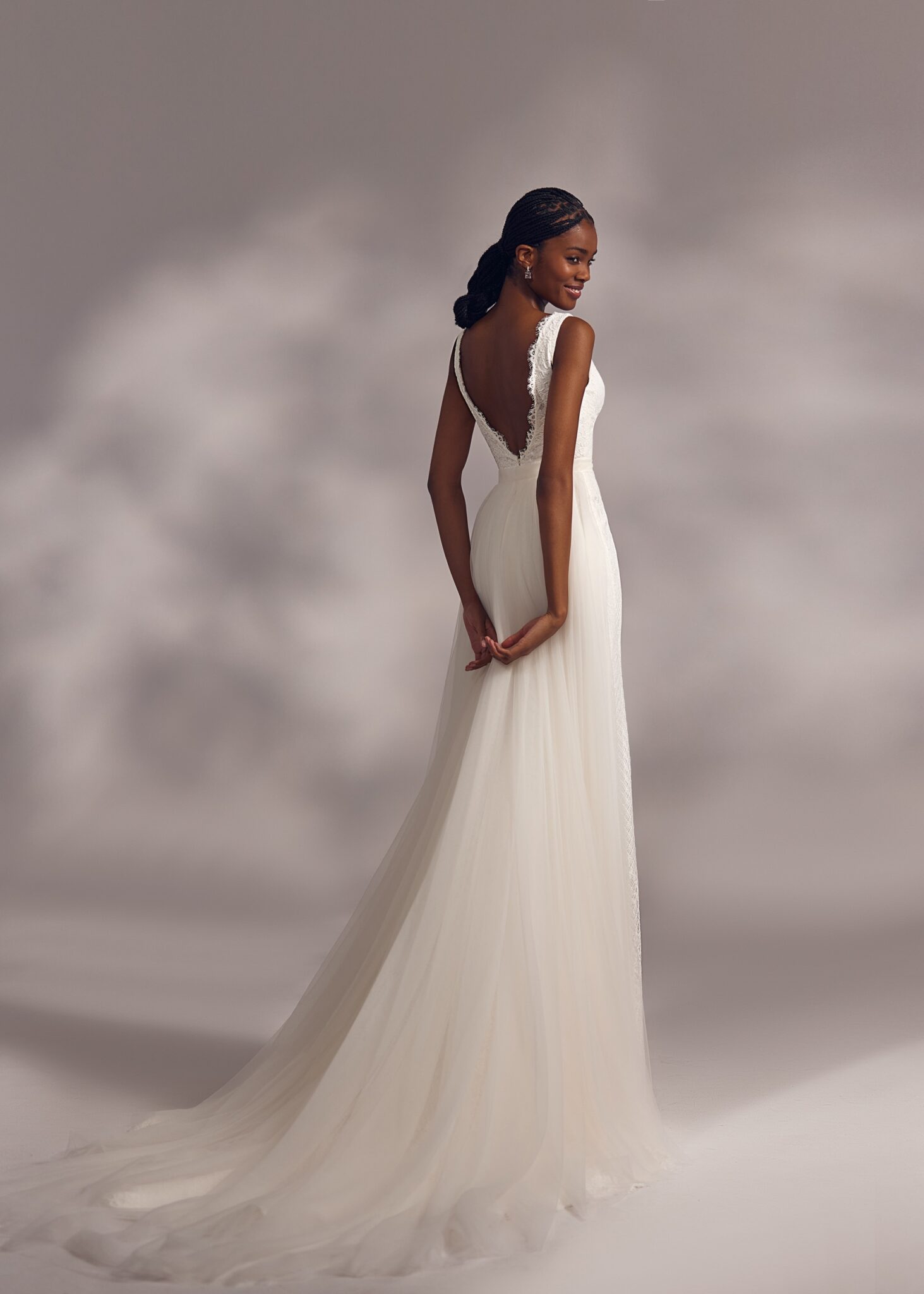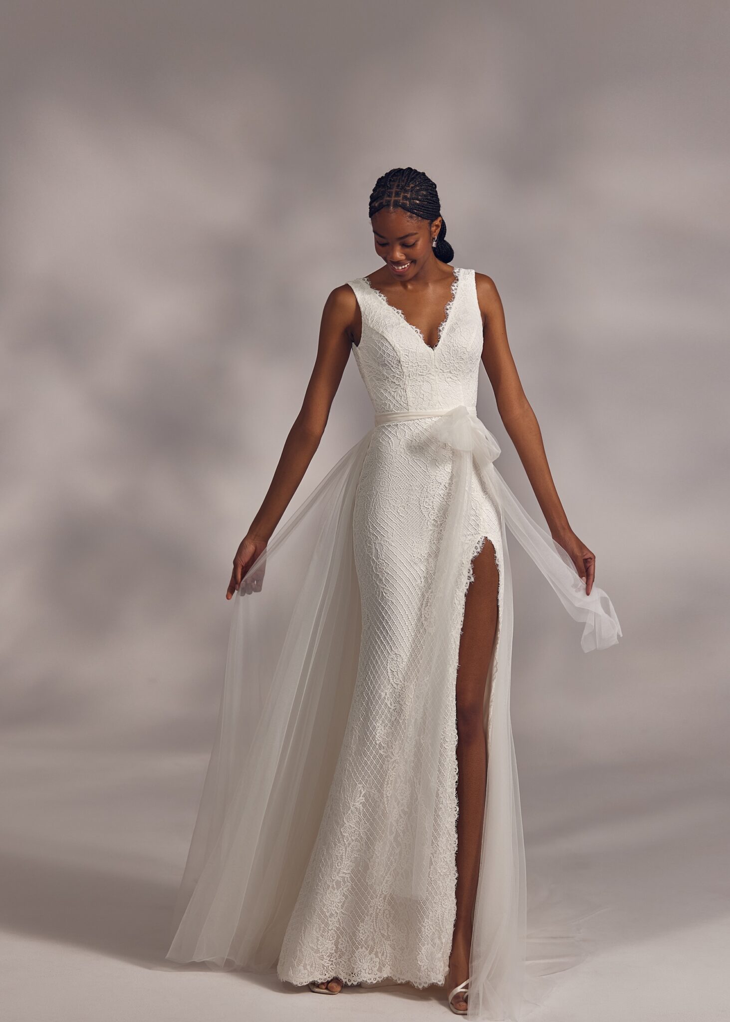 Less is More IVHatton – classic V-neck dress with open back, slight lace decoration on the edges, split skirt and detachable lightweight tulle bow.