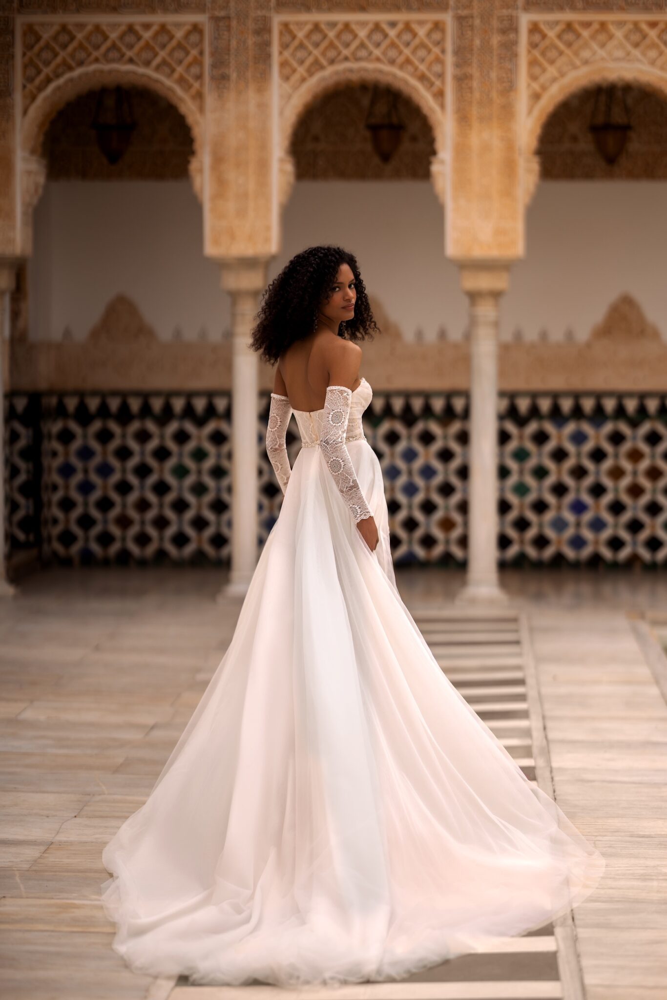 Alma de OroIntroducing our stunning two-piece wedding dress, a perfect fusion of modernity and tradition. This exquisite ensemble consists of a short A-line dress and a dreamy tulle overskirt, allowing you to effortlessly transition from ceremony to reception. The corset is adorned with elegant draping, adding a touch of sophistication and romance. The sweetheart neckline beautifully frames your décolletage, enhancing your natural beauty. For added versatility, the dress features detachable sleeves, giving you the freedom to customize your look and create the perfect balance between coverage and allure. The short dress showcases your legs with grace and charm, while the tulle overskirt adds a touch of ethereal enchantment as it floats delicately with your every movement.
