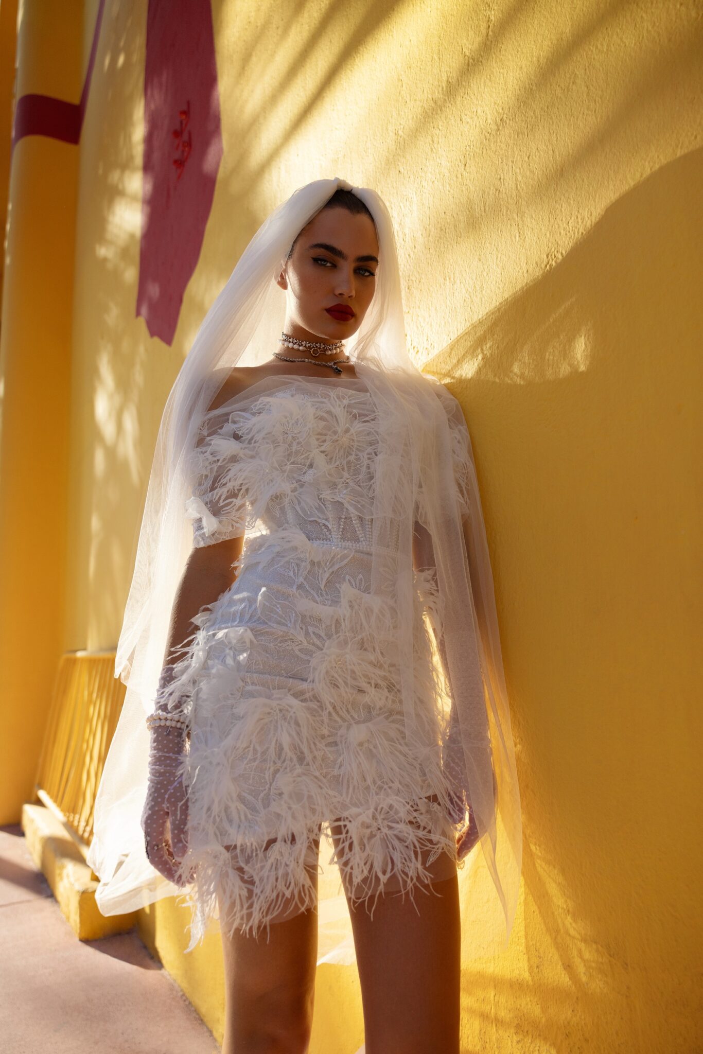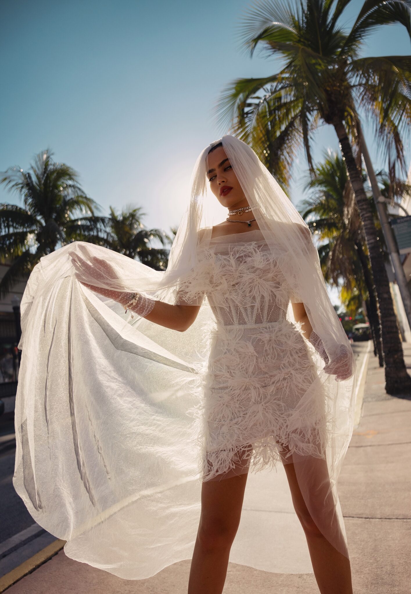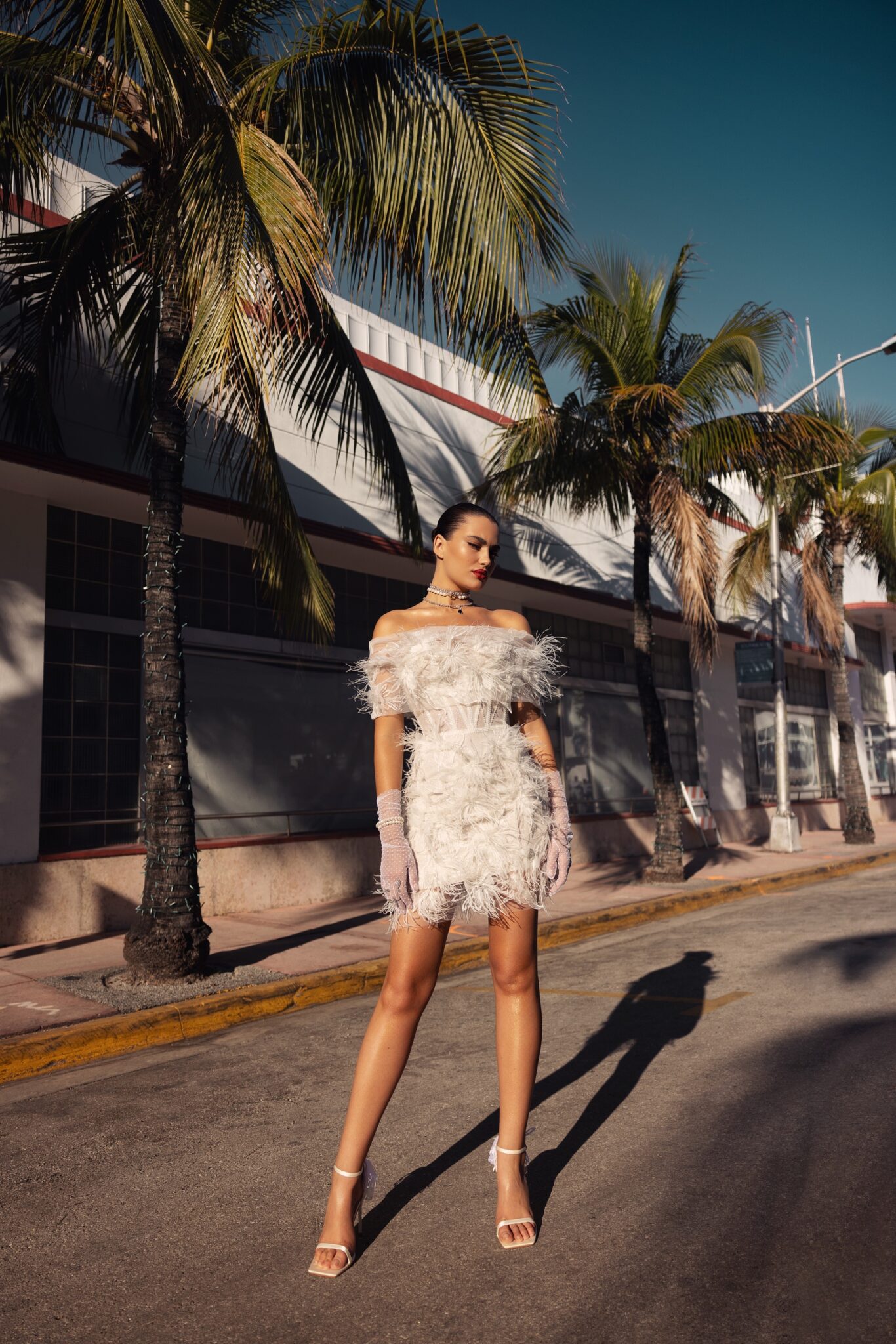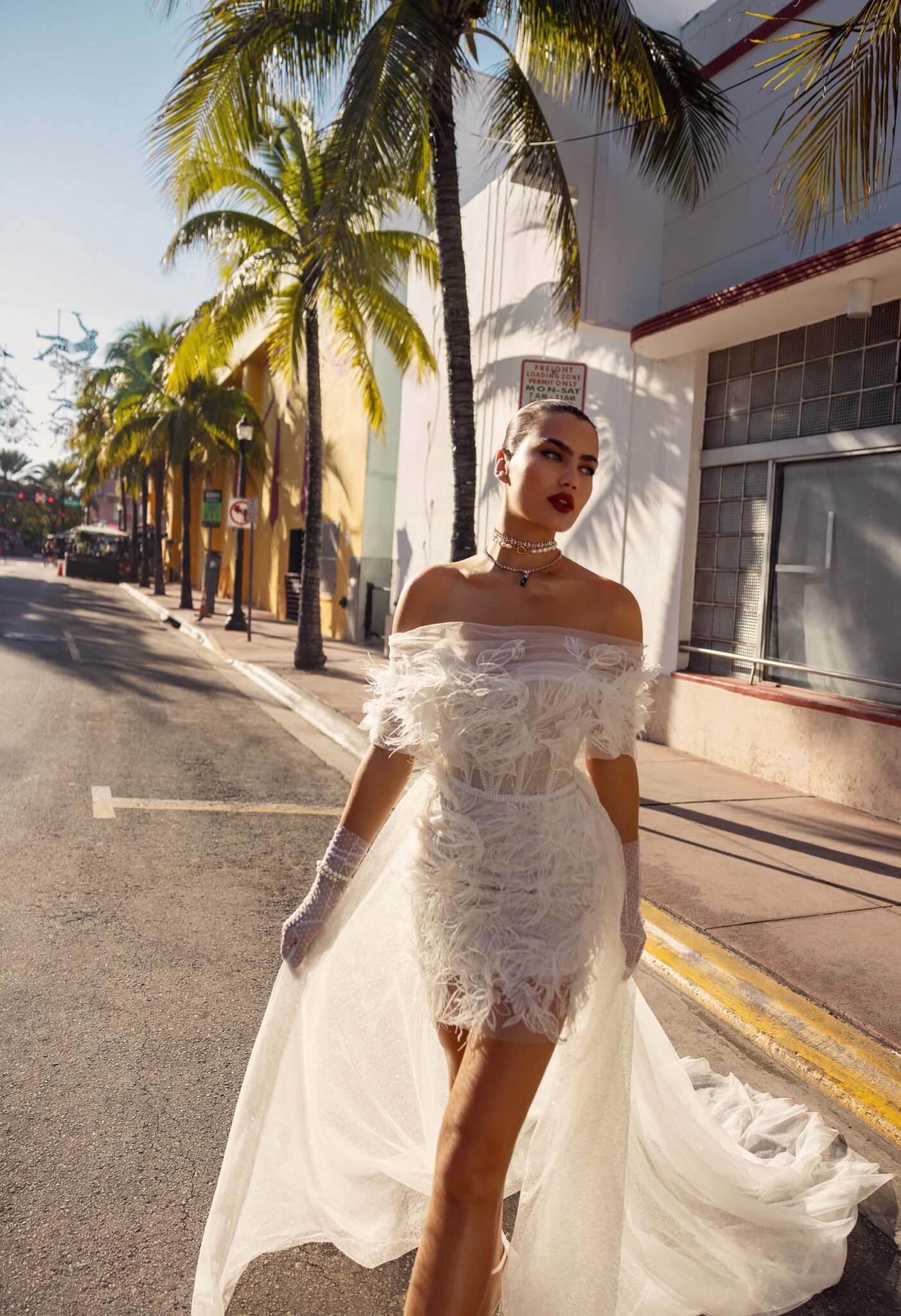 Miami BlissStep into the spotlight with this stunning off-shoulder wedding dress, adorned with lavish feathers. The playful and feminine design features a fitted bodice that flares out into a short, flirty skirt. The luxurious feathers add texture and dimension, creating a show-stopping look that is sure to turn heads. This dress is a true fashion statement that will make you feel like a fashion icon. Accessorized with a tulle overskirt , it takes on extra volume for even more glamorous bridal look.