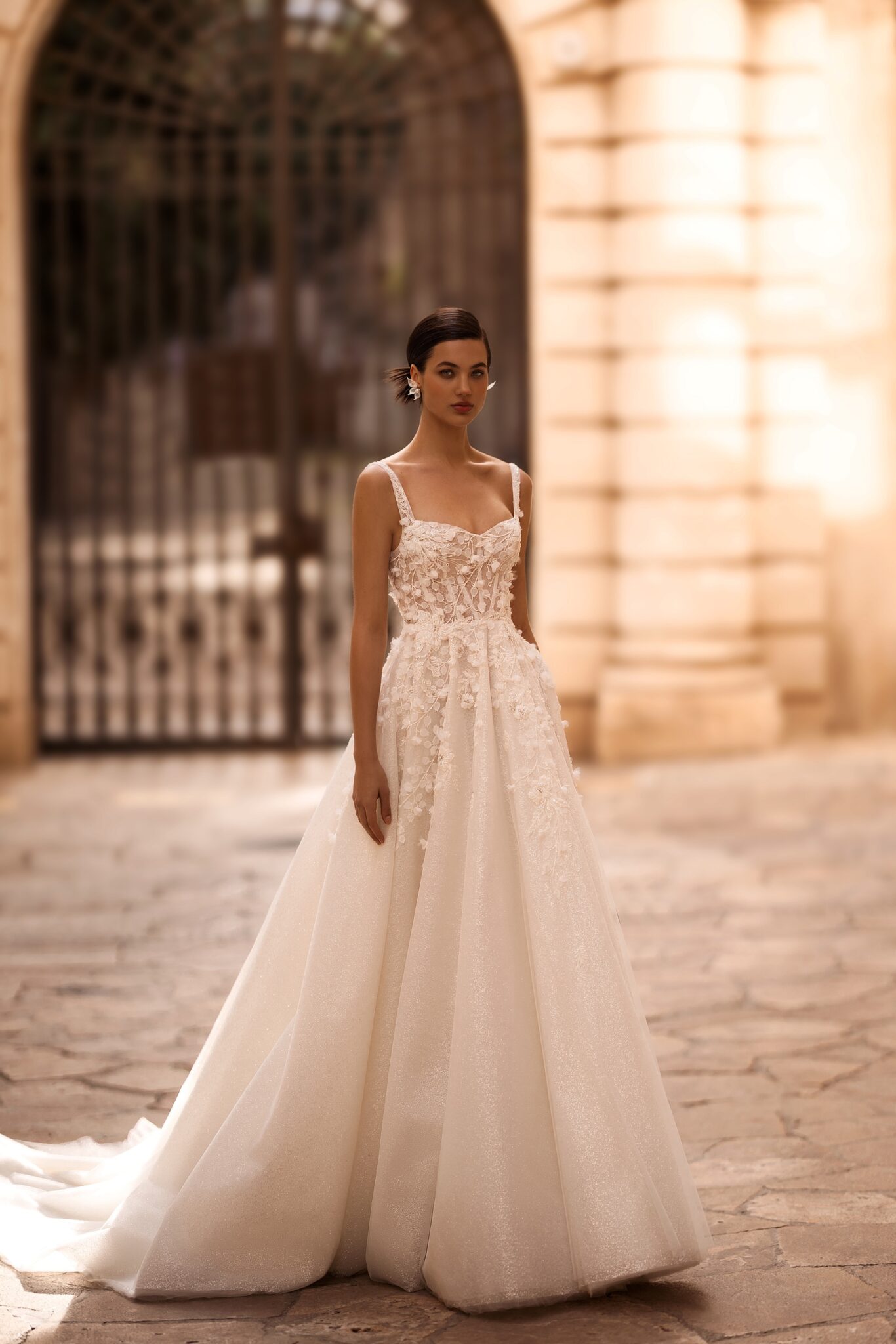Alma de Oro, Plus Size, Sample SaleIntroducing our captivating A-line wedding dress, a harmonious blend of shimmering elegance and delicate femininity. Crafted from luxurious shimmer fabric, it glimmers and shines with every step, emanating a mesmerizing radiance. The corset, adorned with intricate floral lace, is a work of art that extends gracefully from the top of the skirt to the bodice, creating a seamless transition. The addition of straps enhances both support and style, while the sweetheart neckline accentuates your natural beauty and adds a touch of romantic allure. The A-line silhouette flatters your figure, cascading gently to the floor with effortless grace. As you move, the shimmer fabric catches the light, creating a captivating play of luminosity that enchants all who behold you.