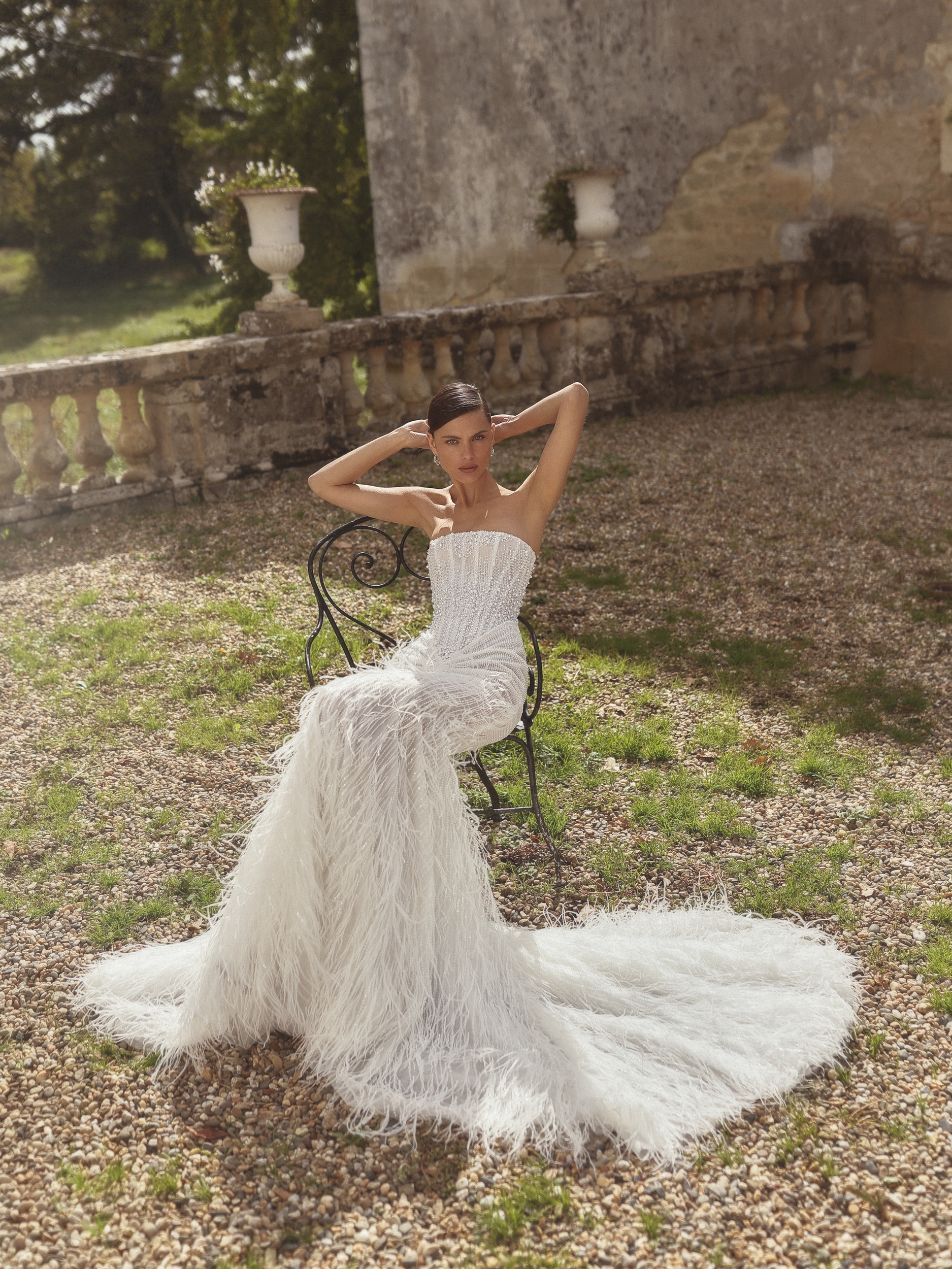 Atelier La Femme EditionHollywood gown is an exquisite mermaid-style dress designed to captivate with its refined glamour. It features a straight neckline with a distinctive pointed dip in the center, creating a striking and modern silhouette. The shimmering lace is embellished with delicate pearls, adding subtle sparkle and dimension. The skirt is adorned with soft feathers that bring movement, airiness, and a touch of high-fashion elegance to the look. The corset laces up at the back for a perfect fit, and the gown is completed with a beautiful, flowing train that enhances its luxurious presence. A perfect choice for brides who want sophistication with a whisper of couture flair.