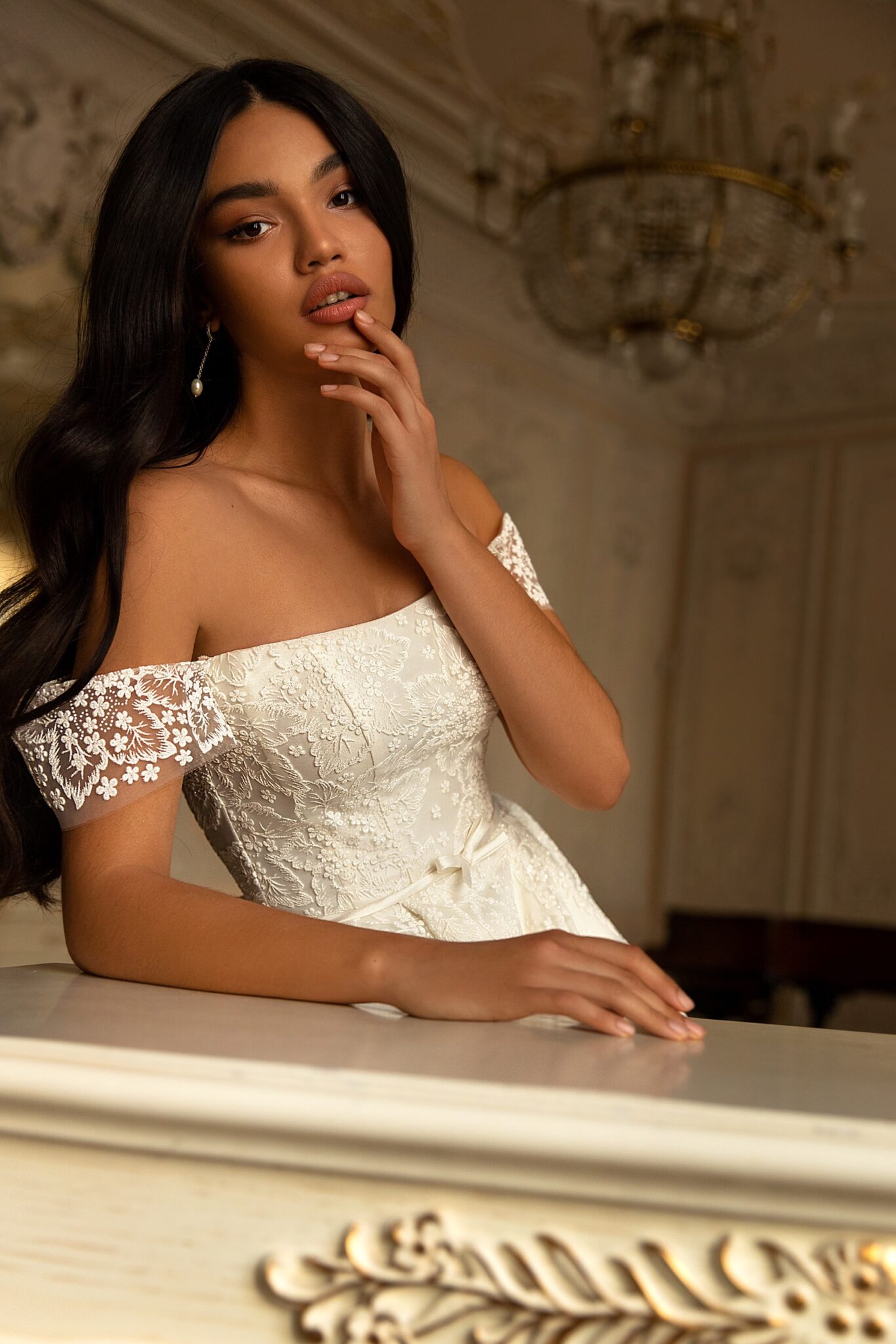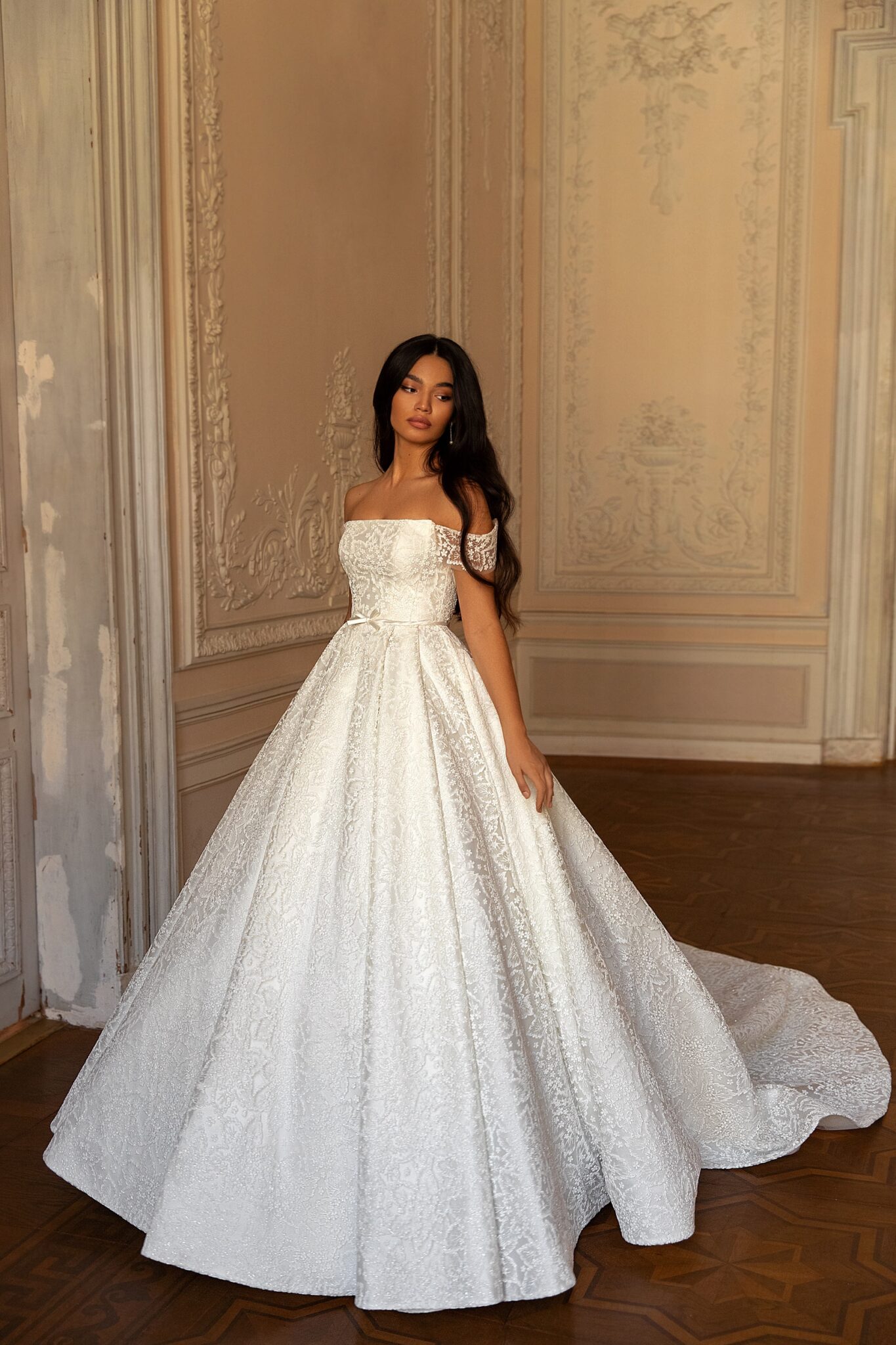 RomanceIda is a shining and sparkling bridal gown with lowered shoulders. A-line wedding dress is made of delicate lace. Crystals and beads are found along the whole length of the dress. Long tail and bow on breasts look elegant. Short sleeves and long tail add femininity to this wedding look. A splendid Ida ball gown can turn you into a princess. A delicate corsage is decorated with lowered shoulders and falbalas.