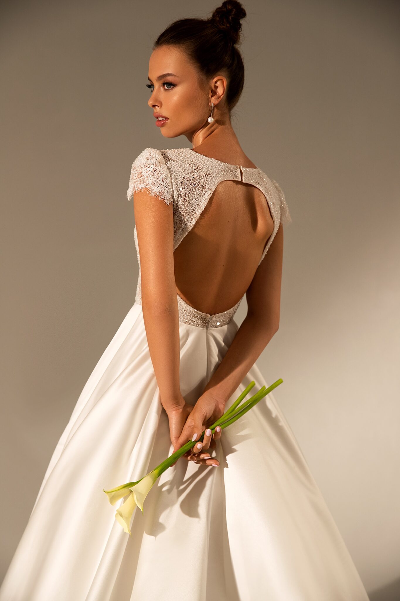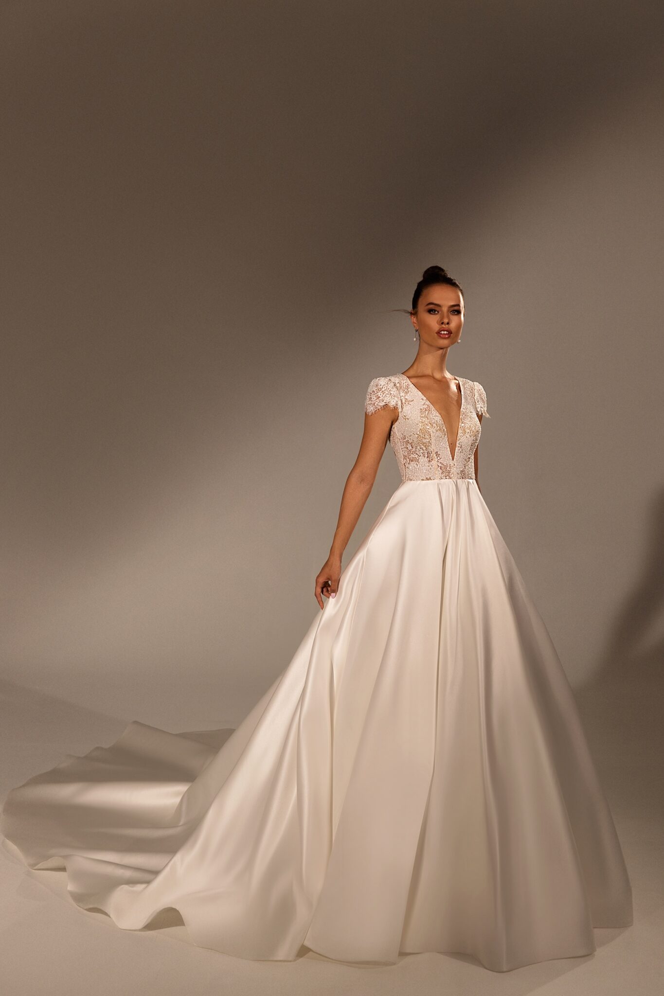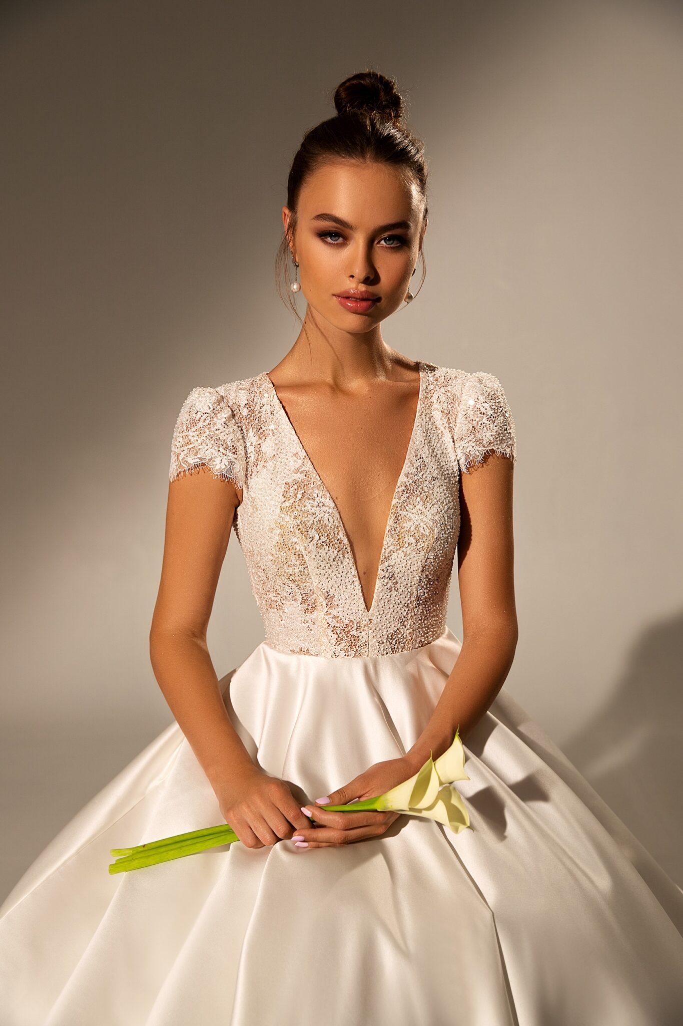 MuseA gorgeous wedding dress with a V-neckline is an absolute masterpiece. The top is made of lace and a long skirt is made in satin.