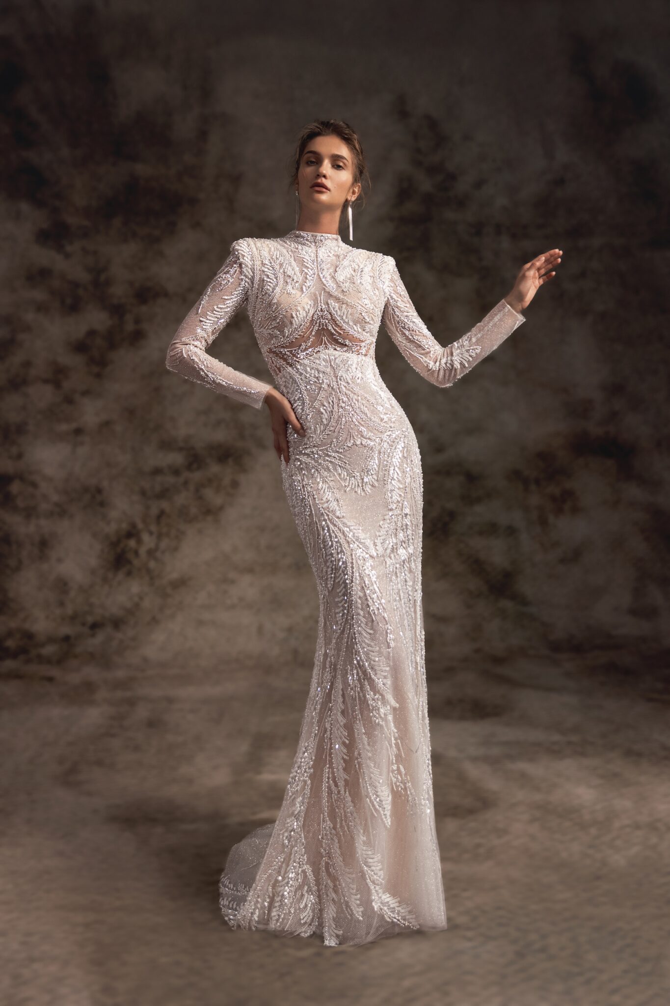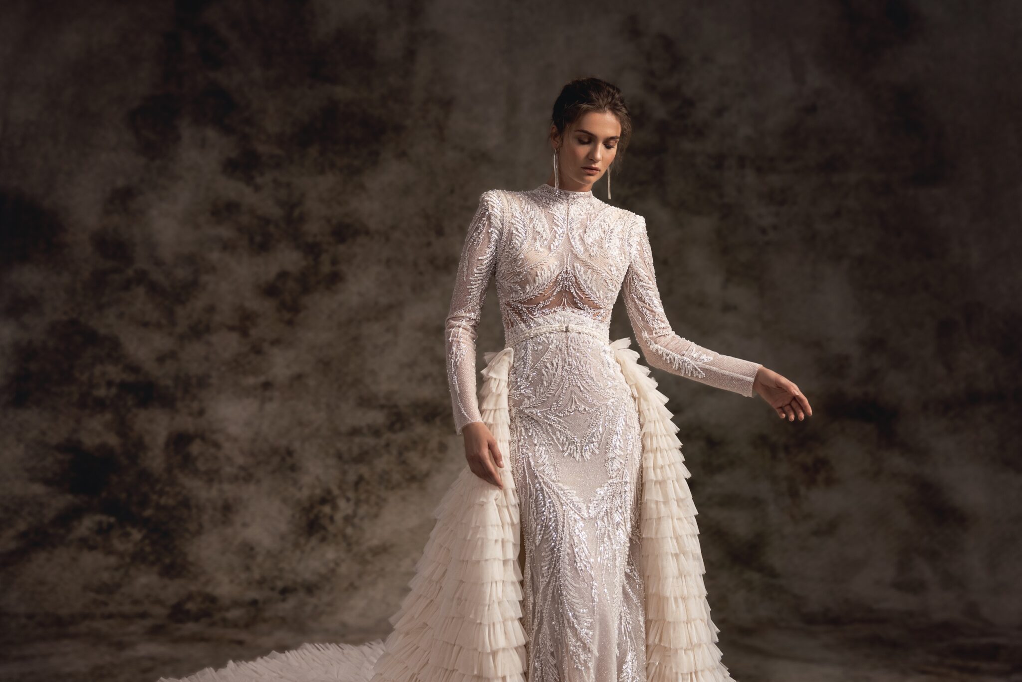Notte d'OperaA femininely structured mermaid gown adorned with delicate hand-embroidered lace and decorated with sheer nude side panels. A corset is embellished with high collar, long fitted sleeves and shoulder pads that add solemnity. A super-fitted trumpet skirt is as striking as it is sexy proceeding into a neat sweeping chapel train. For a more opulent look a dress can be accomplished with a detachable overskirt made of cascading rows of Tulle ruffles.