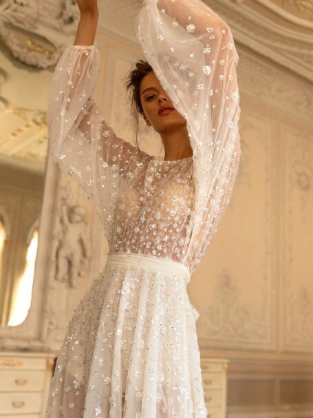 RomanceTender Irwin wedding gown is made of exquisite fabric with small dots. The dress is embellished with a V-shaped neckline and lowered shoulders. A large part of the dress is decorated with lace flowers. A bodice is embellished with cap sleeves that are made of veiling. The back of the dress has a fabulous neckline that is made of transparent fabric.