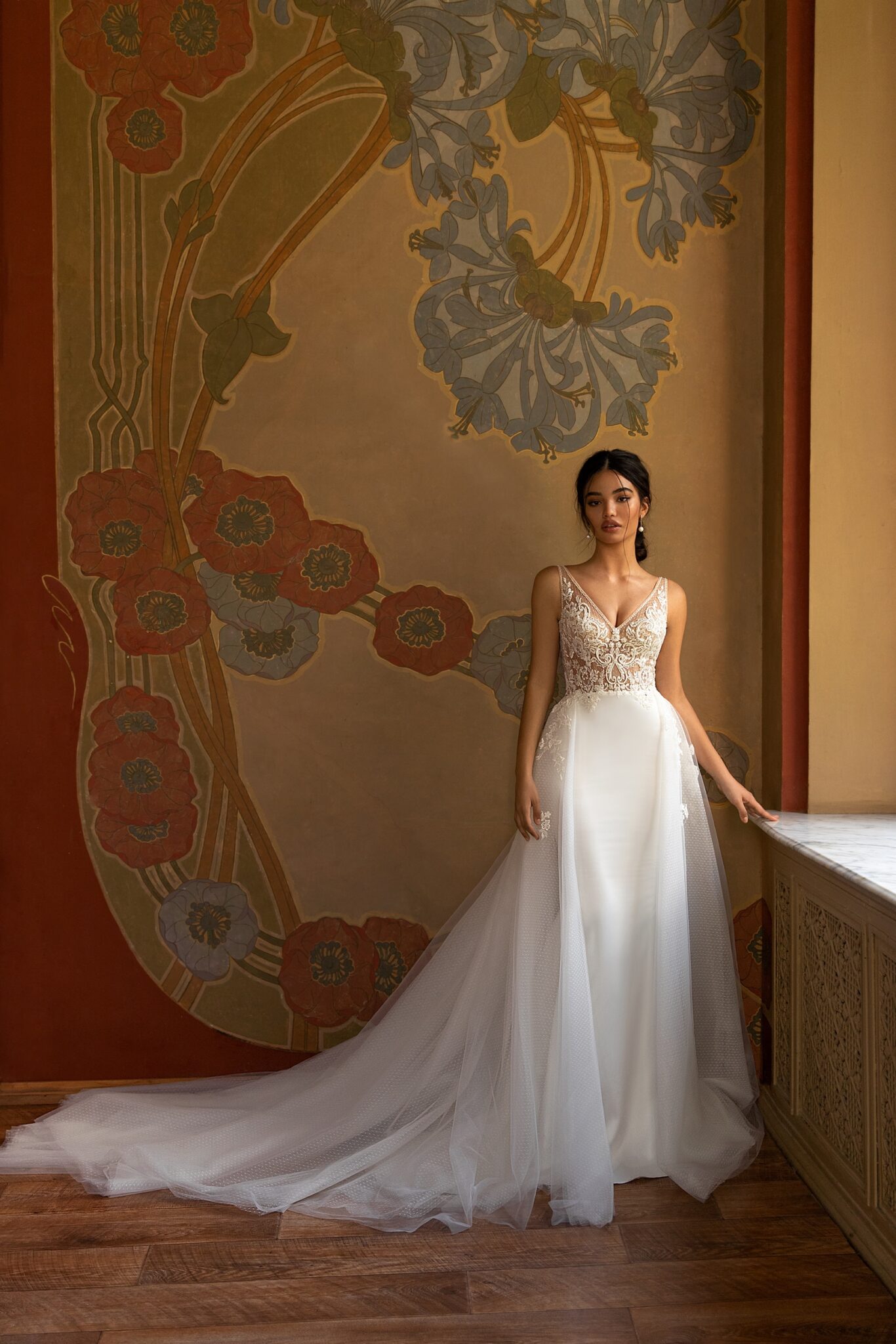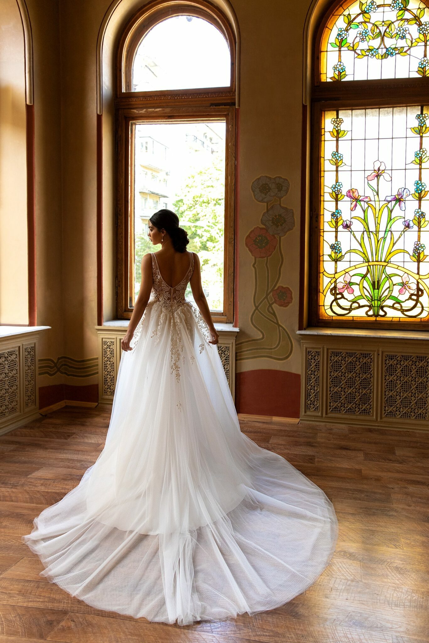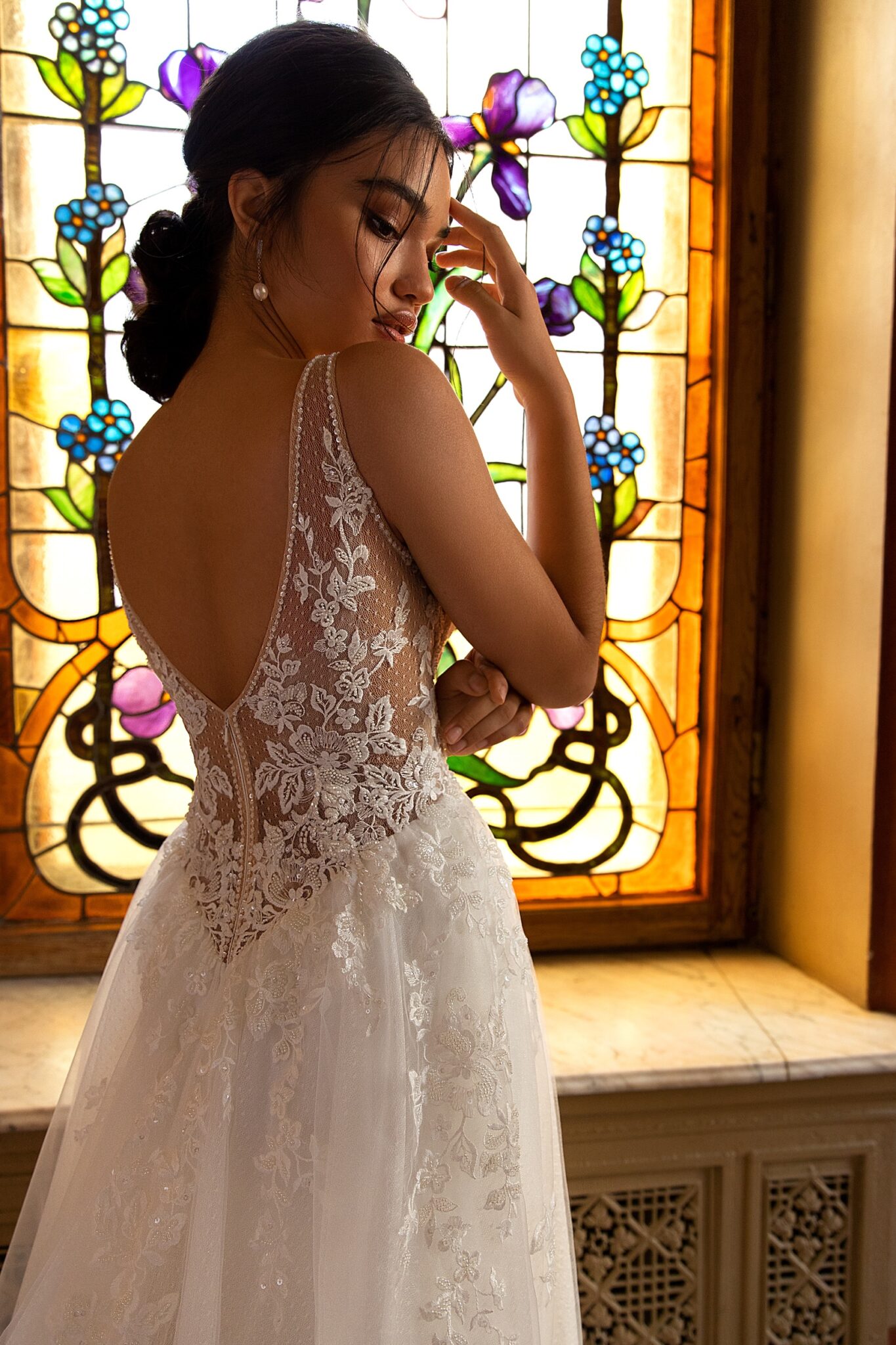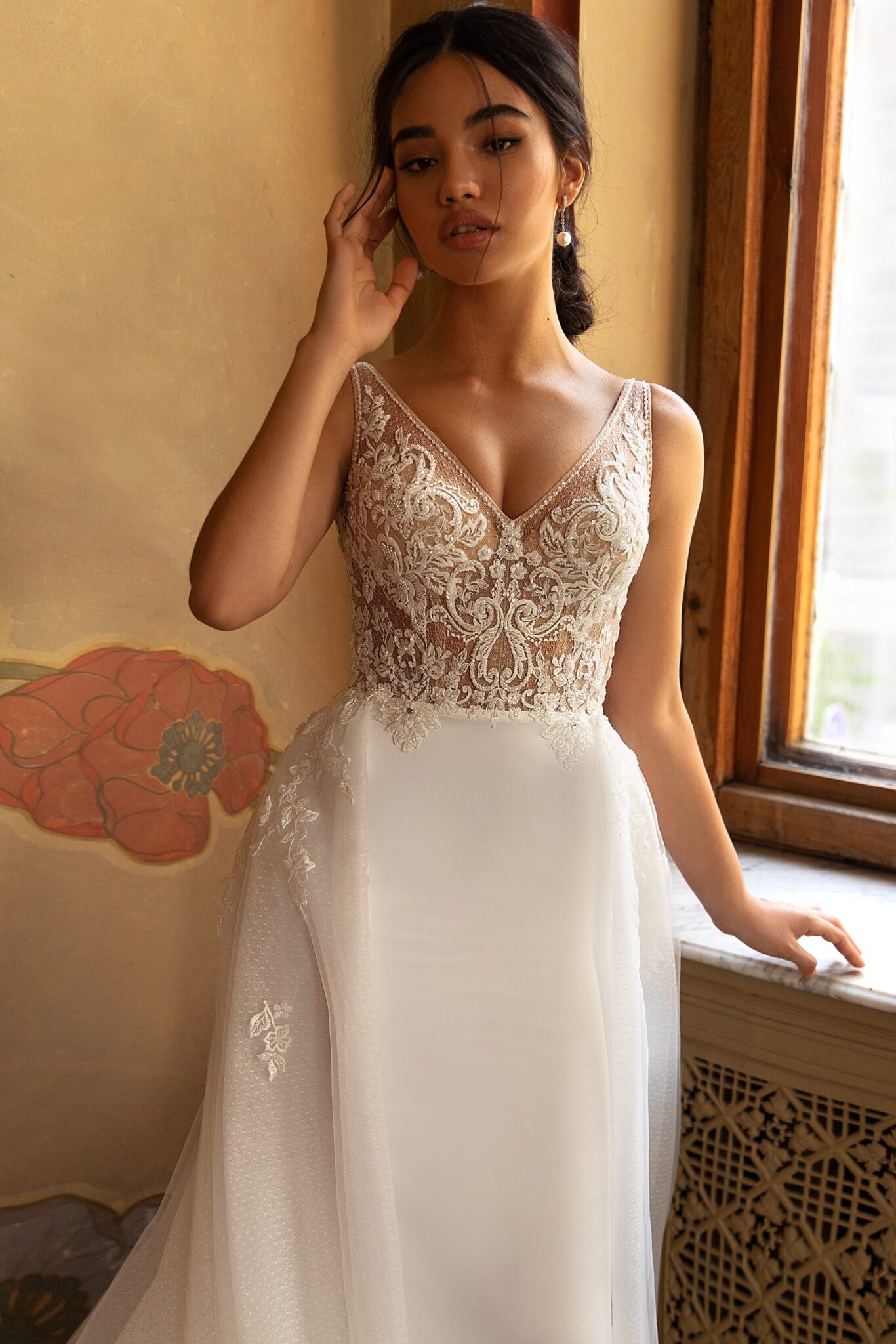 RomanceTender Irwin wedding gown is made of exquisite fabric with small dots. The dress is embellished with a V-shaped neckline and lowered shoulders. A large part of the dress is decorated with lace flowers. A bodice is embellished with cap sleeves that are made of veiling. The back of the dress has a fabulous neckline that is made of transparent fabric.