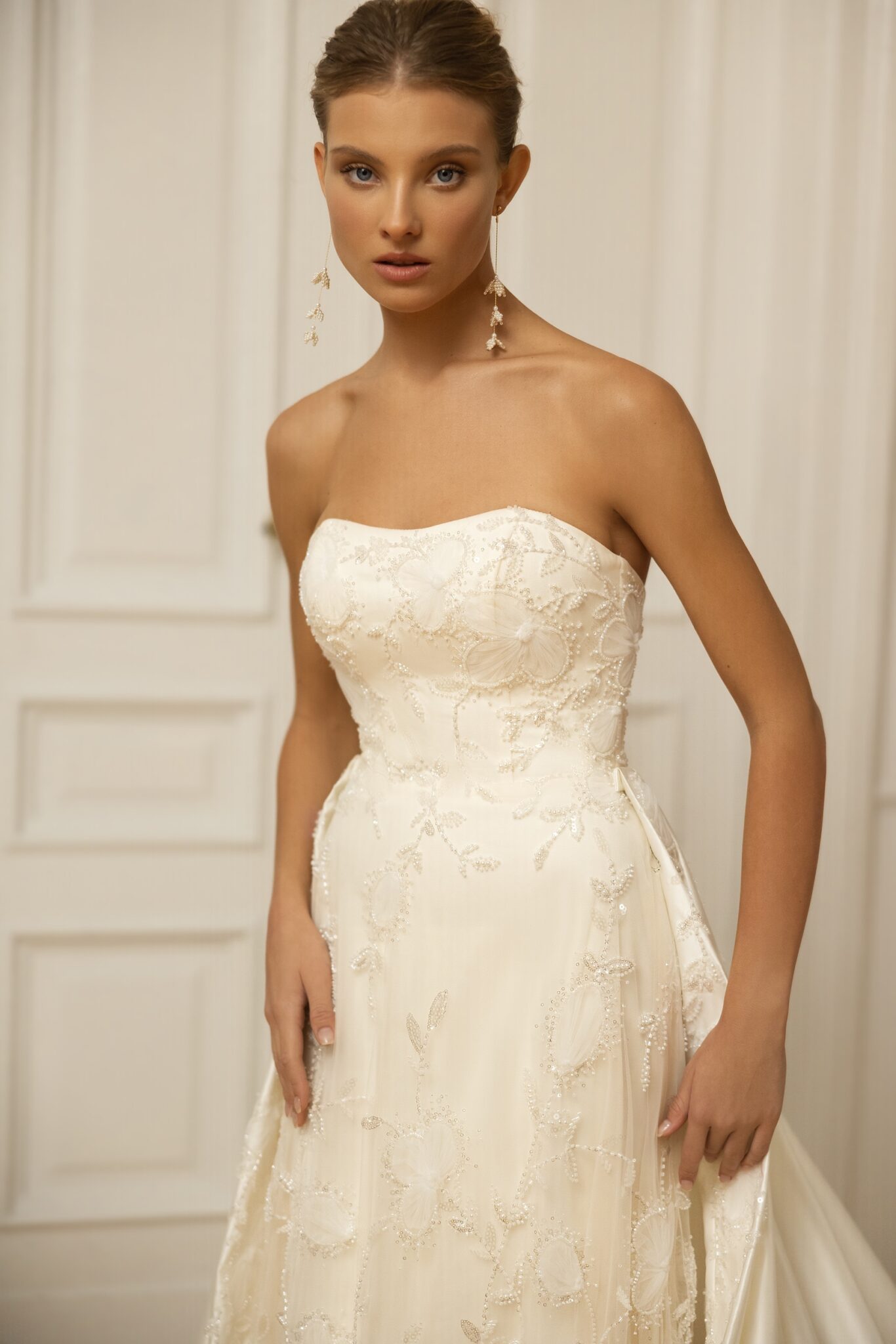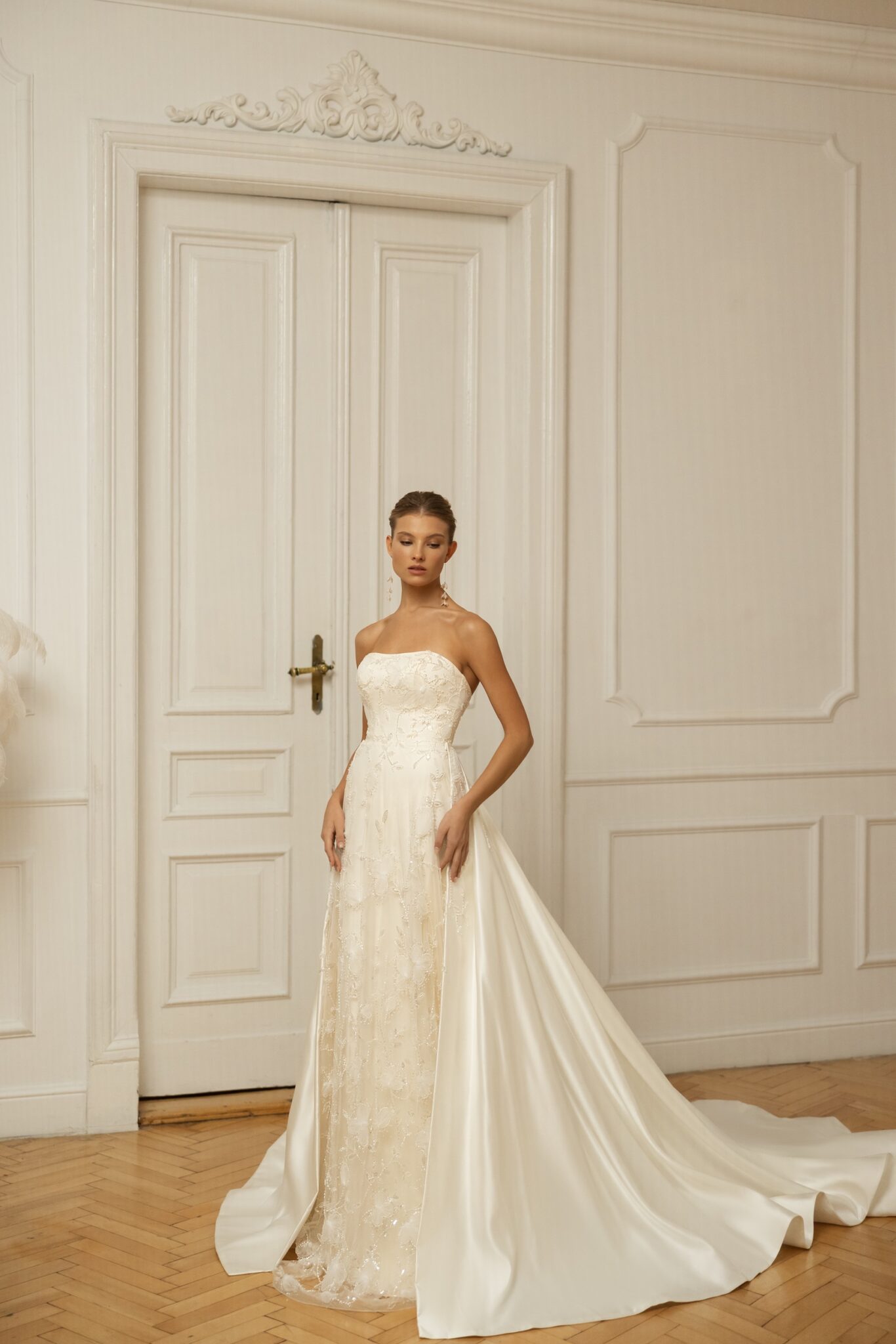 Less is more 2023Irresistible A-line silhouette of the Isola gown is enhanced with an intricate sequin-threaded allover lace pattern. The soft bodice with a Straight neckline in the front is decorated with the same fine floral lace. Tender flower lace with beads and transparent sequins gives a luxurious glow to the total look. A cathedral train elongates the silhouette finishing the gorgeous butter soft satin overskirt that is attached on the waistline