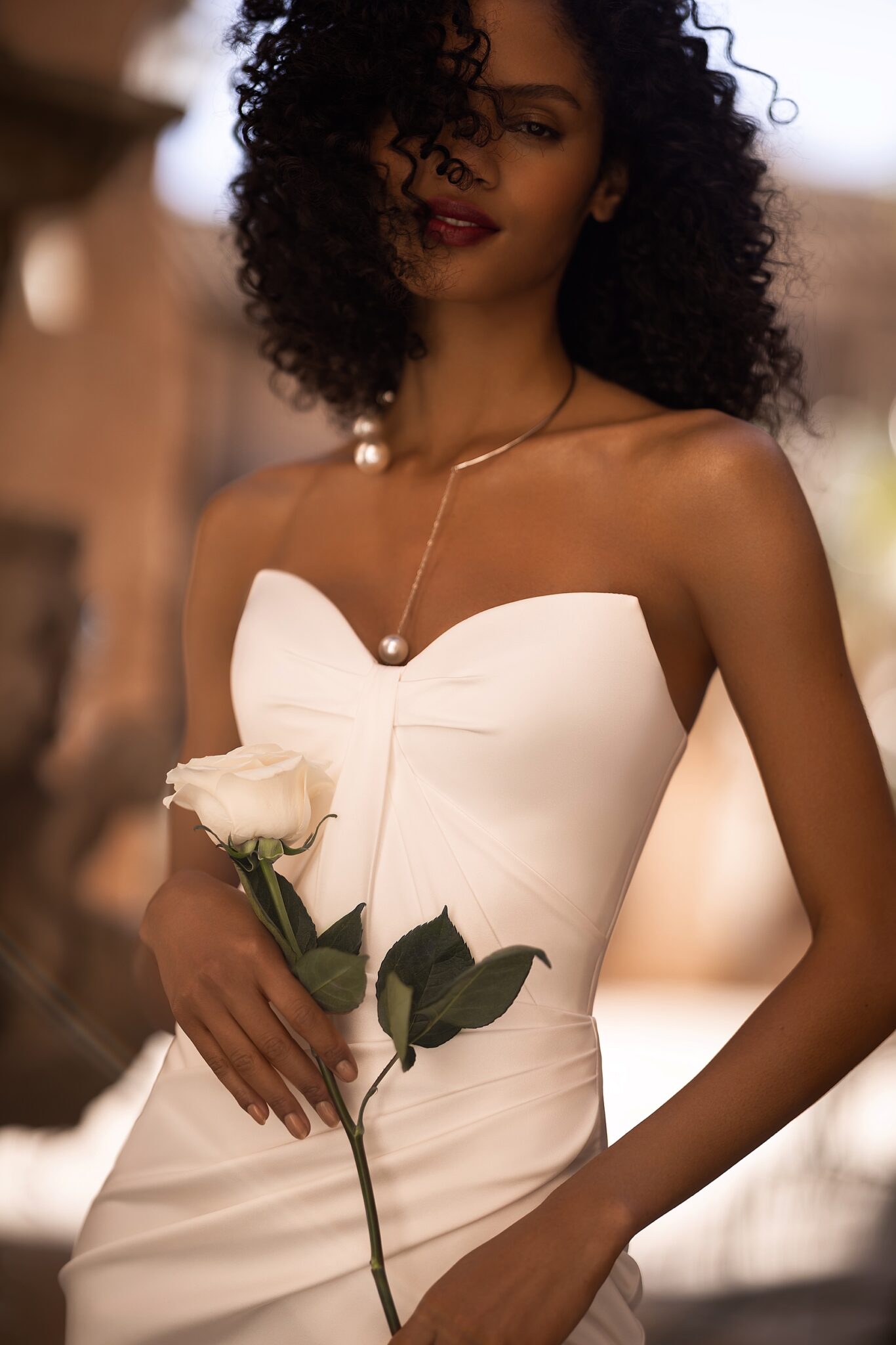 Alma de OroIntroducing our exquisite mermaid wedding dress, a stunning masterpiece of elegance and allure. Crafted from luxurious glossy fabric, it exudes a lustrous sheen that commands attention and captures the light with every movement. The corset is adorned with graceful draping, creating a sense of fluidity and adding a touch of sophistication to the dress. The sweetheart neckline enhances your natural beauty, framing your décolletage with timeless charm. The wrap skirt, with its high slit, adds a daring element to the design, revealing just the right amount of leg and allowing for graceful and confident strides. As you walk down the aisle, the mermaid silhouette hugs your curves, creating a captivating and alluring silhouette that exudes confidence and grace.