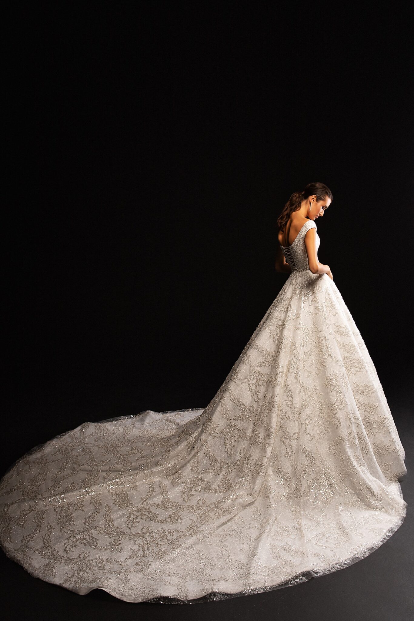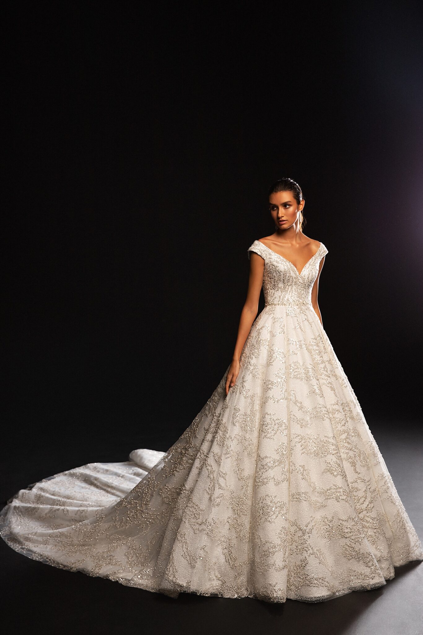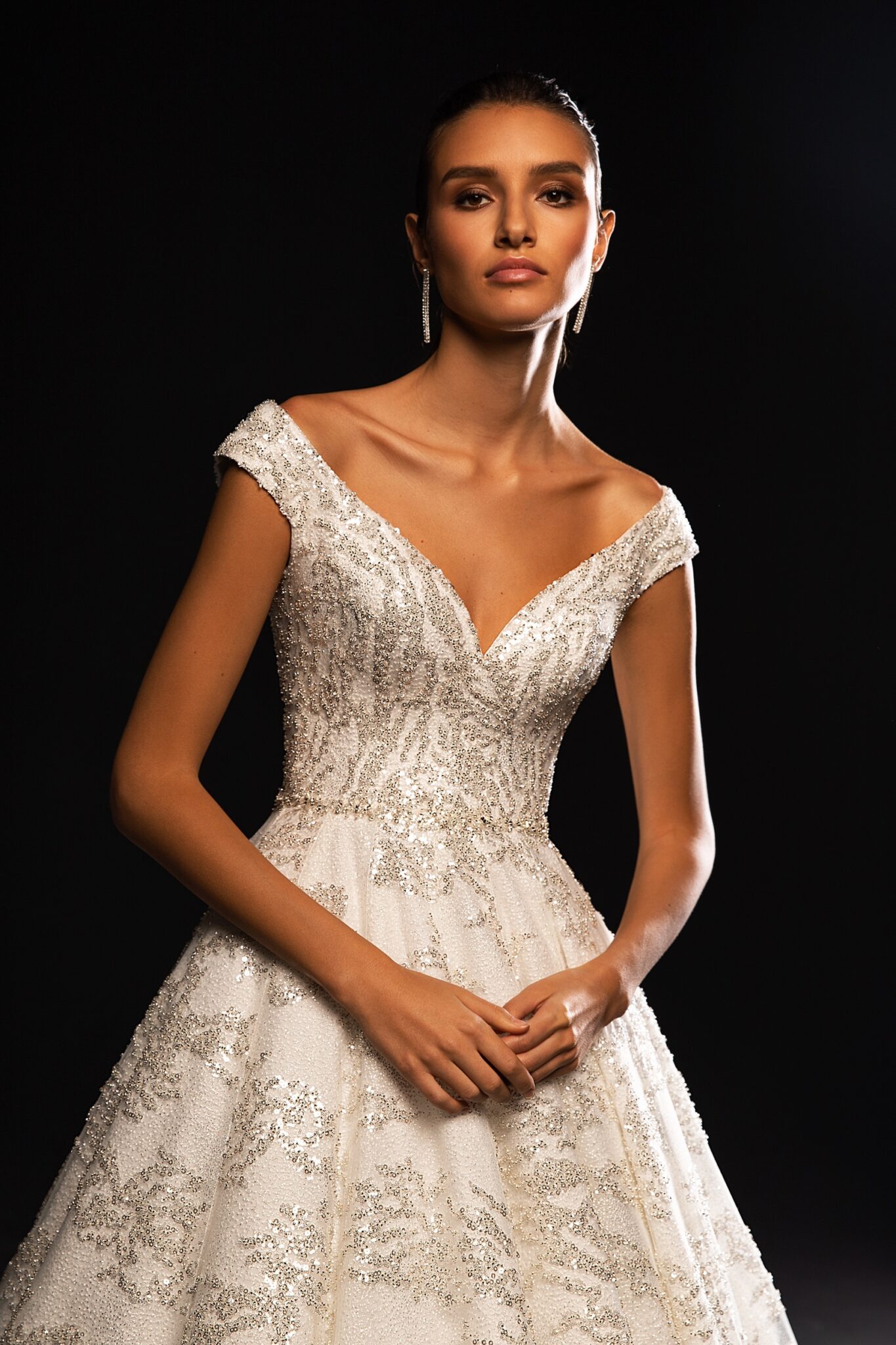 StardustLight and airy wedding dress with a lace top. This top is entirely embroidered with small crystals, beads, and pearls. This A-line wedding gown is made of shining fabric.