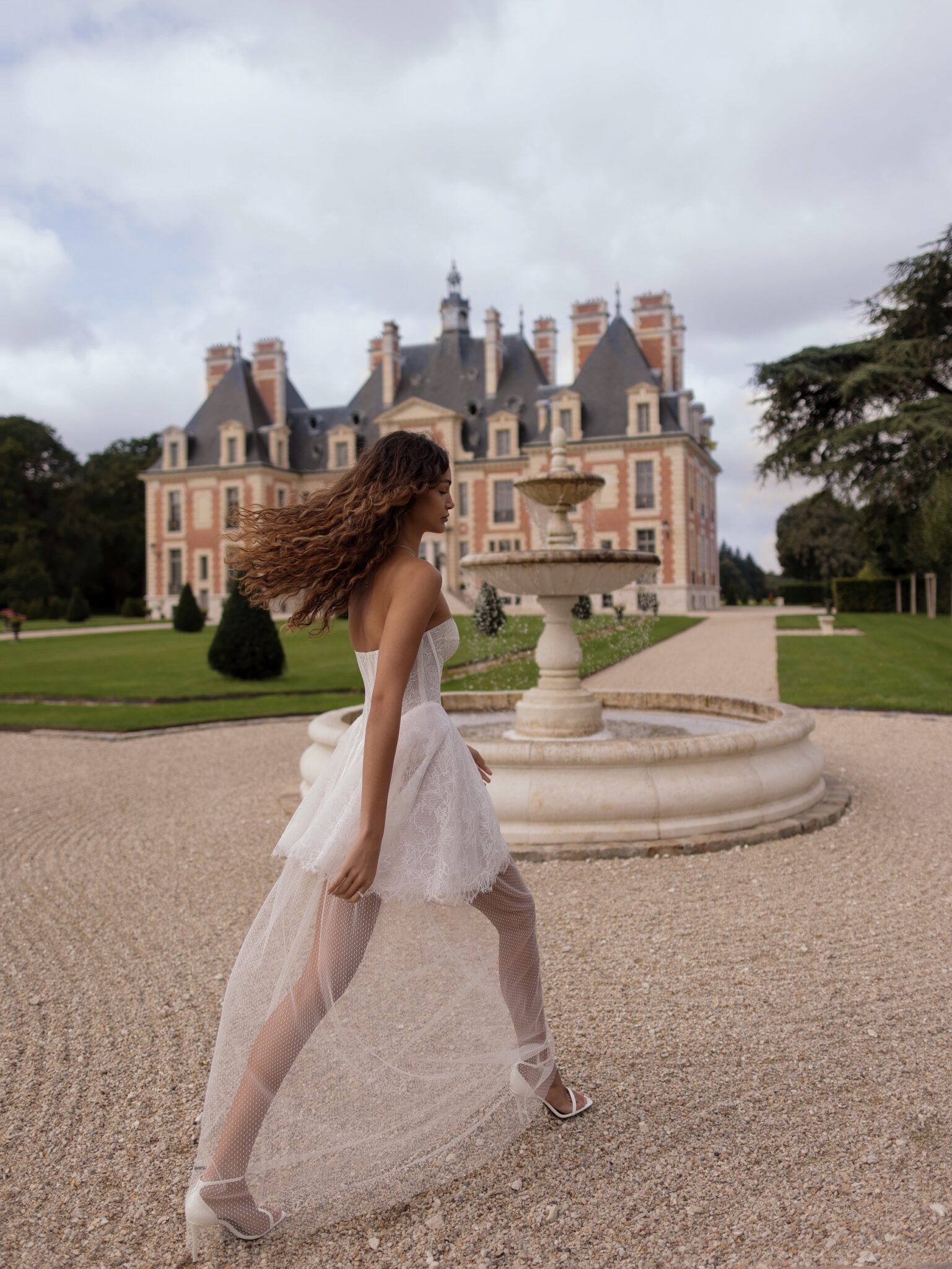 White SwanDelicate mini dress with an additional mesh maxi under-skirt. The bodice features a plunging neckline and is adorned with layered lace fabric. The voluminous skirt, slightly pleated on the sides, gives the design a playful air.