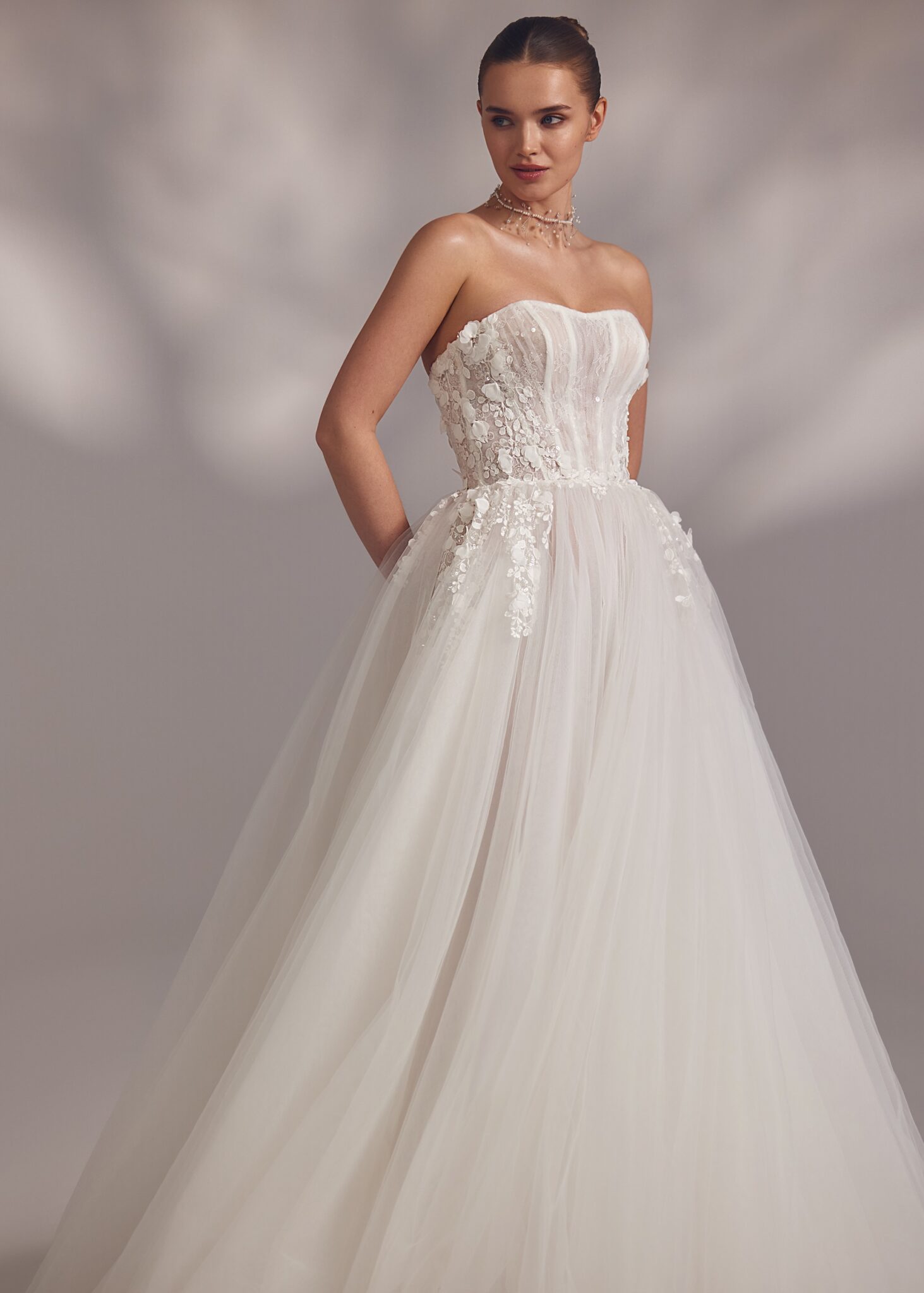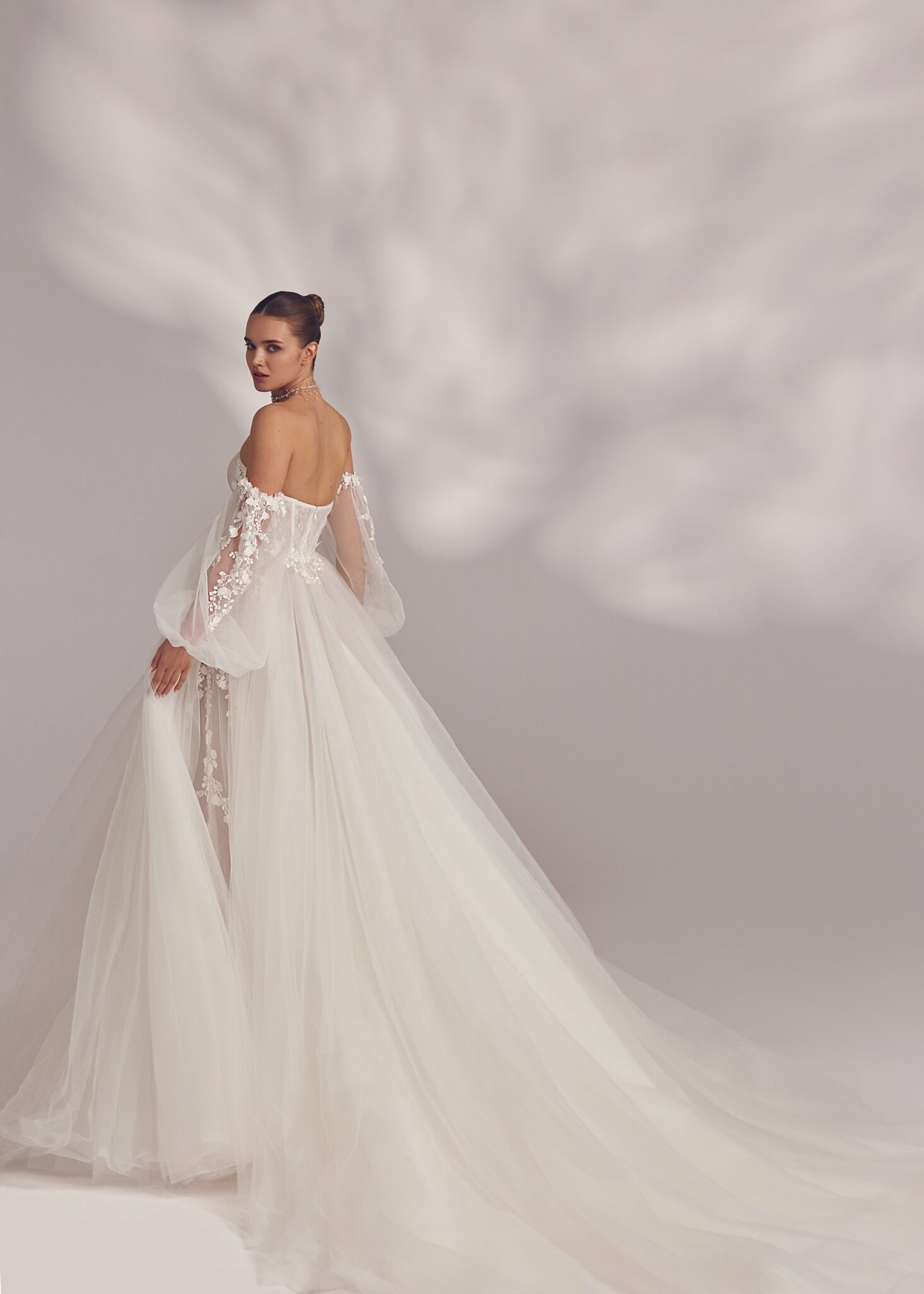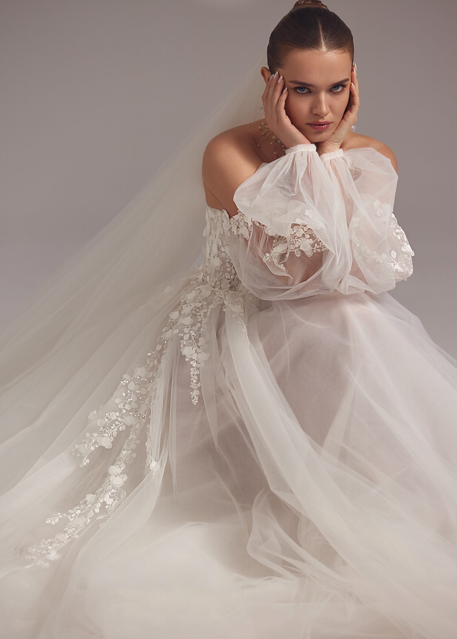 Less is More IVJoelle – heart-shaped strapless detailed corset dress featuring cold-shoulder bouffant sleeves with floral embroidery in the upper part, more embroidery descends from the waistline to the sides of the voluminous tuille gown. Complemented by a simple veil.