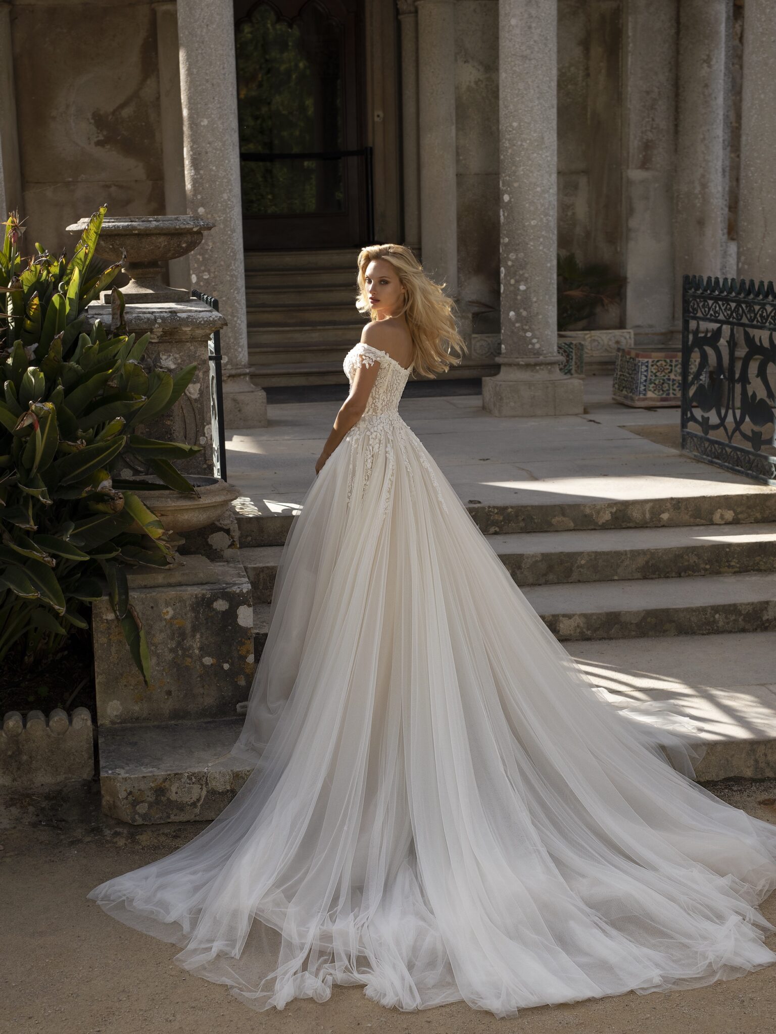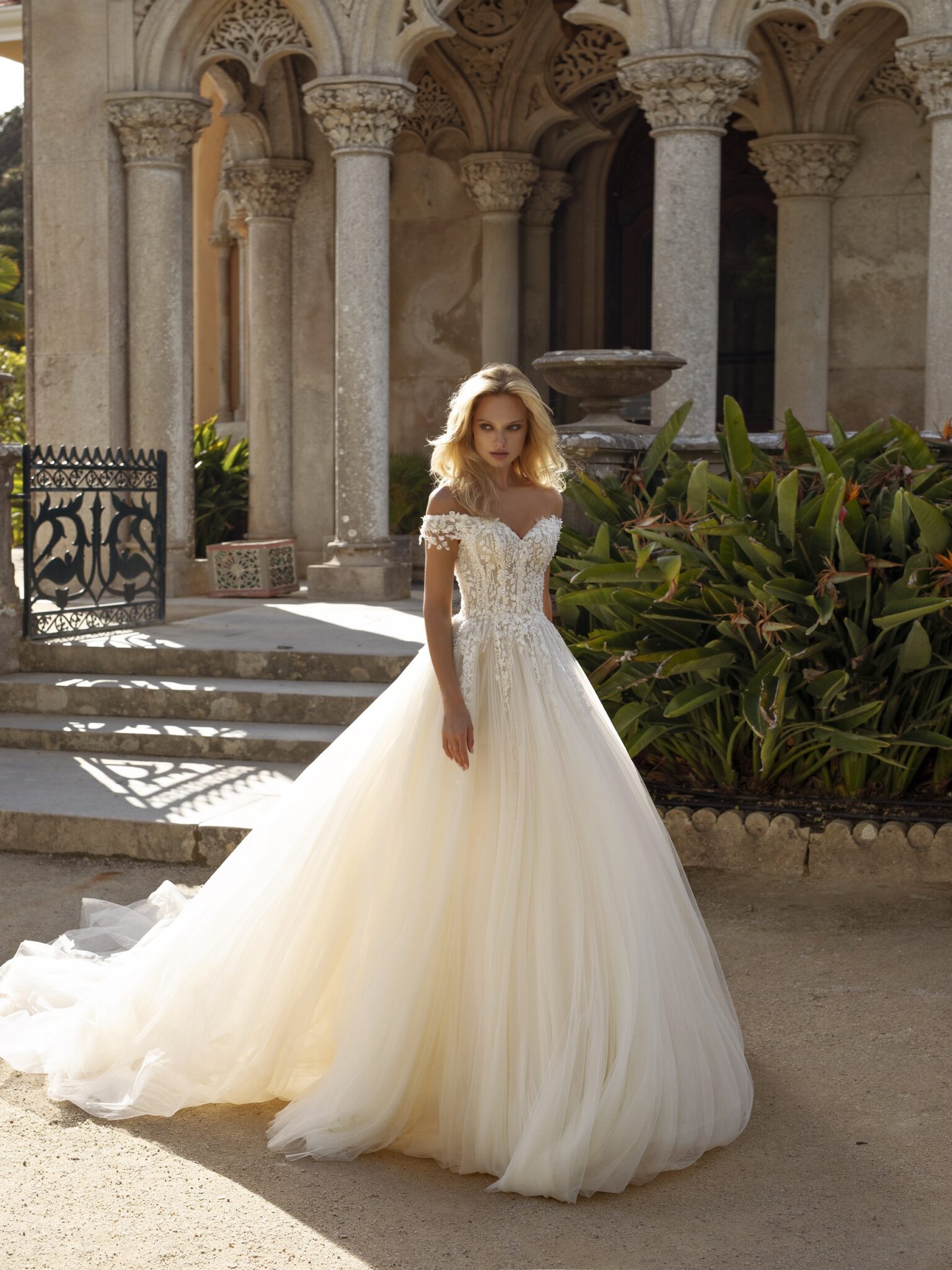 Lisbon Vibes, Plus SizeJolie bridal gown is a fantastic combination of lace and veiling. A corsage with lowered shoulders is entirely decorated with small lace flowers that highlight a waistline. A loose skirt that is made of veiling creates a laconic silhouette.