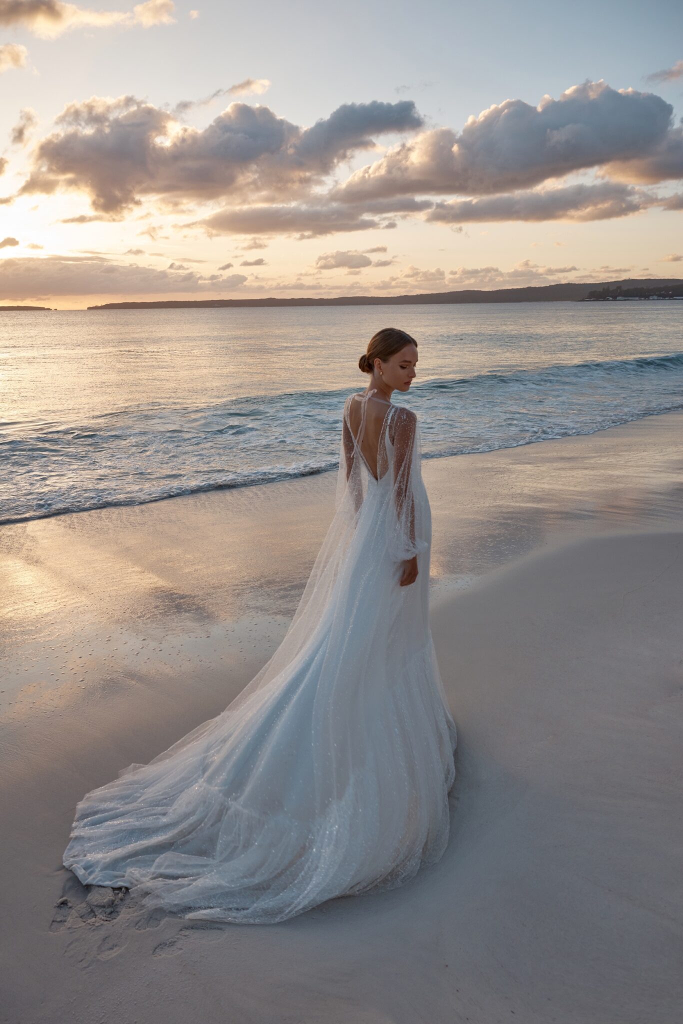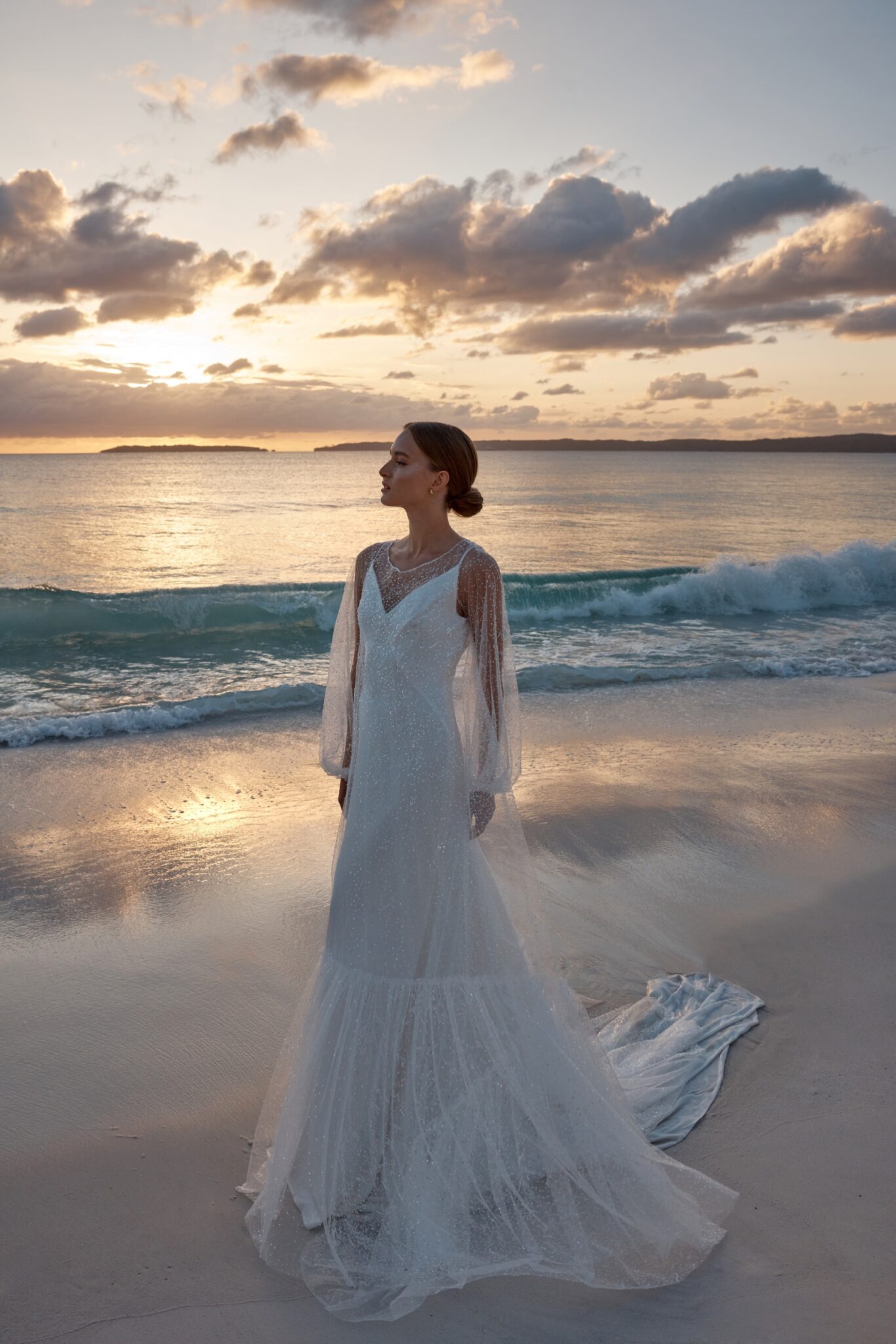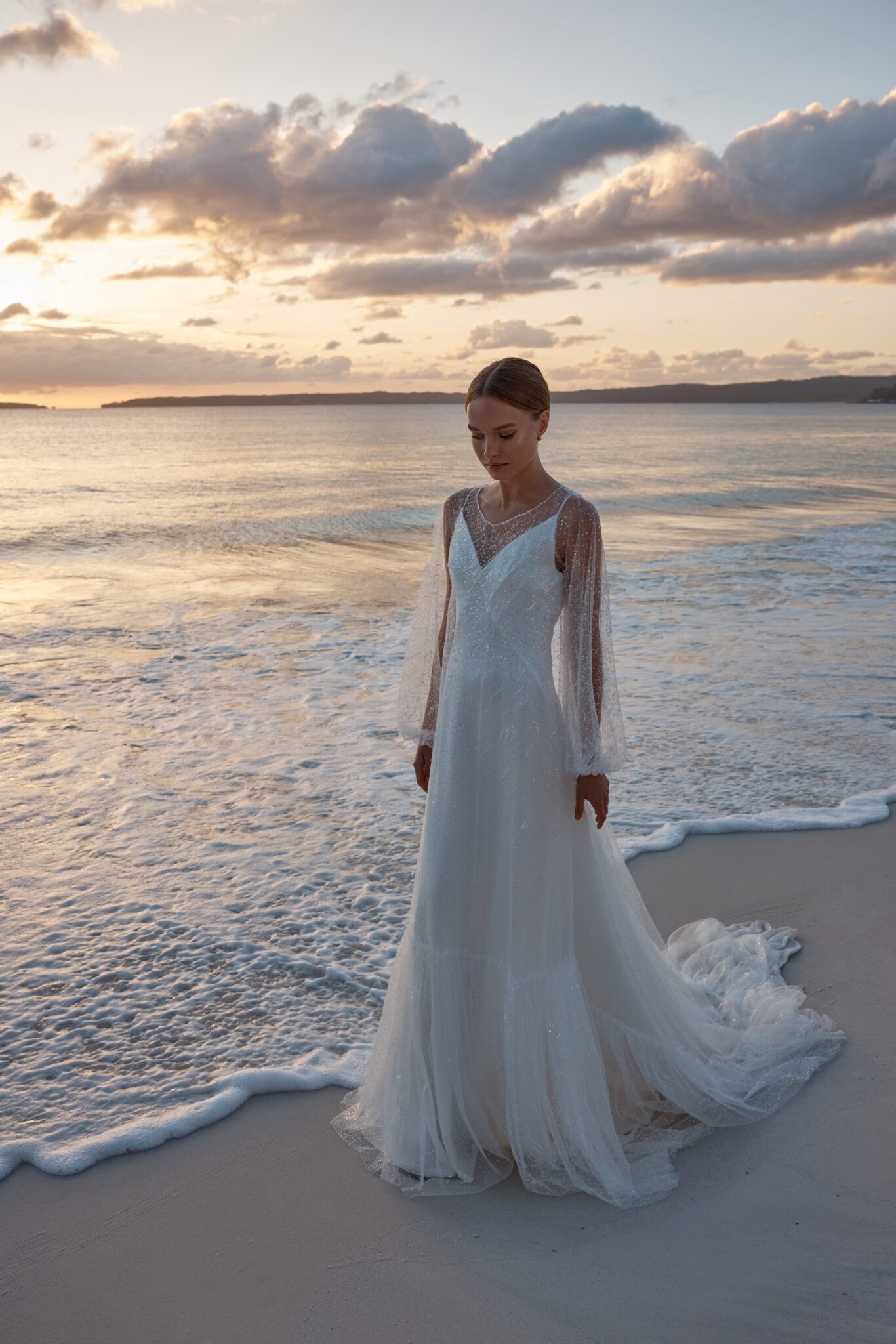 Atelier signature editionThis exceptional sheath wedding dress is a work of art, comprised of two elegant pieces. The simple, on-straps dress exudes modern sophistication, while the transparent shimmer cape adds an air of enchantment. Its voluminous sleeves lend a touch of drama, making it a perfect choice for the bride who desires a truly unique and unforgettable look.