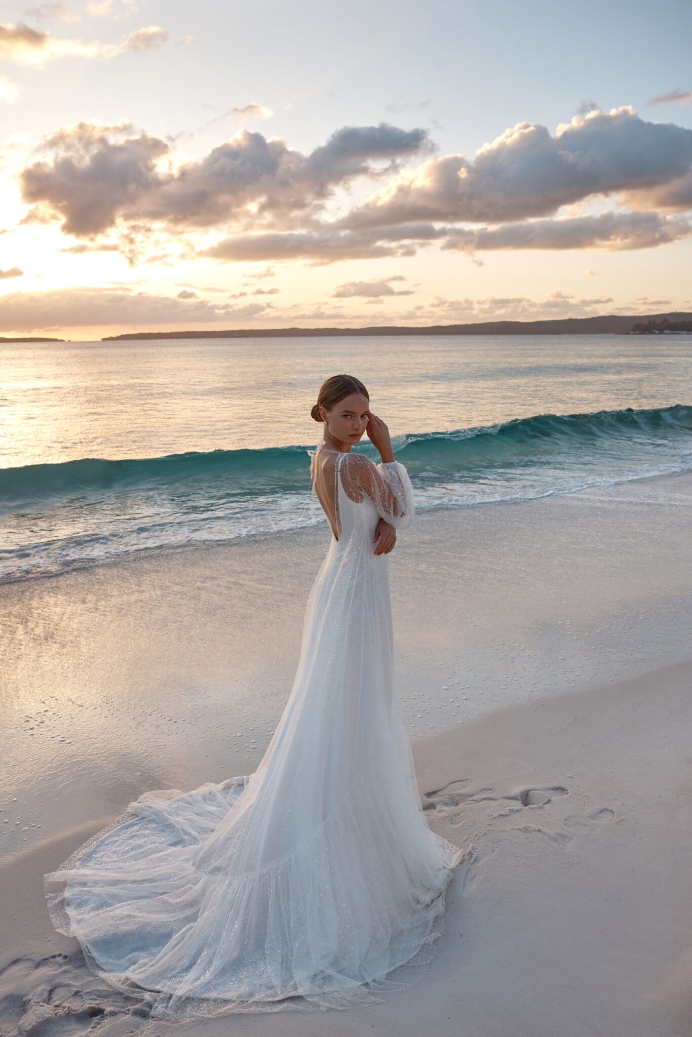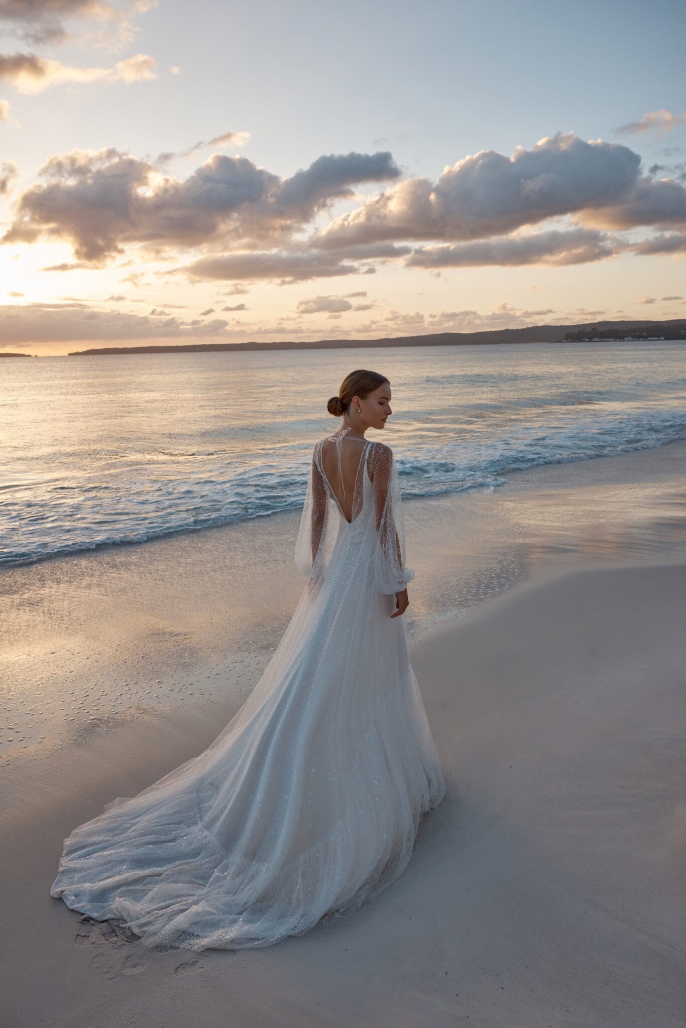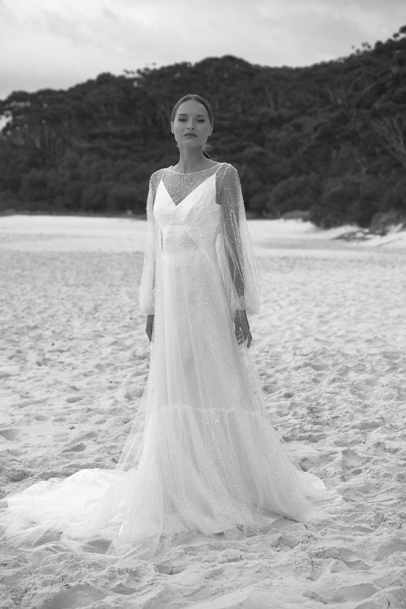 Atelier signature editionThis exceptional sheath wedding dress is a work of art, comprised of two elegant pieces. The simple, on-straps dress exudes modern sophistication, while the transparent shimmer cape adds an air of enchantment. Its voluminous sleeves lend a touch of drama, making it a perfect choice for the bride who desires a truly unique and unforgettable look.