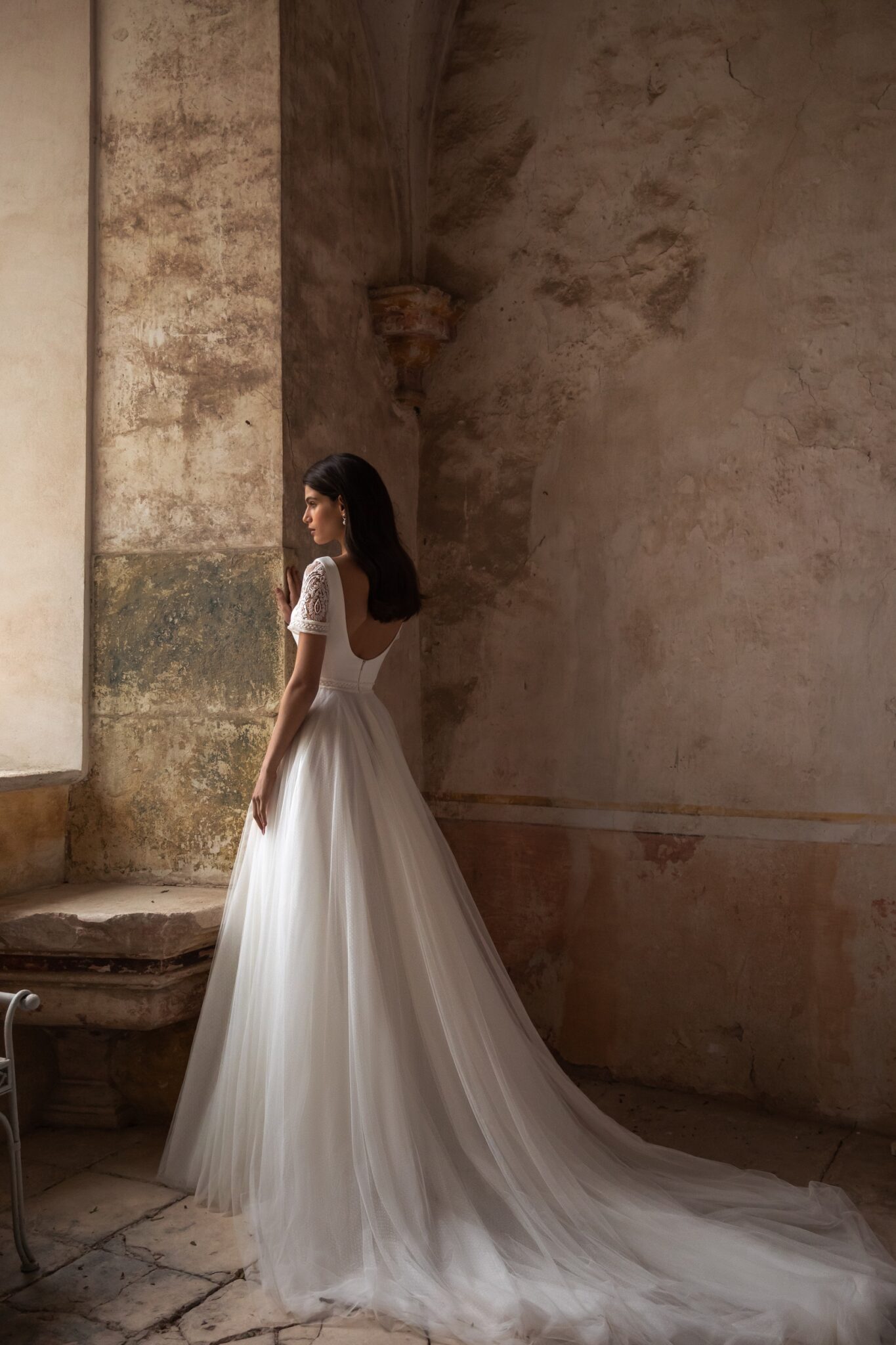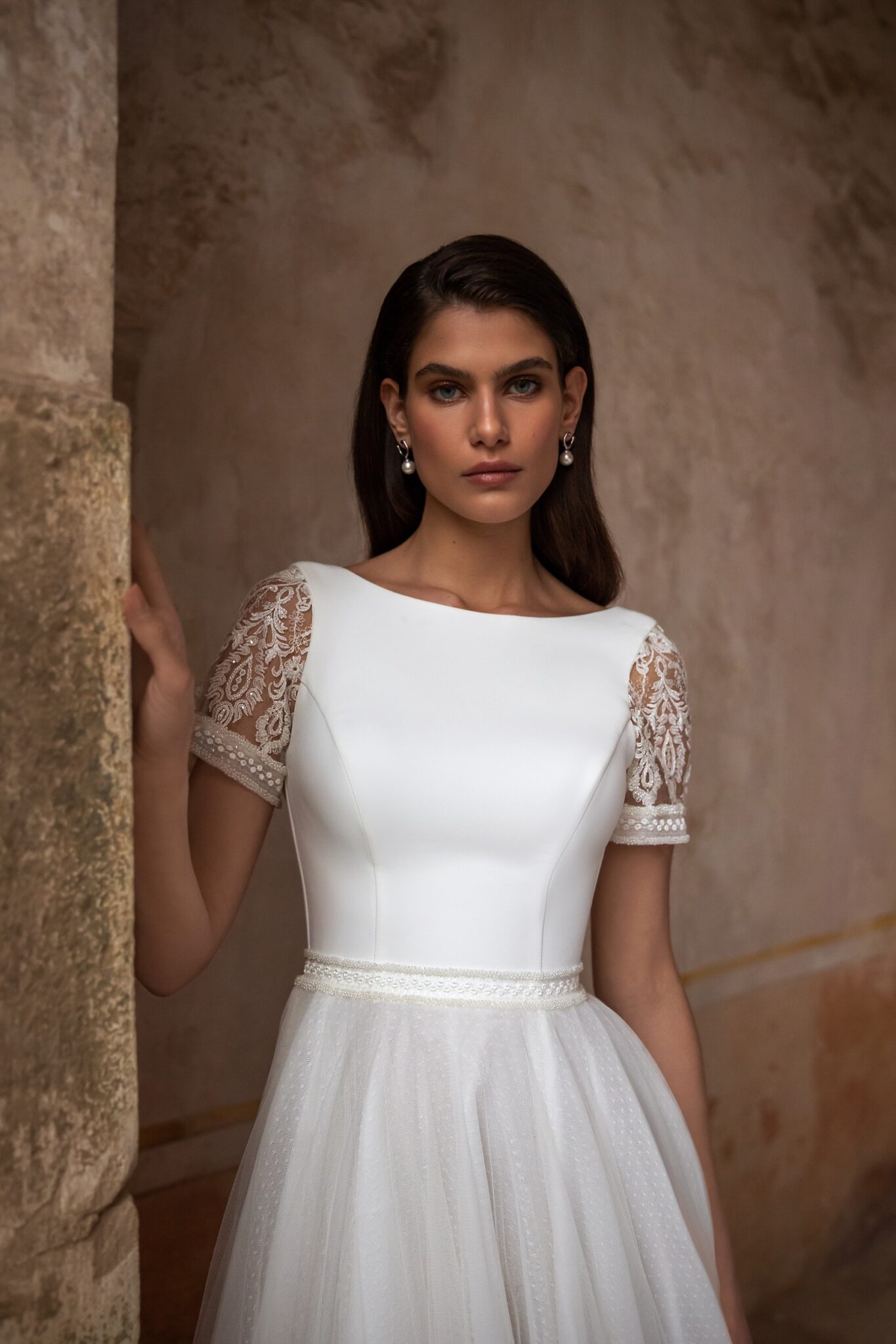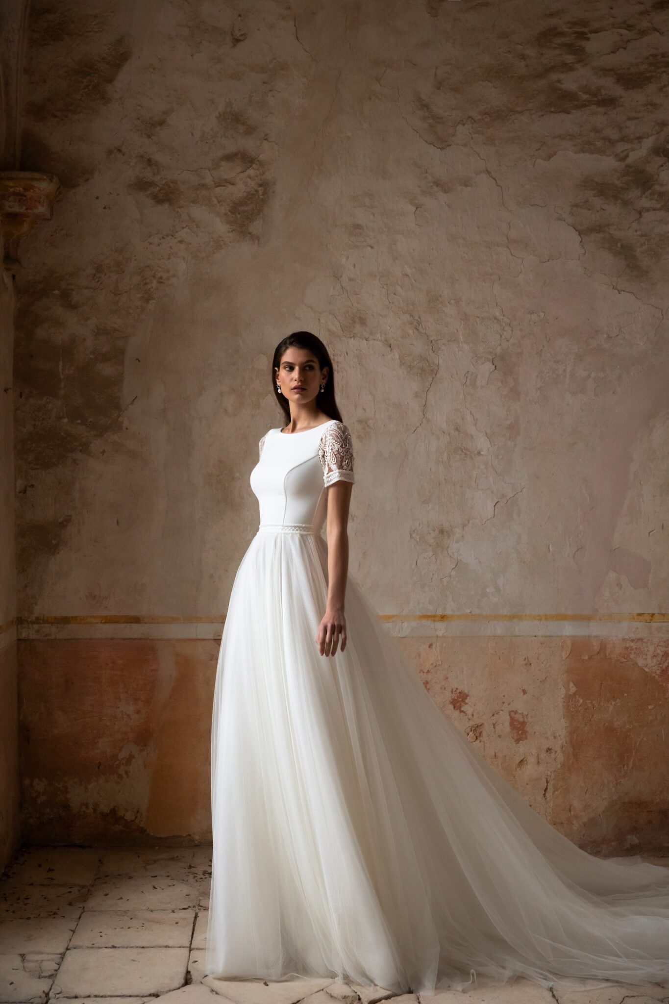 Made 4 LovePretty classic and elegant wedding dress of sophisticated silhouette. Feminine low-back corset with chic Boat neckline features short sleeves made of spectacular embroidered lace and elegant sparkling waistbelt that highlights the figure. Clean, creamy Tulle princess skirt features a gorgeous chapel train in butter soft Tulle.