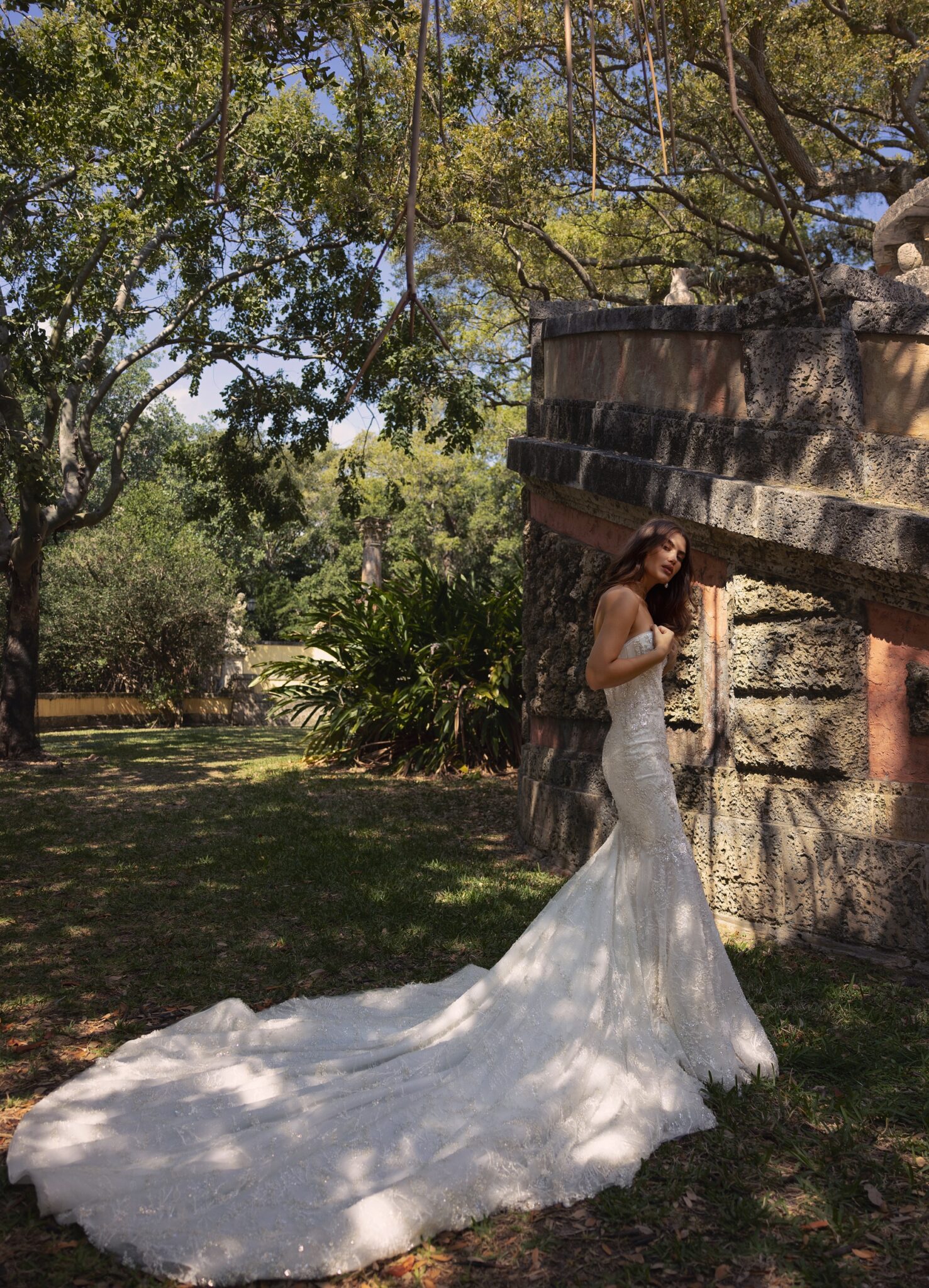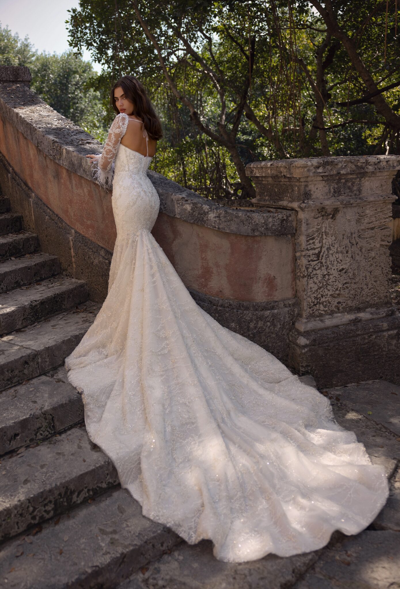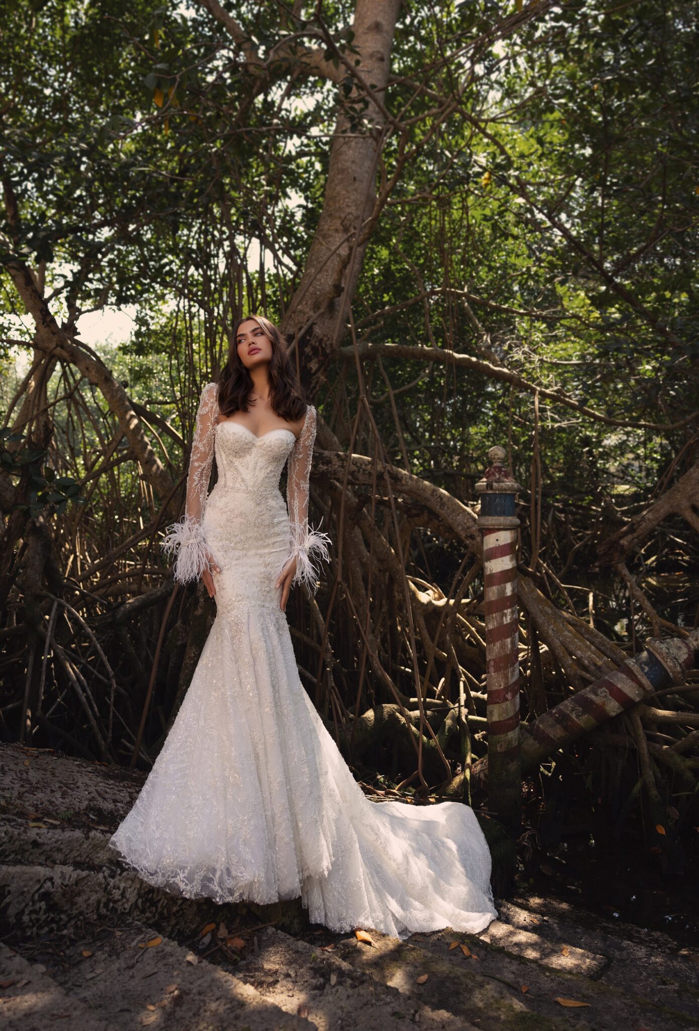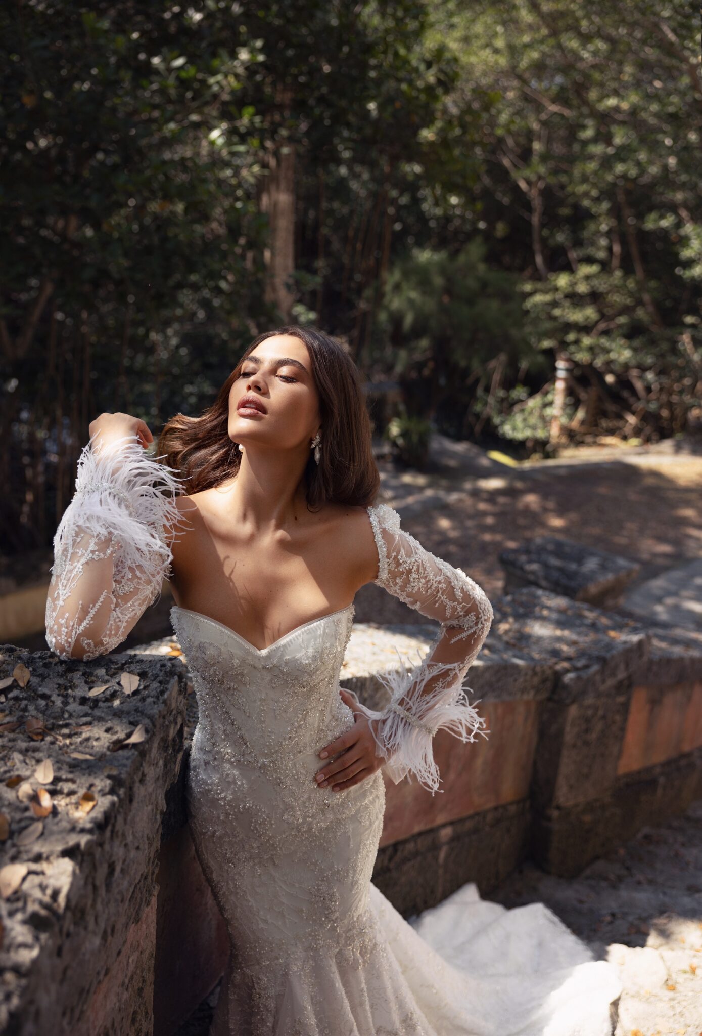 Miami Bliss, Plus SizeStep into your fairytale wedding with this luxurious lace mermaid dress. The corseted bodice, completed with a sweetheart neckline, accentuates your figure and exudes sophistication. The intricate lace detailing creates a timeless and elegant look, while the feathered bolero with long sleeves adds a touch of whimsy and romance. The mermaid skirt hugs your curves and flares out into a breathtaking train, ensuring all eyes are on you. This dress is the perfect choice for the bride who wants to feel both glamorous and playful, and create a memorable impression on her special day.