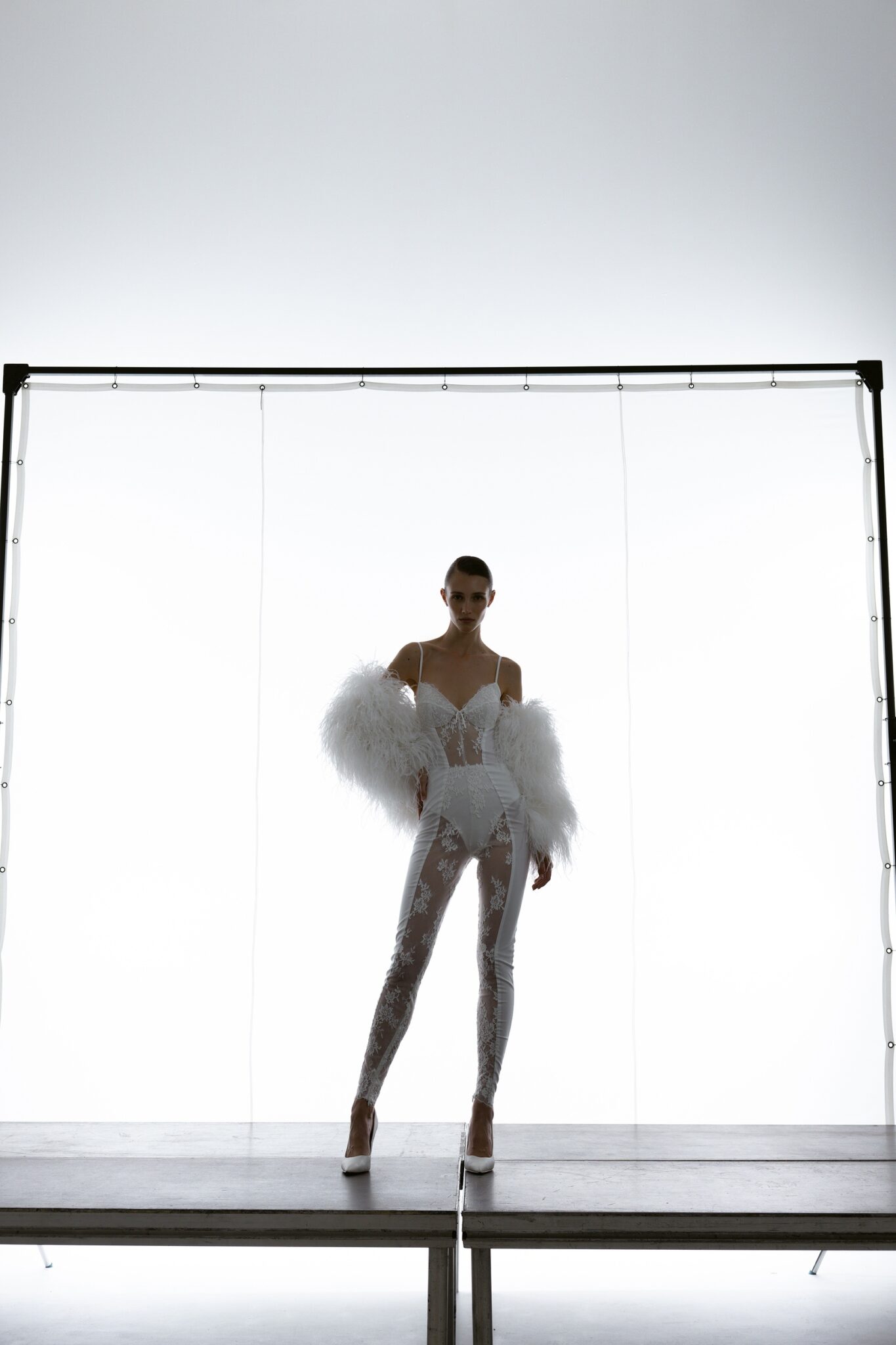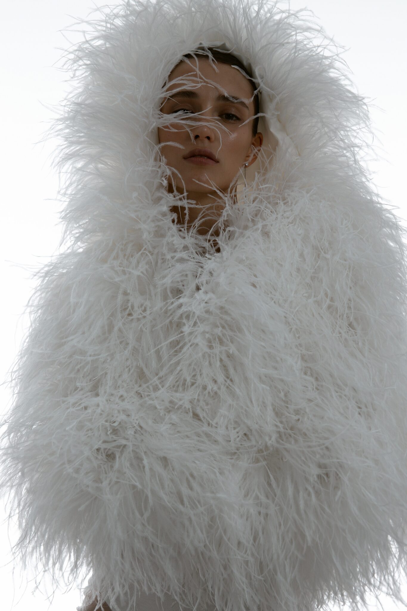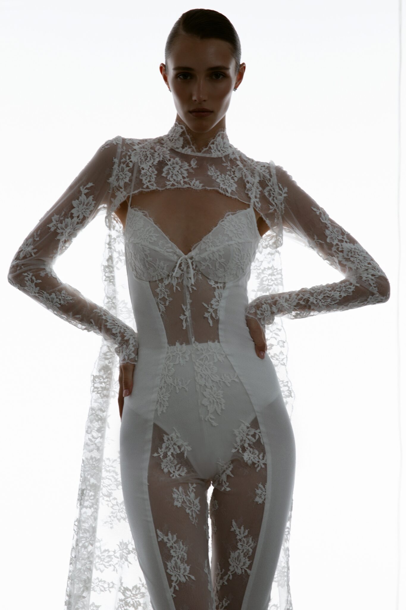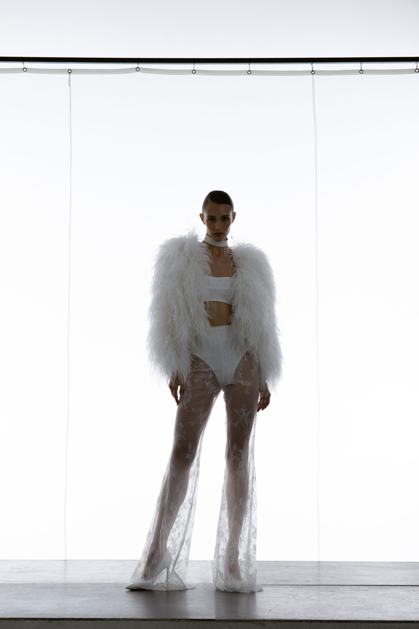 Special EditionA daring design for those who wish to stand out. This sheer jumpsuit, embellished with floral embroidery, features a cut-out turtle neck and long sleeves. A translucent overskirt with a ruched train adds a dramatic flair, completed with a feathered hooded bolero.