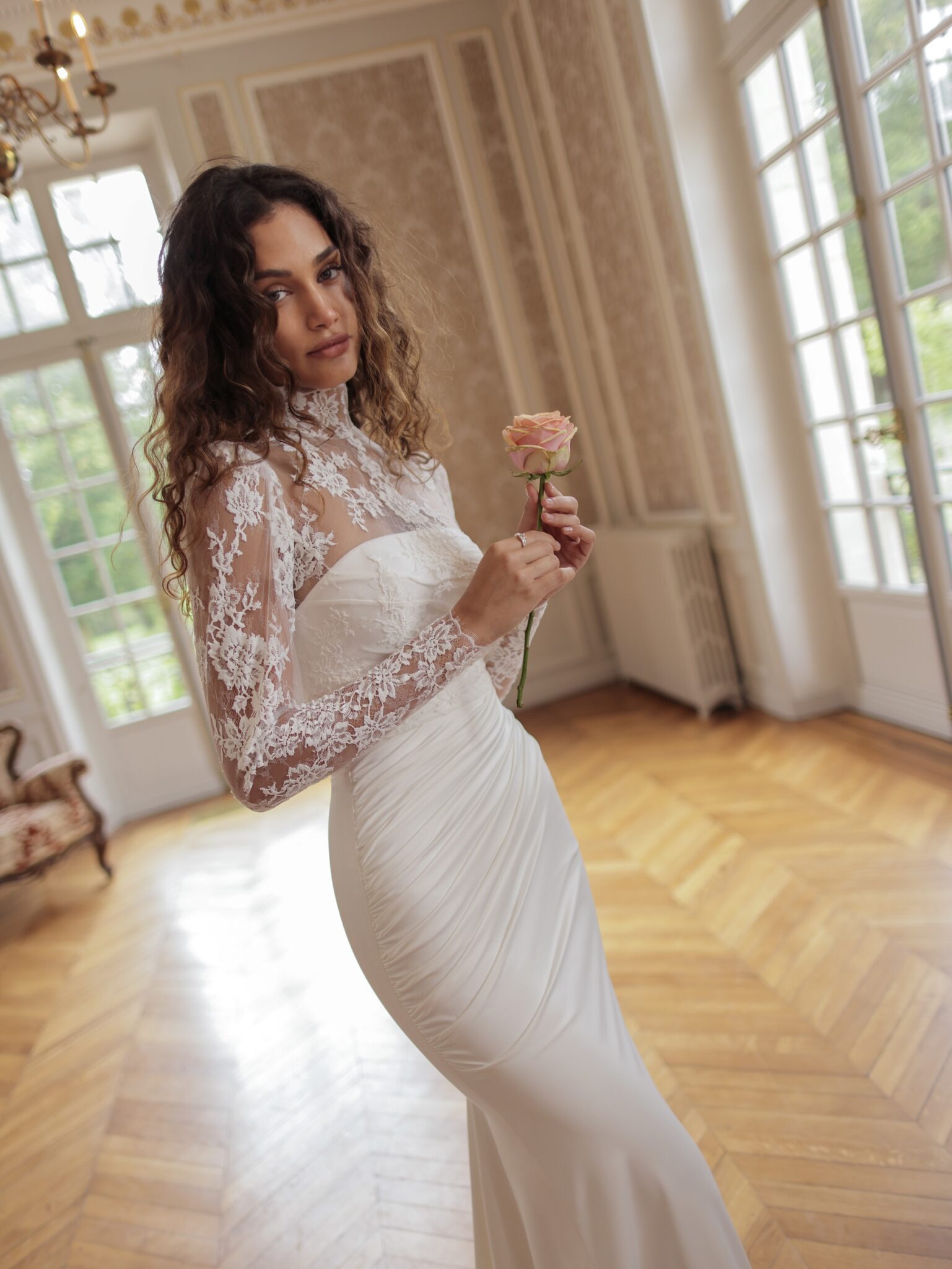 White SwanSilky trumpet gown with a wrapped mesh overlay creating soft drapes around the bodice and waist and texturising the silhouette. adds a touch of timeless sophistication.