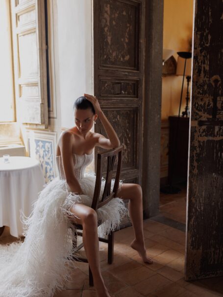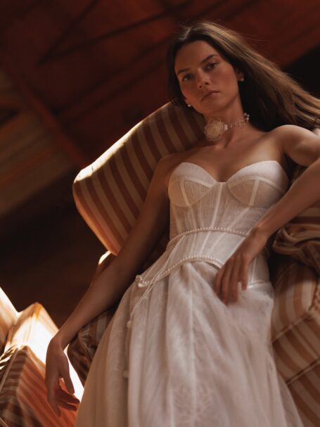 L'UnicoDetailed long sleeve top with high round neck and rich beaded embroidery all over the dress. The hips are decorated with ruched mildly sparkling details. The trail is elongated and ruched on the bottom.