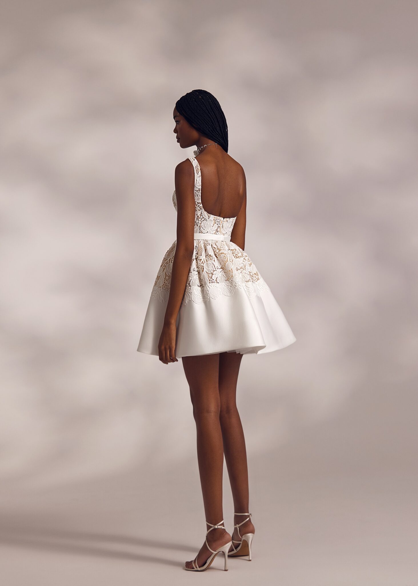 Less is More IVKristi mini – florentine neckline dress with guipure top highlighted by natural waistline and descending guipure basque followed by the smooth flared above-the-knee skirt. The cut out mid-depth back adds lightness to the outfit.
