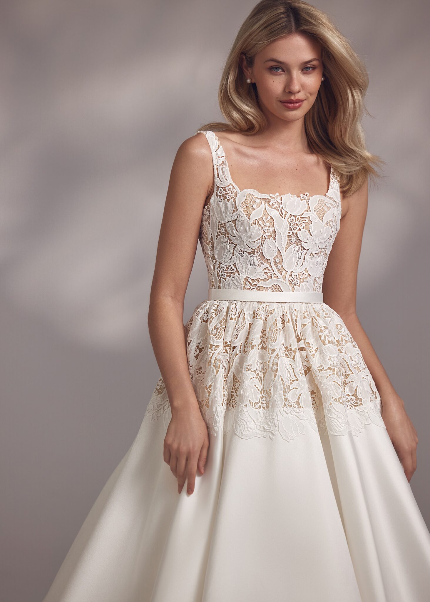Less is More IVKirsti – florentine neckline dress with guipure top highlighted by natural waistline and descending guipure basque followed by the smooth voluminous skirt. The cut out mid-depth back adds lightness to the outfit.