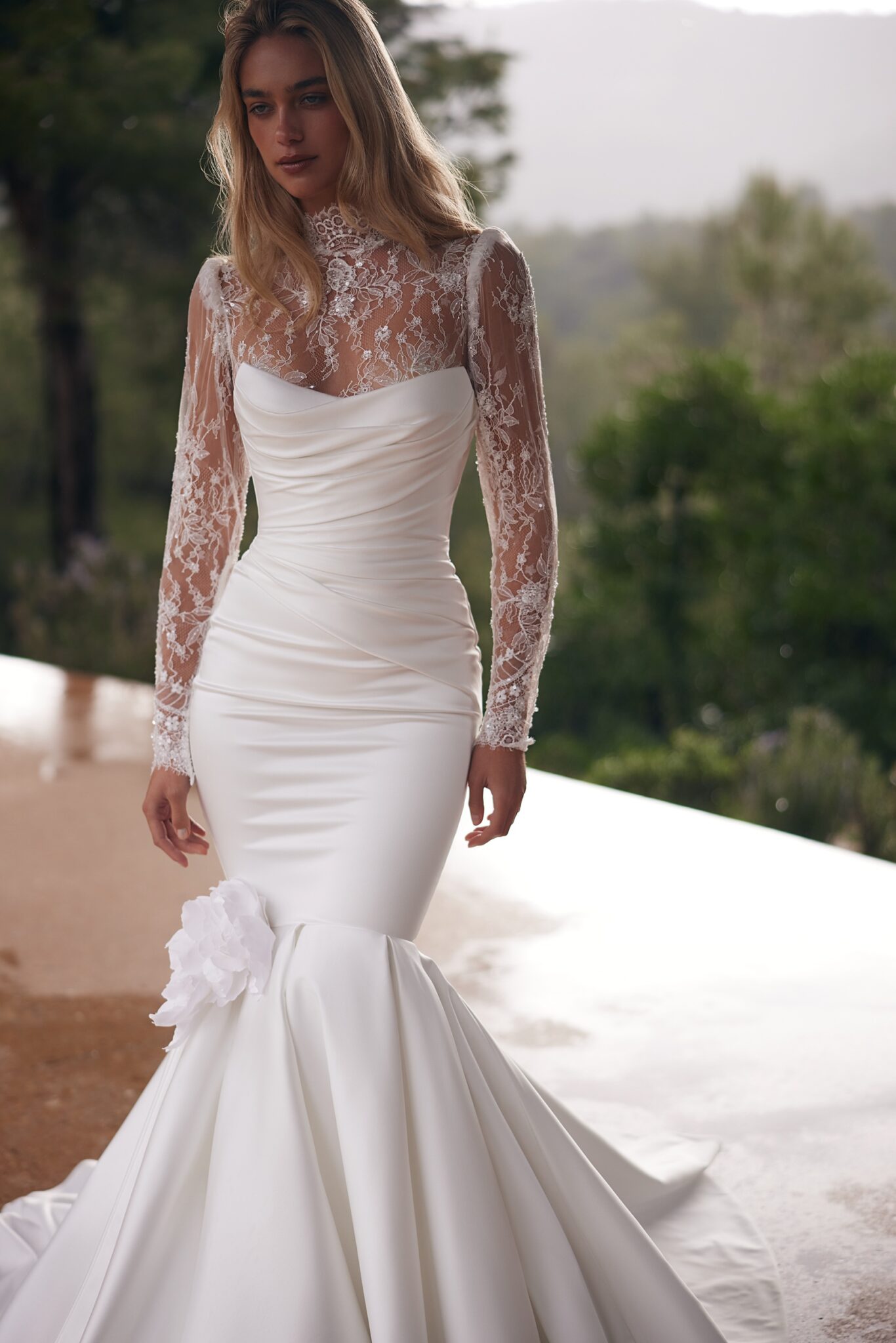 Less is More VA mermaid-style dress made of stretch satin. The set includes a delicate lace bolero with a zipper closure and structured shoulders. > Sergii: The sleeves fasten with a zipper.