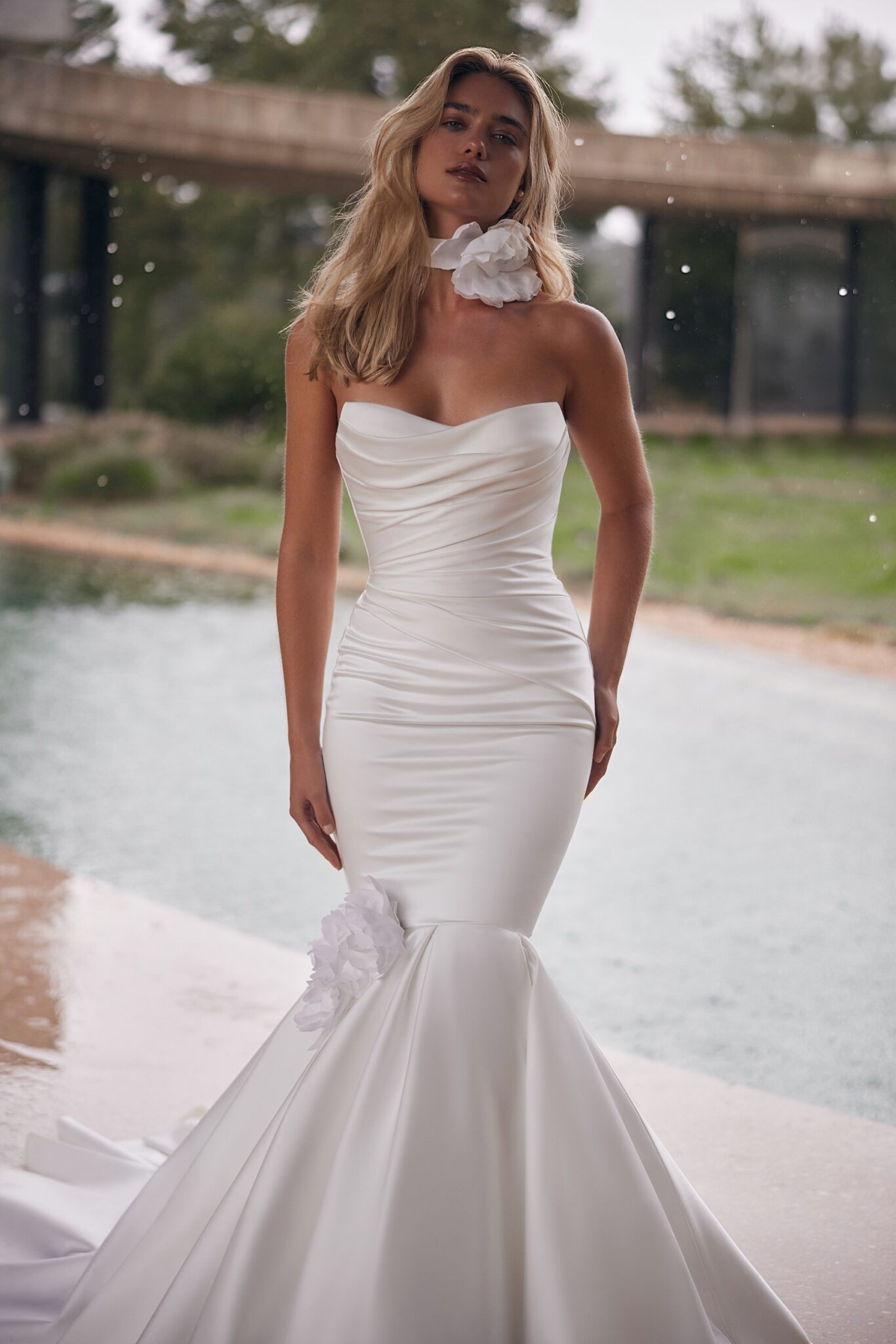 For an extra accent, a matching flower choker can be added to complete the ensemble. The dress features exquisite draping on the corset, emphasizing the silhouette and adding a refined, luxurious touch.