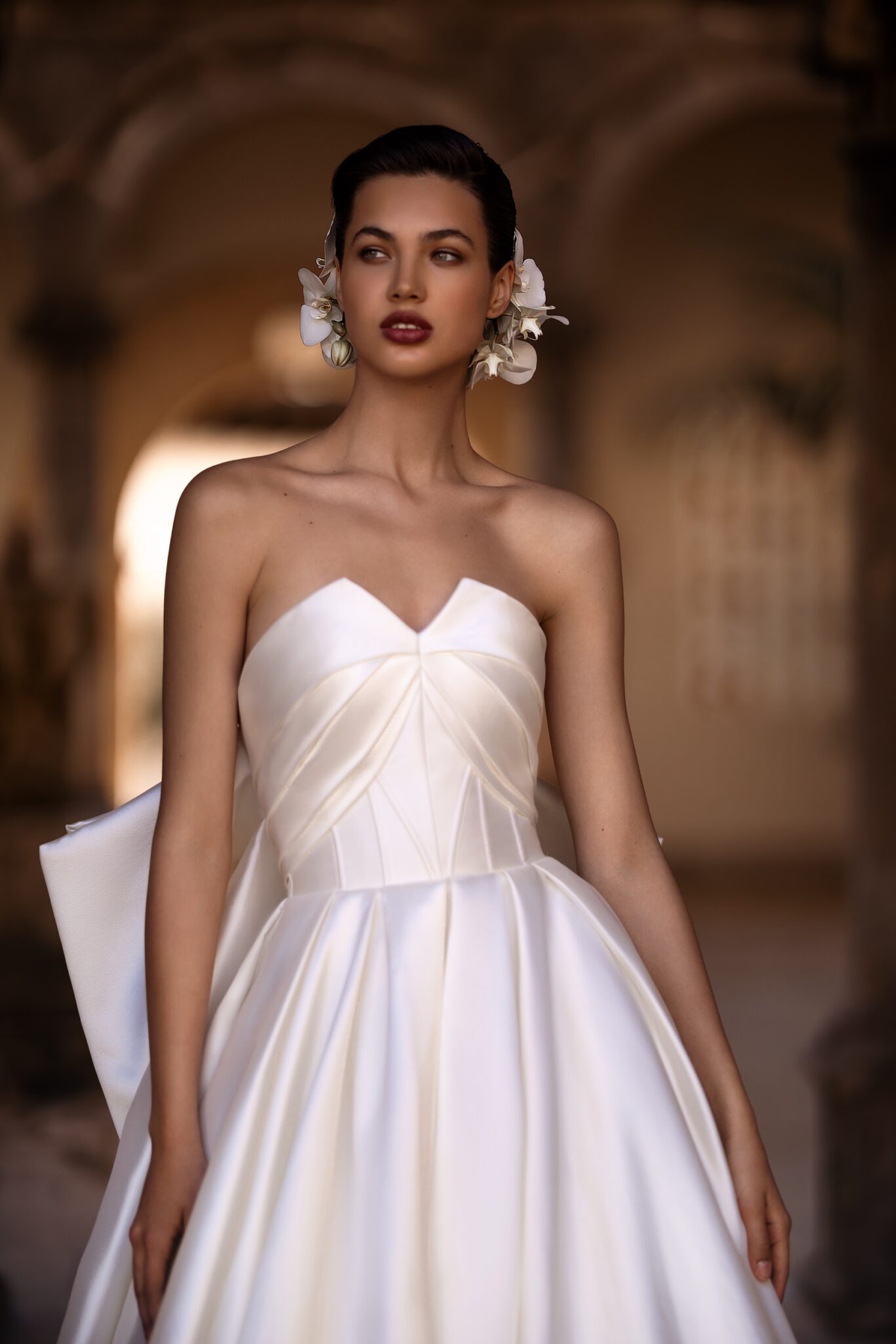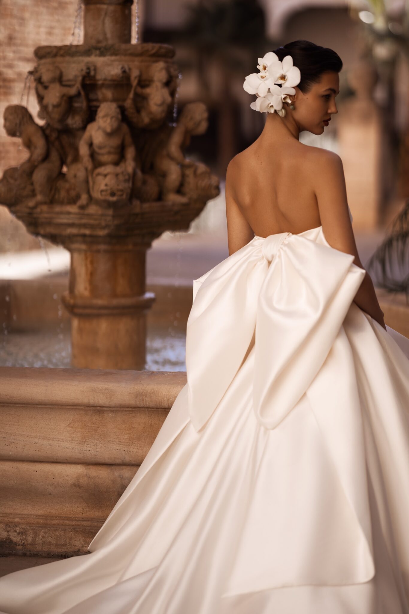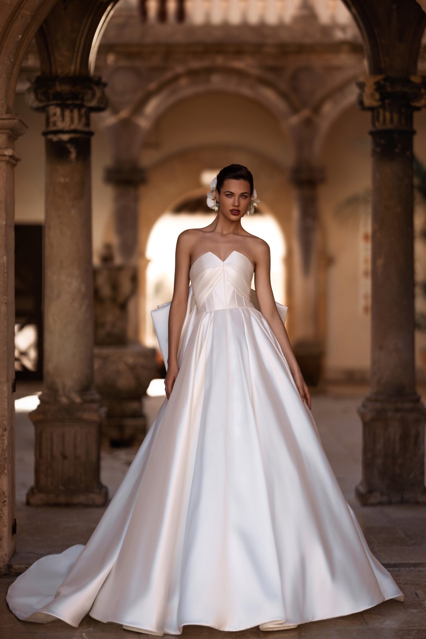 Alma de OroIntroducing our captivating A-line wedding dress, a vision of elegance and sophistication. Crafted from luxurious glossy fabric, it exudes a radiant sheen that commands attention and creates a sense of opulence. Corset with a sweetheart neckline beautifully frames your shoulders and décolletage, enhancing your natural beauty with a touch of romance. Adding a charming detail, a big bow gracefully adorns the back of the dress, creating a striking focal point and adding an element of femininity. As you walk down the aisle, the A-line silhouette drapes effortlessly, exuding grace and timeless allure. The dress features a long train that glides behind you, leaving a trail of elegance and grandeur.
