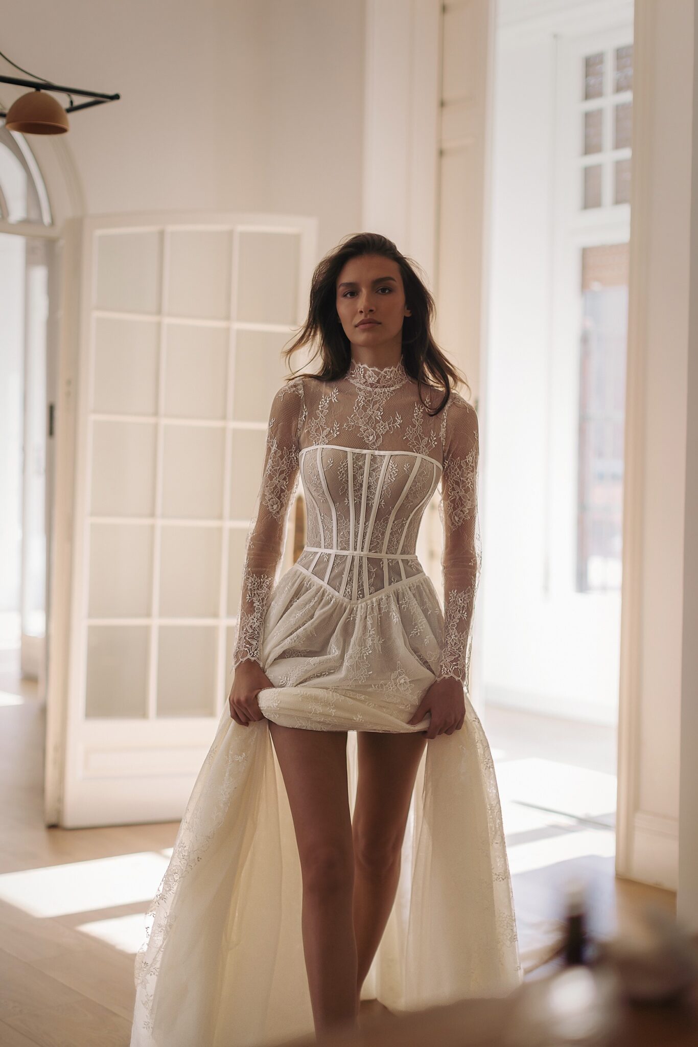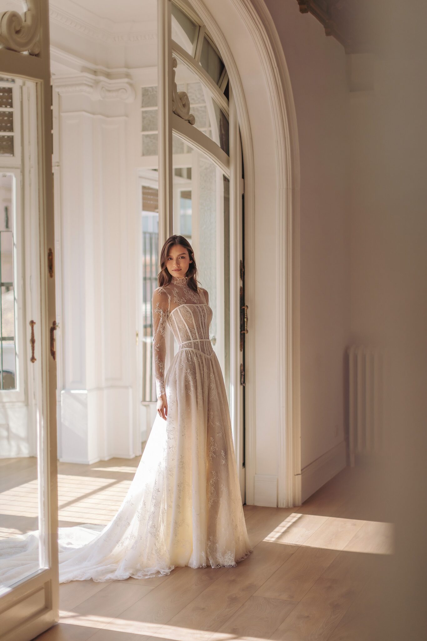 Gemini, Plus Size, Sample SaleLegend — semi-translucent detailed corset-based turtleneck dress with long sleeves and floral embroideries above the cups, on the waist, sleeves, and on the skirt.