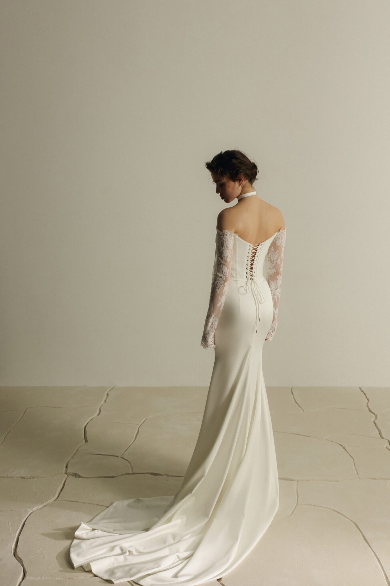 Kiss of SilenceA minimalist off-the-shoulder mermaid gown with long sleeves, crafted from luxurious satin. The corset features soft tulle draping that adds delicate texture, while both the corset and sleeves are adorned with refined Chantilly lace for a romantic touch. The gown is finished with a subtle, elegant train — perfect for brides who appreciate understated beauty with a hint of classic charm.
