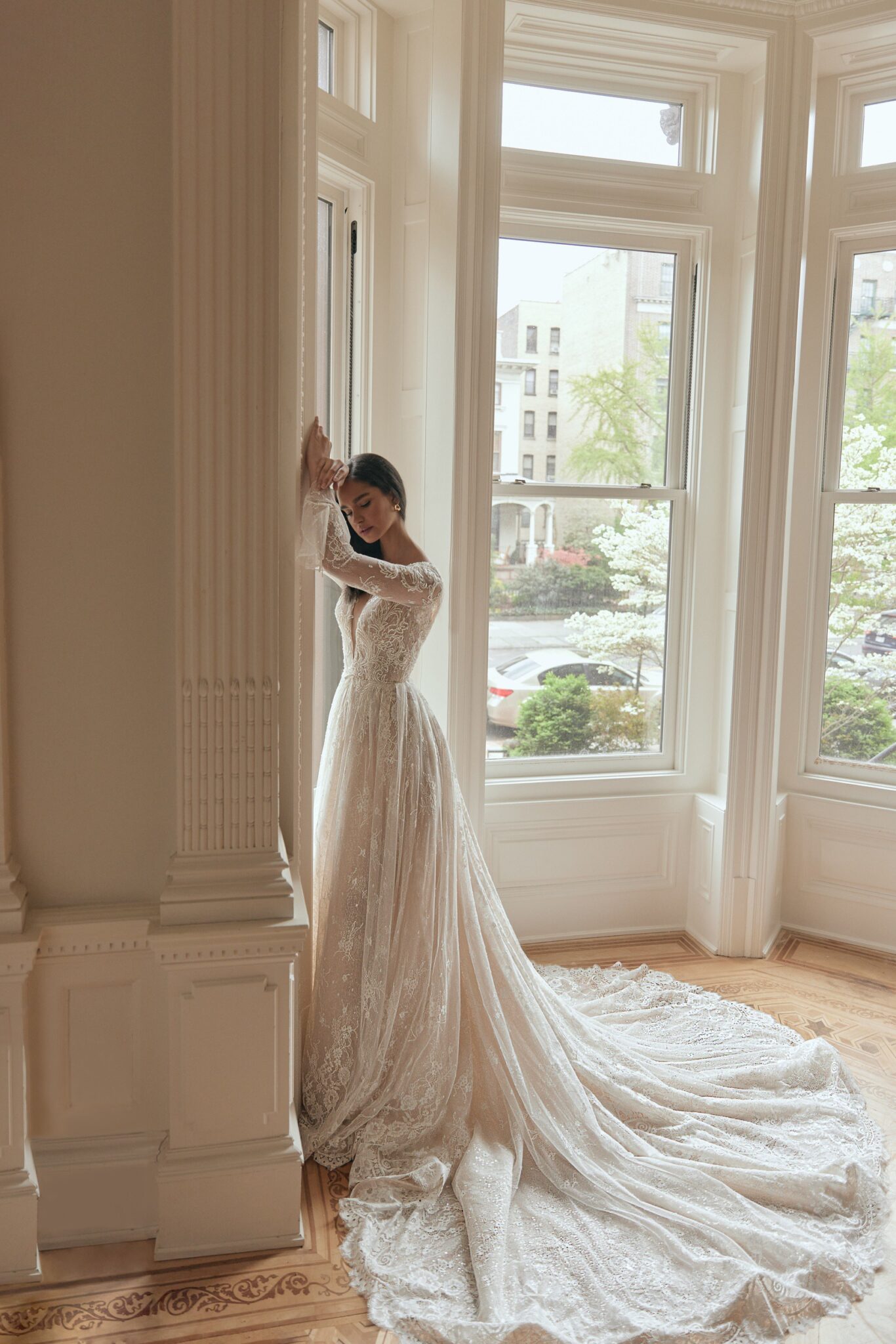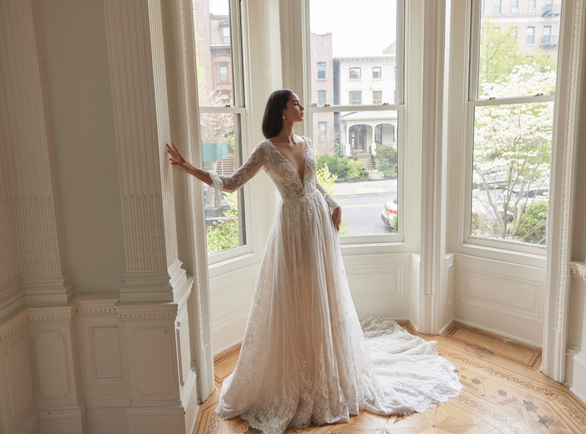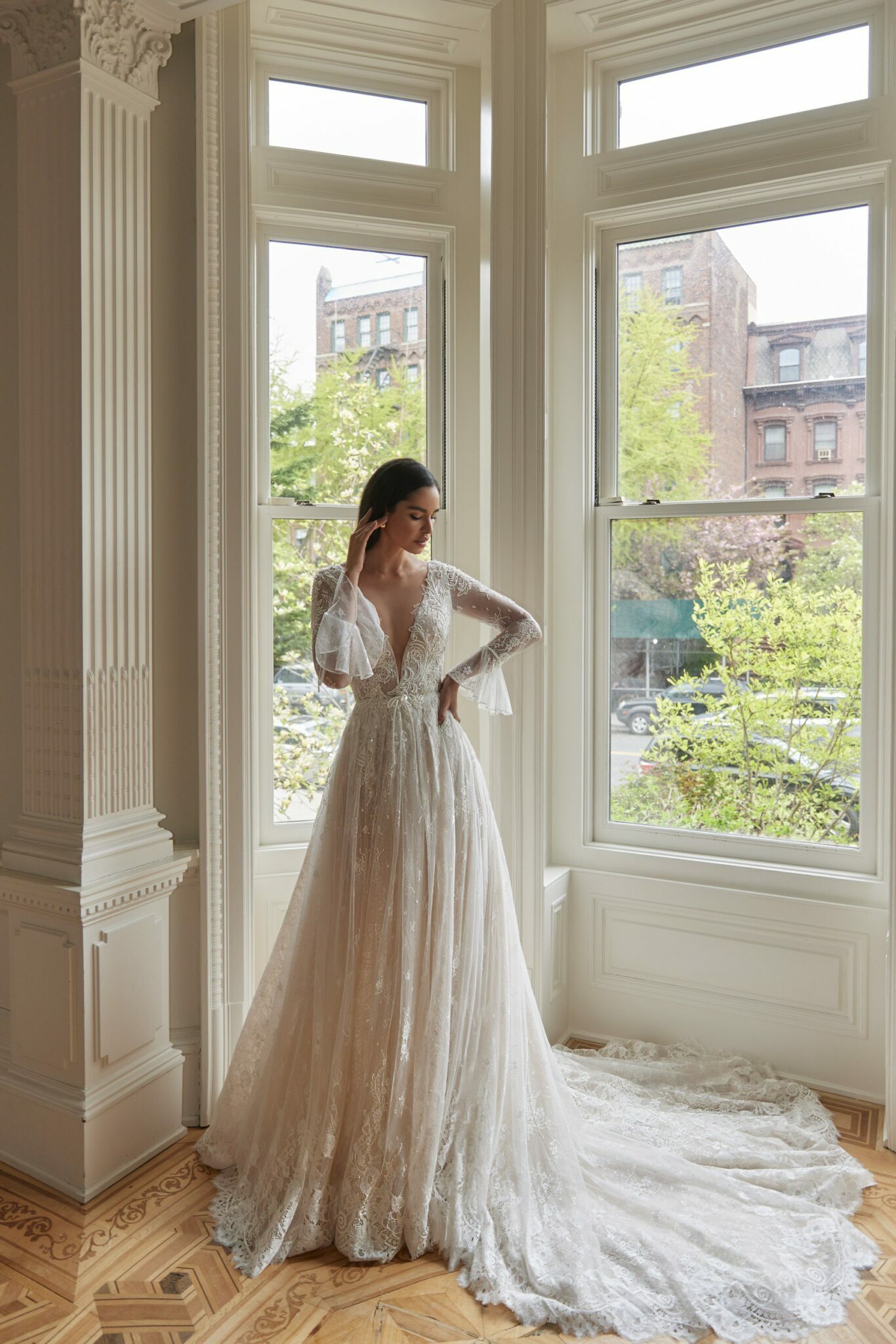 Love in the CityLace Leonila A-line wedding gown looks fabulous. Temder V-neckline accentuates the cellarbones and the corsage is made of sophisticated lace. Veiling insets on the corsage look fantastic. The long lace sleeves end with elegant falbalas. The skirt is made of the same lace with floral pettern and Tulle layers. Long train makes this outfit perfect.