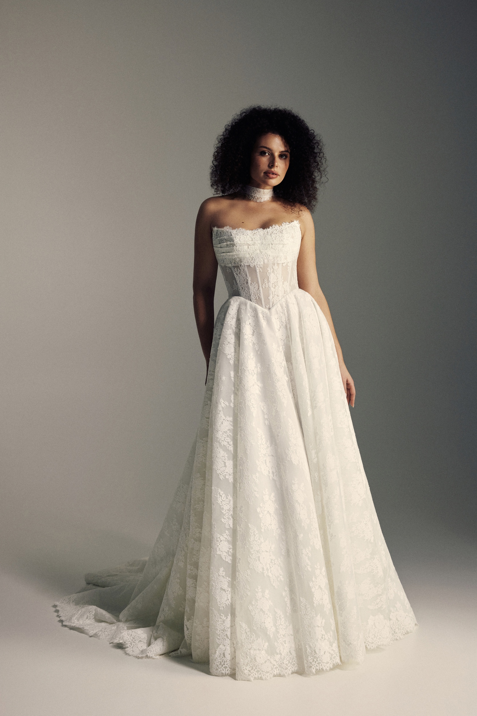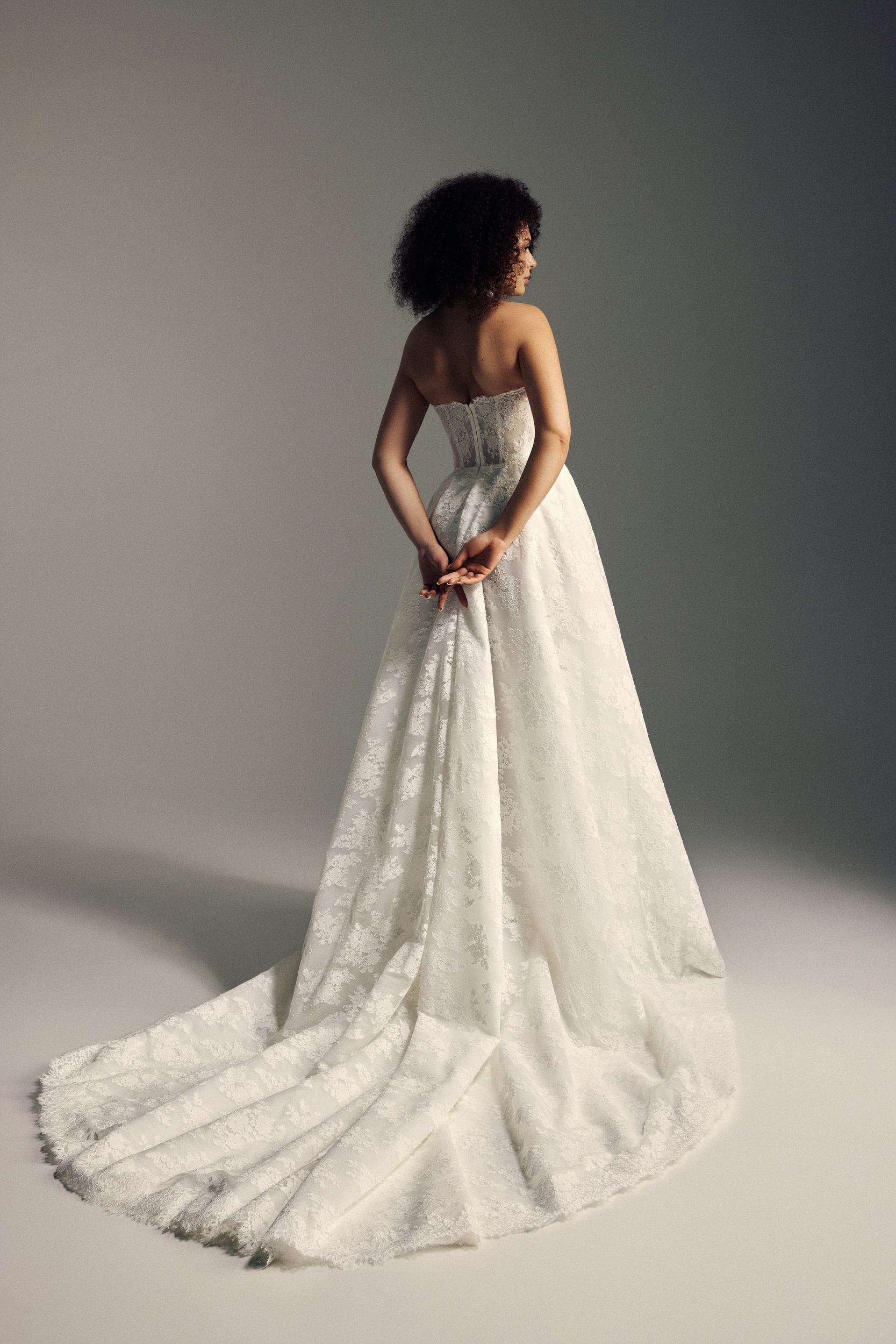 Blooming LoveLilli is a romantic and sculptural gown designed in a floral lace A-line silhouette that feels both timeless and feminine. A strapless, draped corset with visible boning and a sculpted Basque waist defines the bodice with structure and elegance, while a clean zipper back and flowing cathedral-length train complete the look with graceful drama.