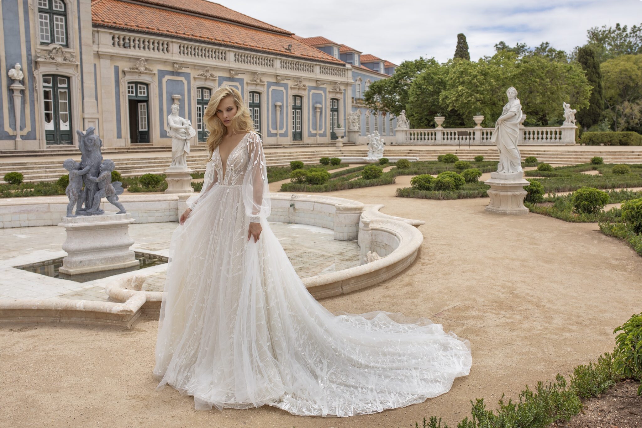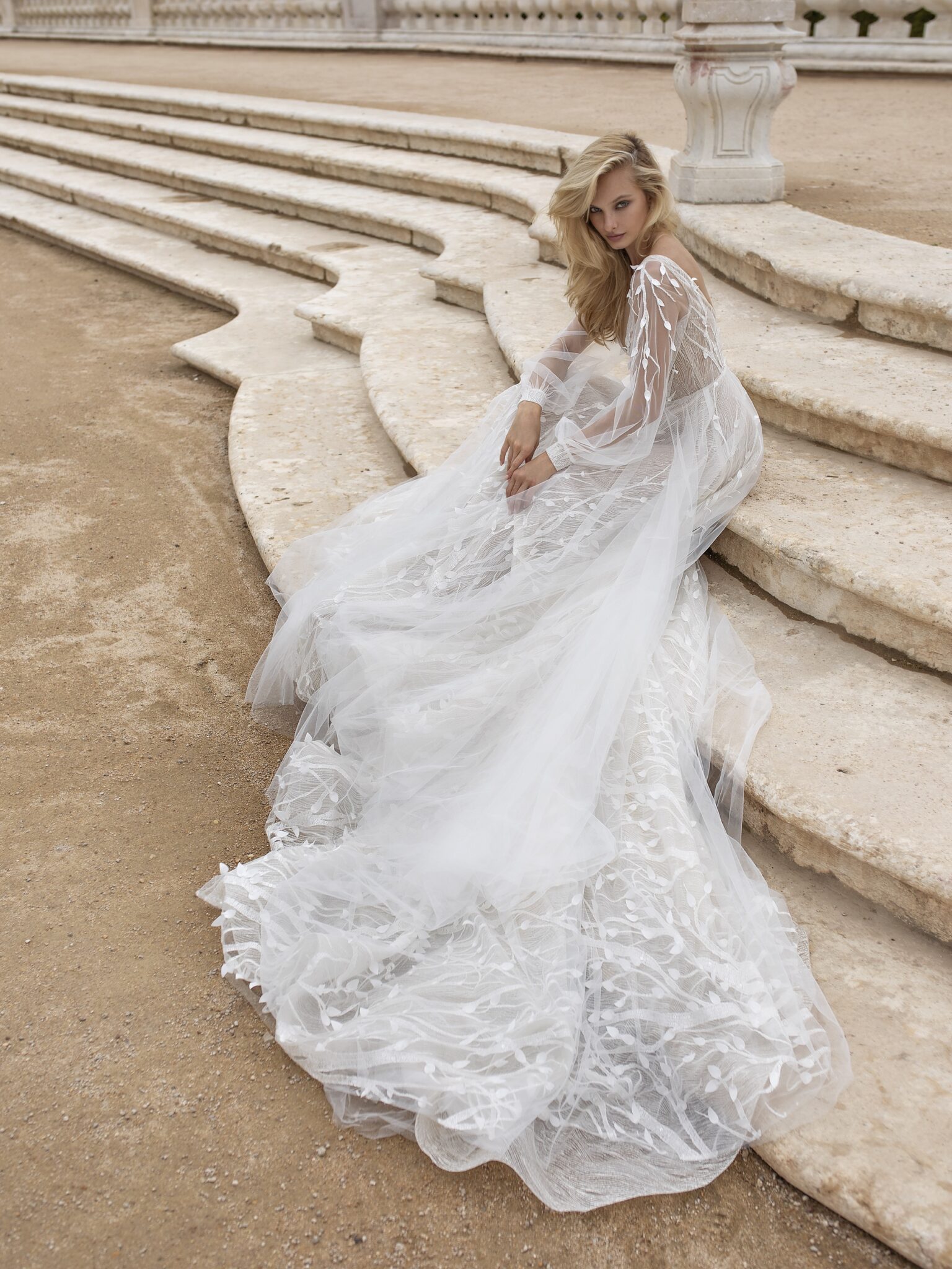 Lisbon VibesFabulous Lima wedding gown is a graceful and laconic outfit. A-line dress is entirely decorated with a floral lace pattern. This pattern is combined with a thin veiling layer. V-shaped low neck, long deep neckline at the back of a dress make this look tender and feminine.