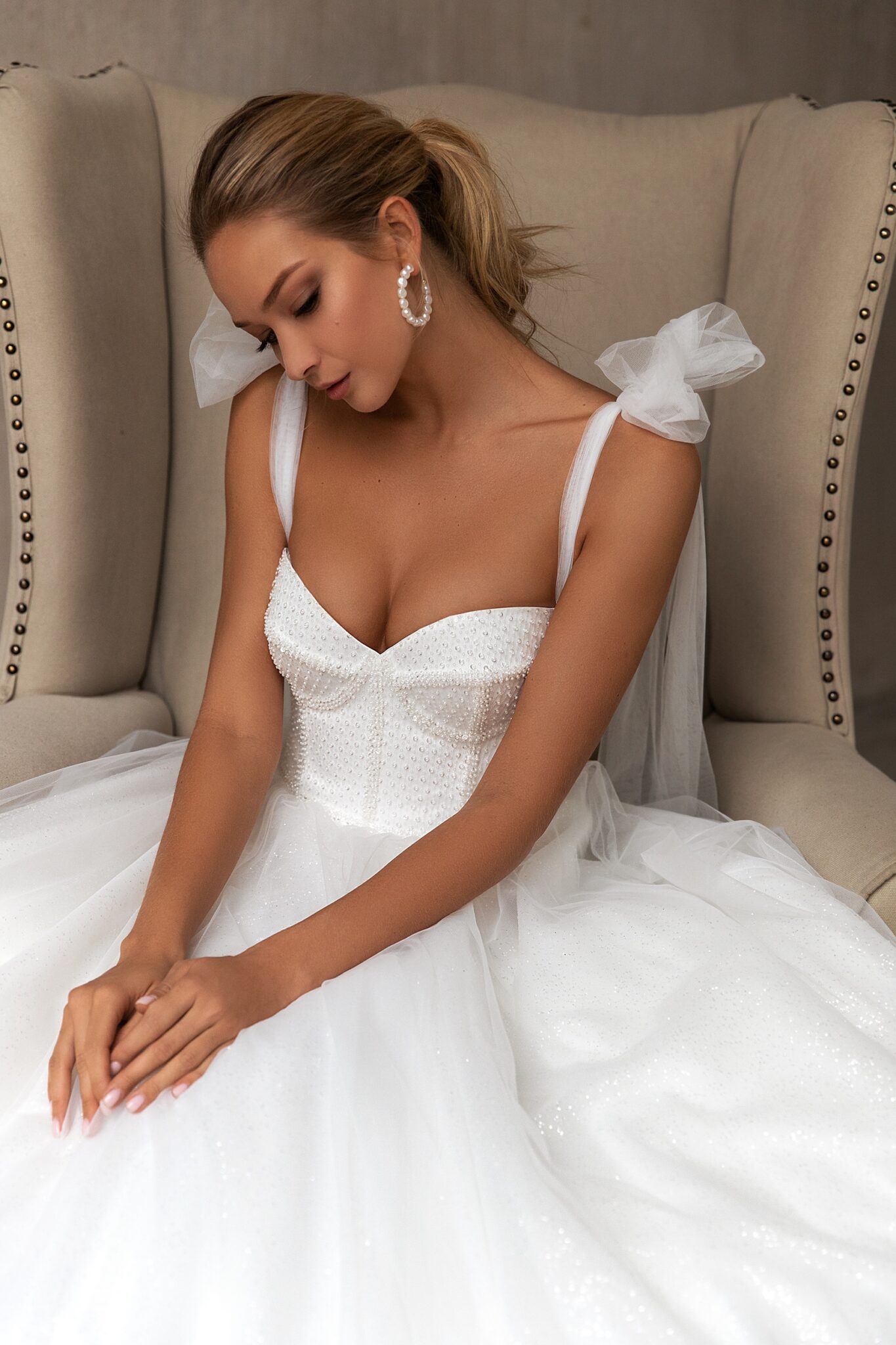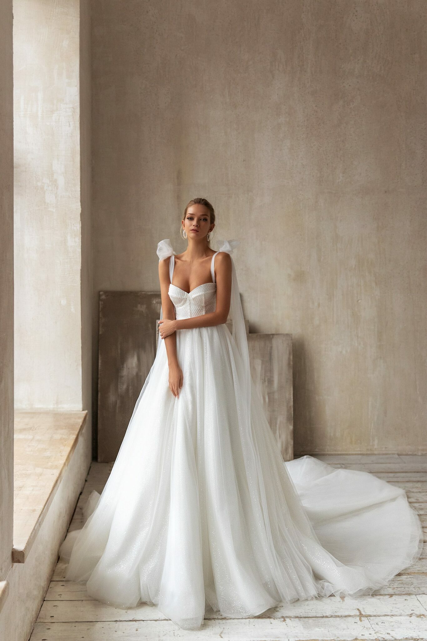 Less is more 2021Lindsay is a fetching wedding dress with a loose skirt and a long train. The wedding gown with a sweetheart neckline is embellished with shoulders straps that are tied in a bow and made of veiling. A corset is made of crepe-satin and embroidered with spangles. At the back, the corset is decorated with lacing. A loose skirt is made of many layers of veiling.