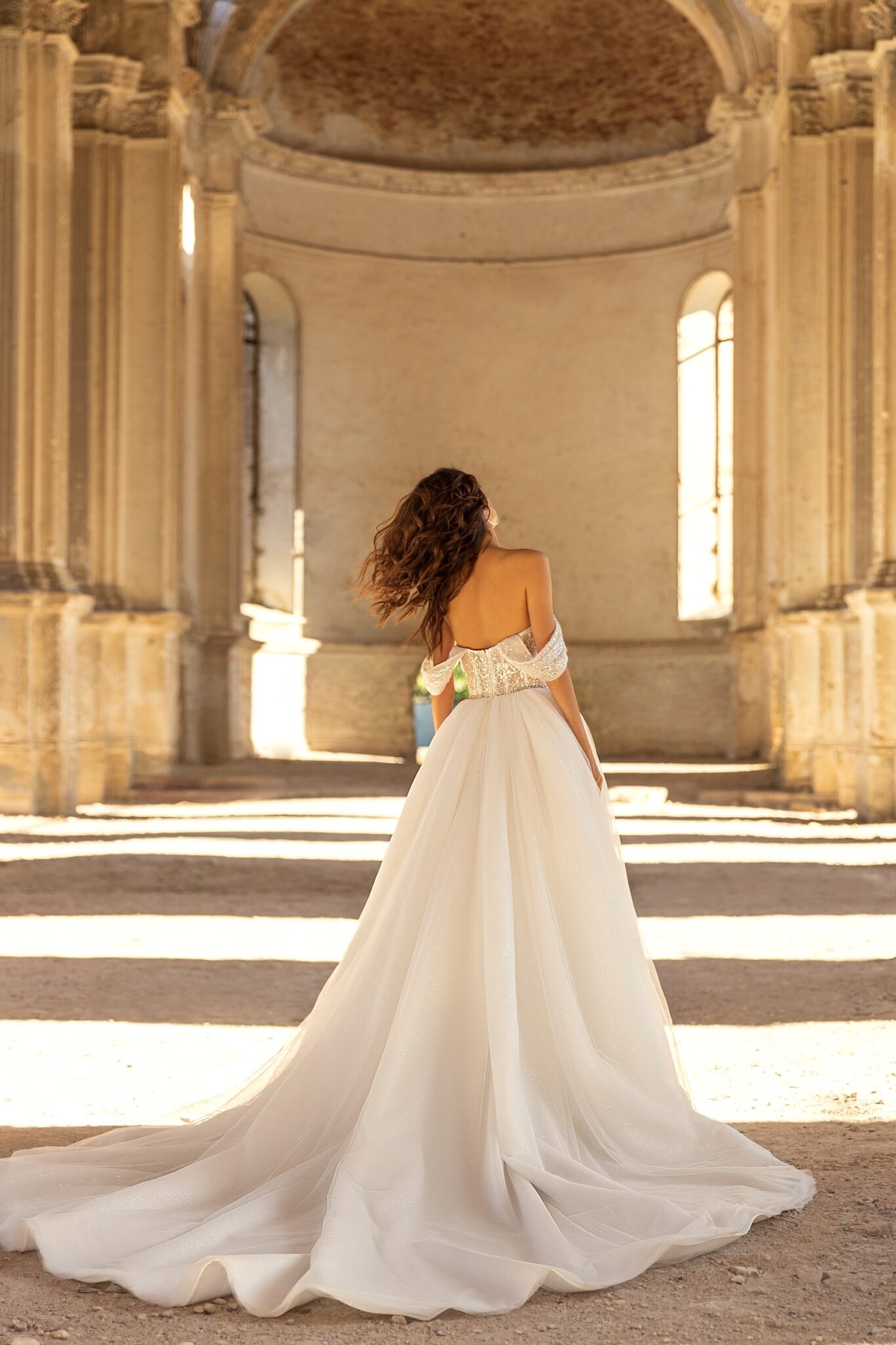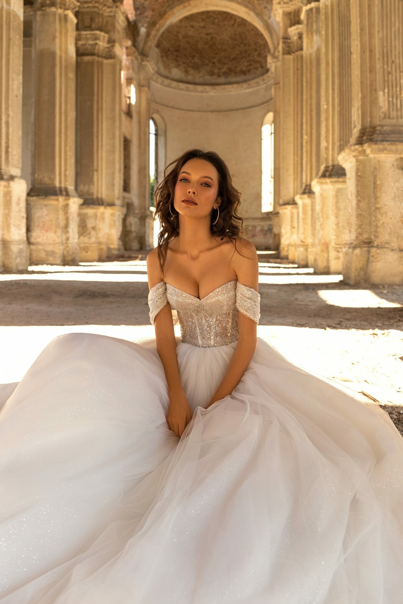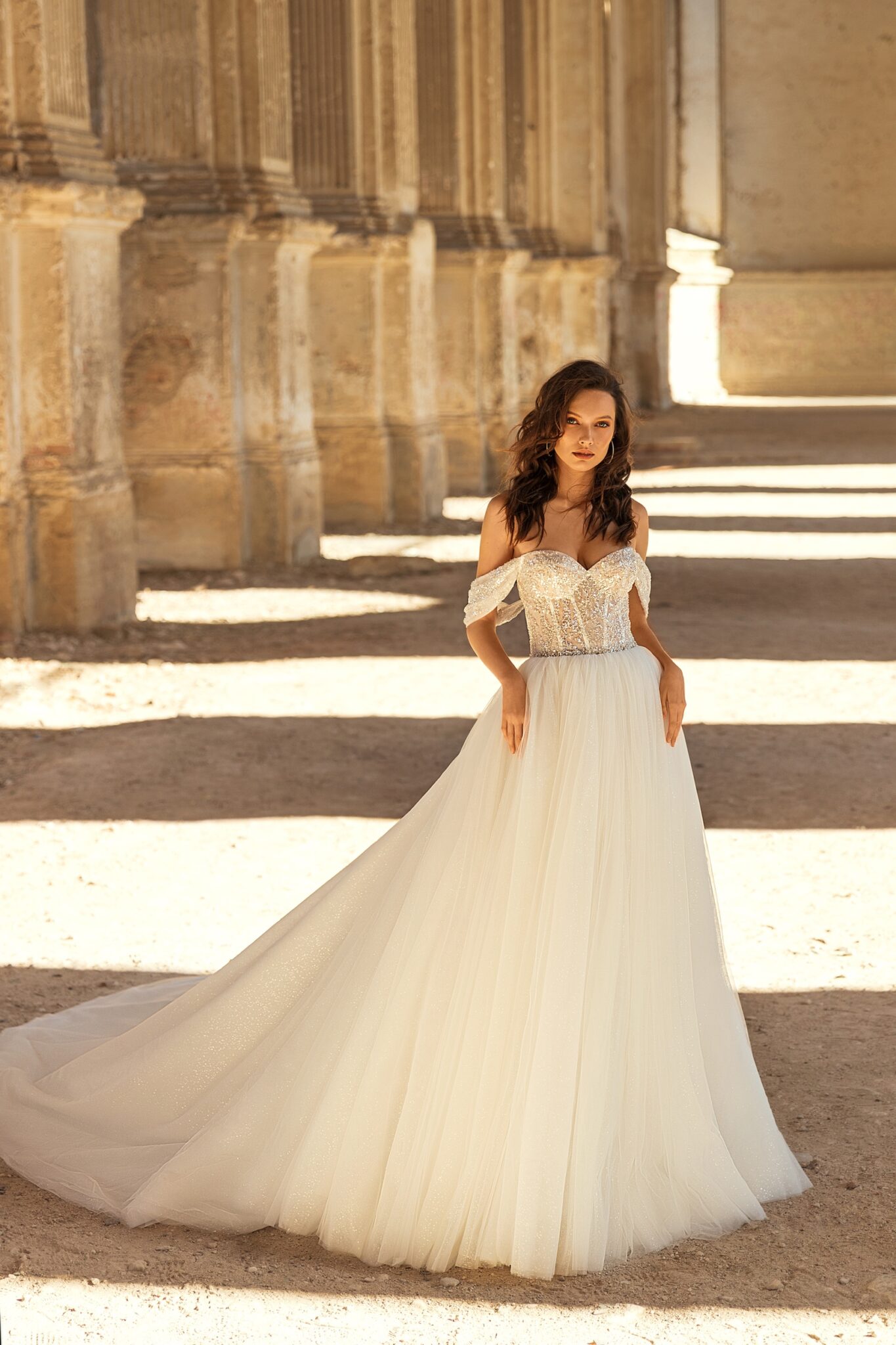 Golden HourA lightweight wedding dress with a sweetheart neckline and off shoulder sleeves. The corset of the dress is decorated with shiny lace made of beads is combined with a delicate belt and a simple tule skirt.