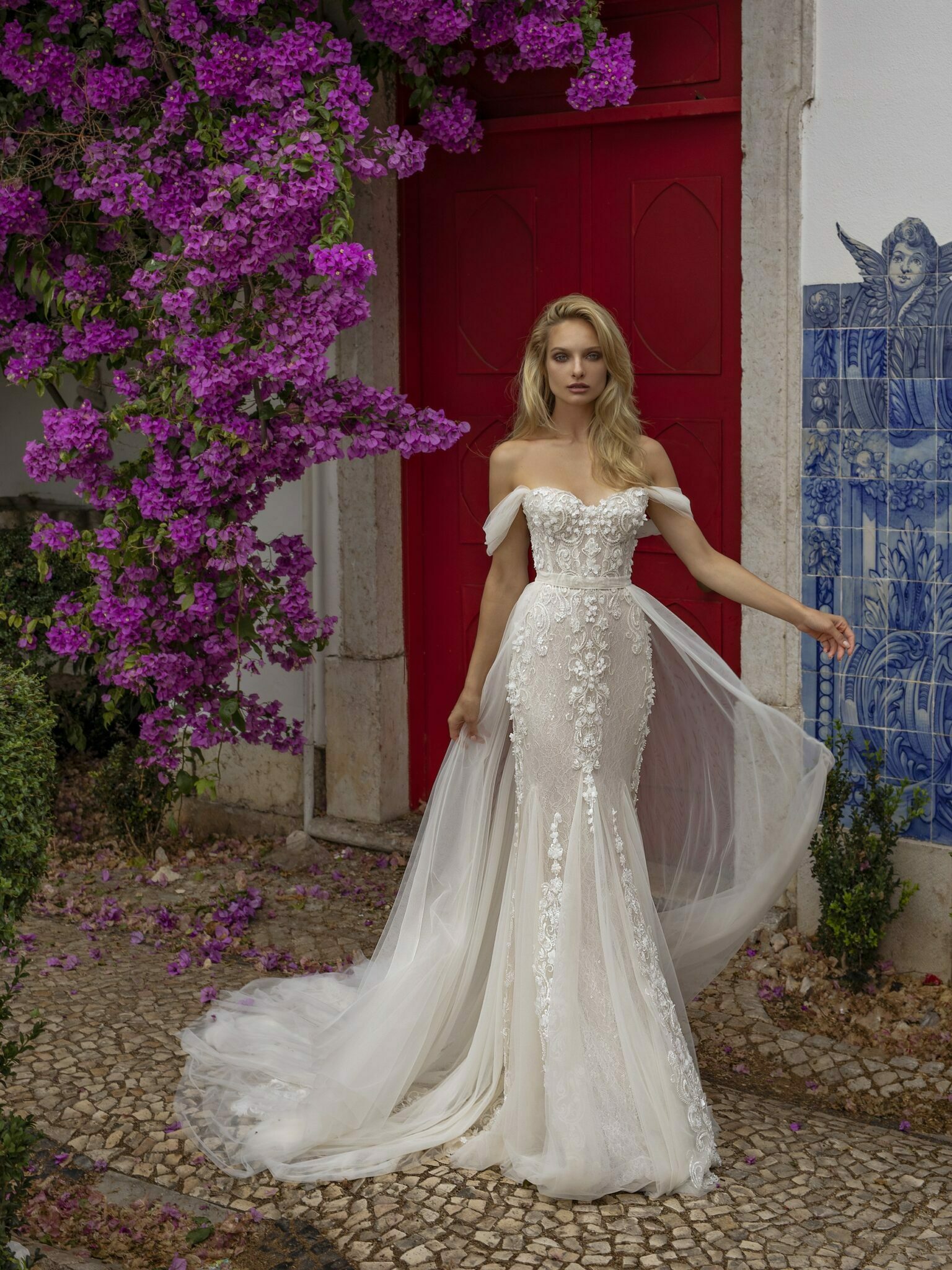 Lisbon VibesFantastic Lira wedding dress is a perfect variant for bold brides. A mermaid wedding gown is decorated with lace flowers. A strapless corsage is embellished with veiling. A removable veiling skirt is completed with veiling falbalas.