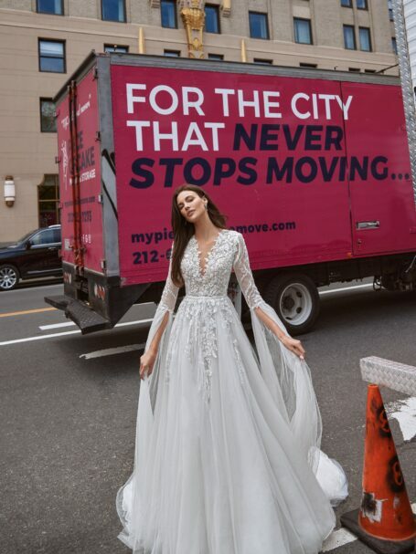 Love in the CityLovely is a gorgeous midi-length wedding gown. The corset is all embroidered with sequins and beads. The neckline is featured with high collar and the sleeves are long with the same embroidery. Lovely dress has a chic ancle-length skirt made of numerous layers of Tulle. The back is embellished with a spectacular detail that exposes the back. Lovely is a perfect choice for a wedding party.
