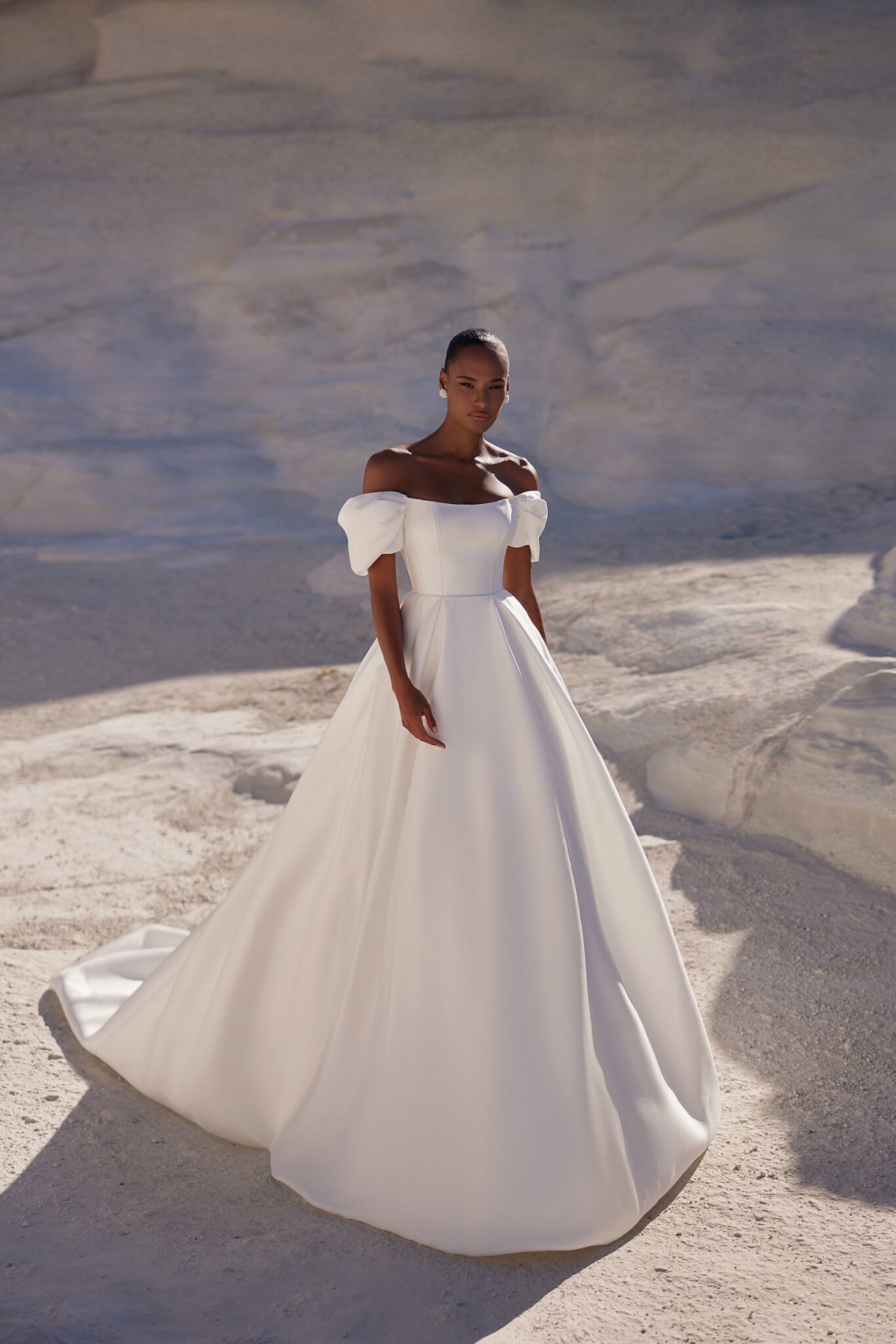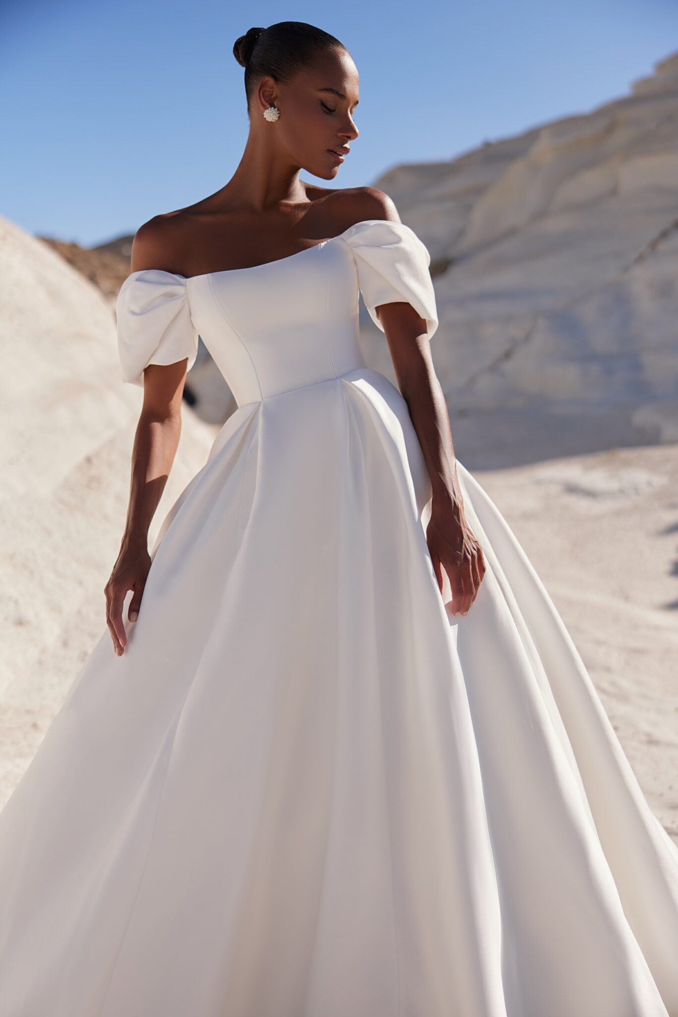 VenusStylish off-the-shoulders corset dress with minimal details yet eye-catching refinements like draped sleeves and visible tucks in the upper part of the skirt.