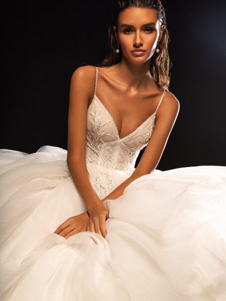 StardustA royal wedding gown with a fabulous train made of ruffles. The corset of the dress and the dress itself are made of sparkly fabrics. A sheath dress is embellished with a sweetheart neckline and thin shoulder straps.