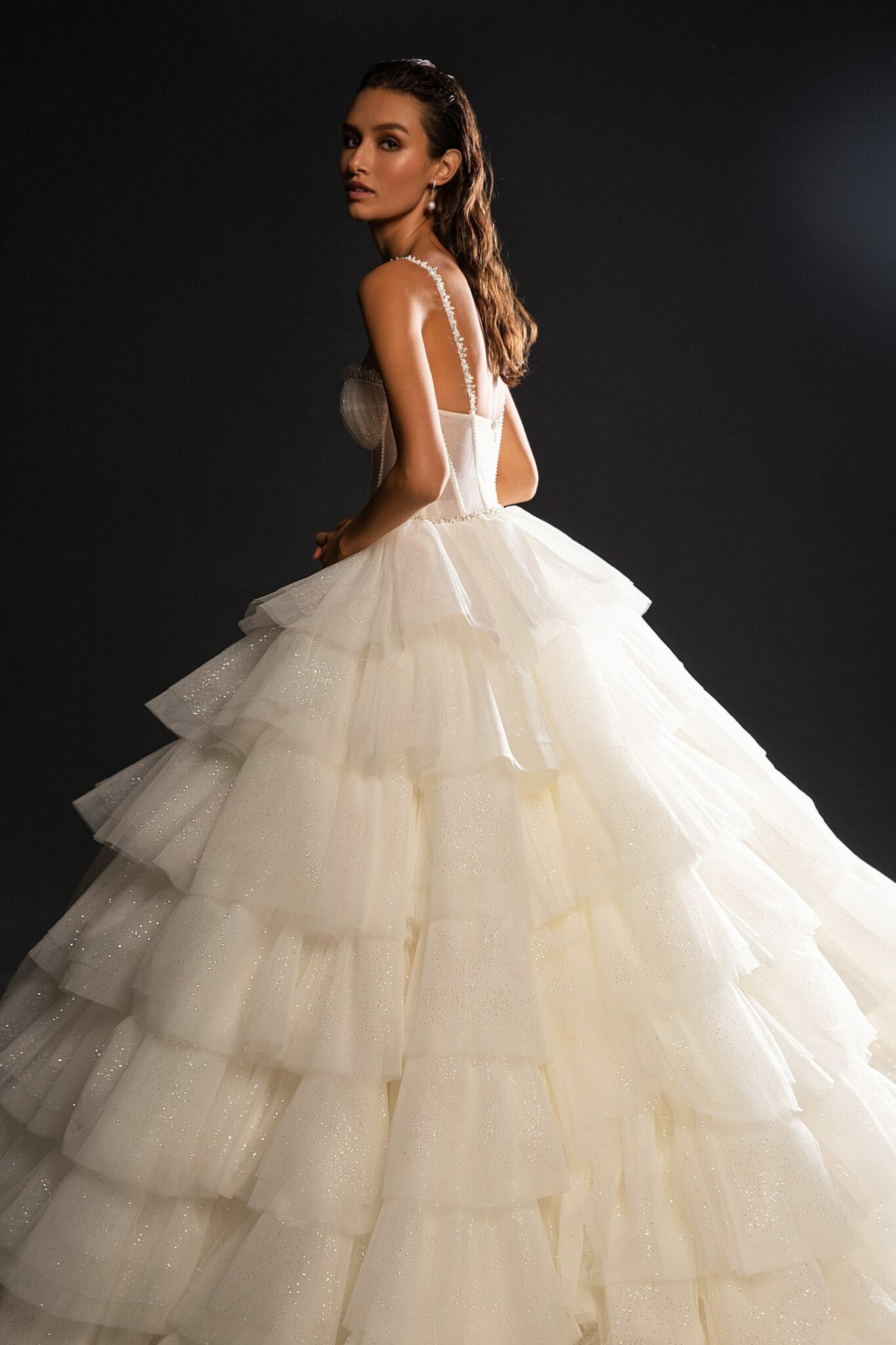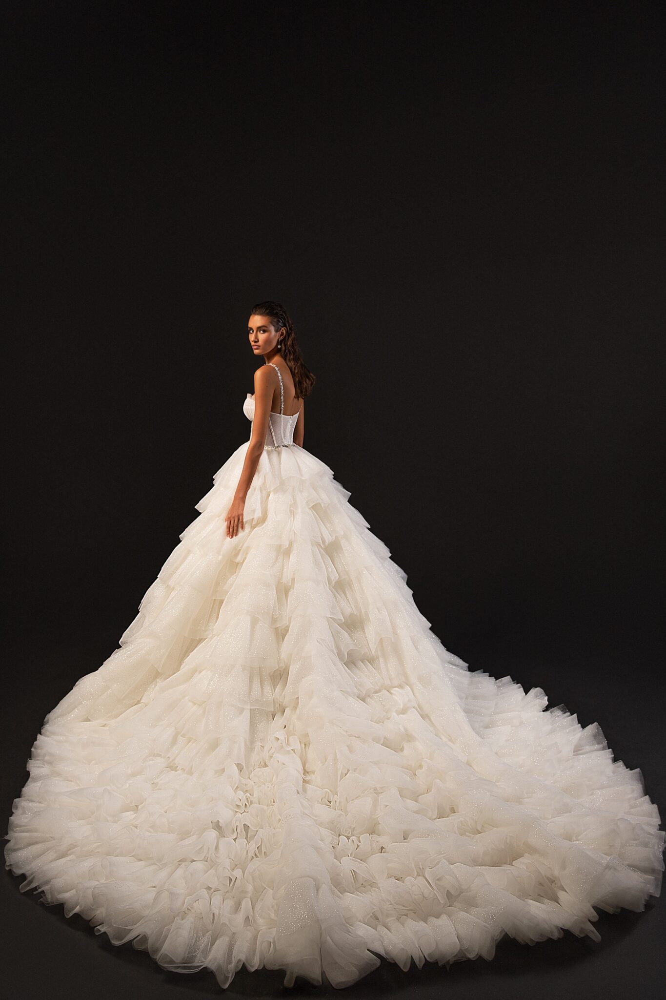 StardustA royal wedding gown with a fabulous train made of ruffles. The corset of the dress and the dress itself are made of sparkly fabrics. A sheath dress is embellished with a sweetheart neckline and thin shoulder straps.