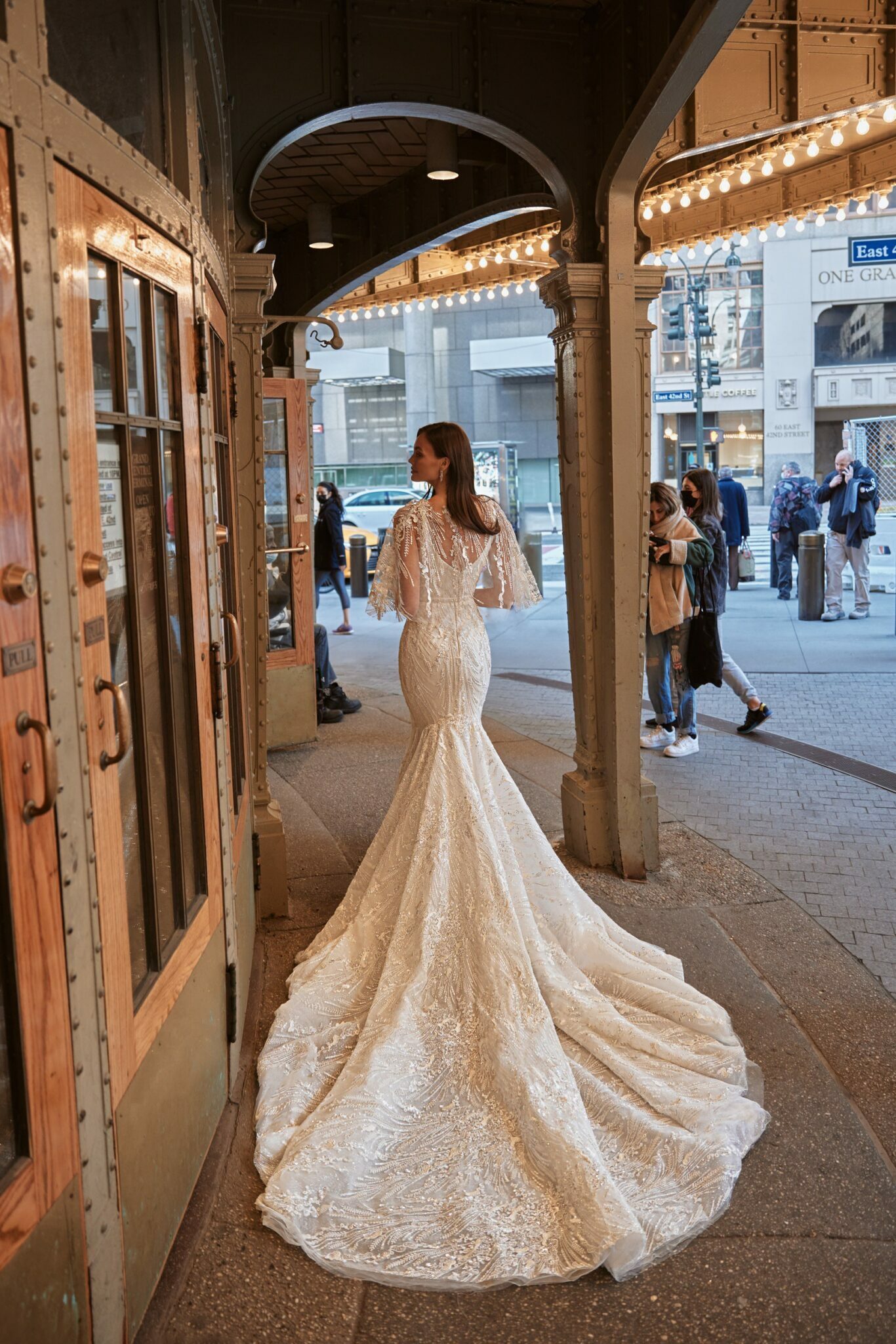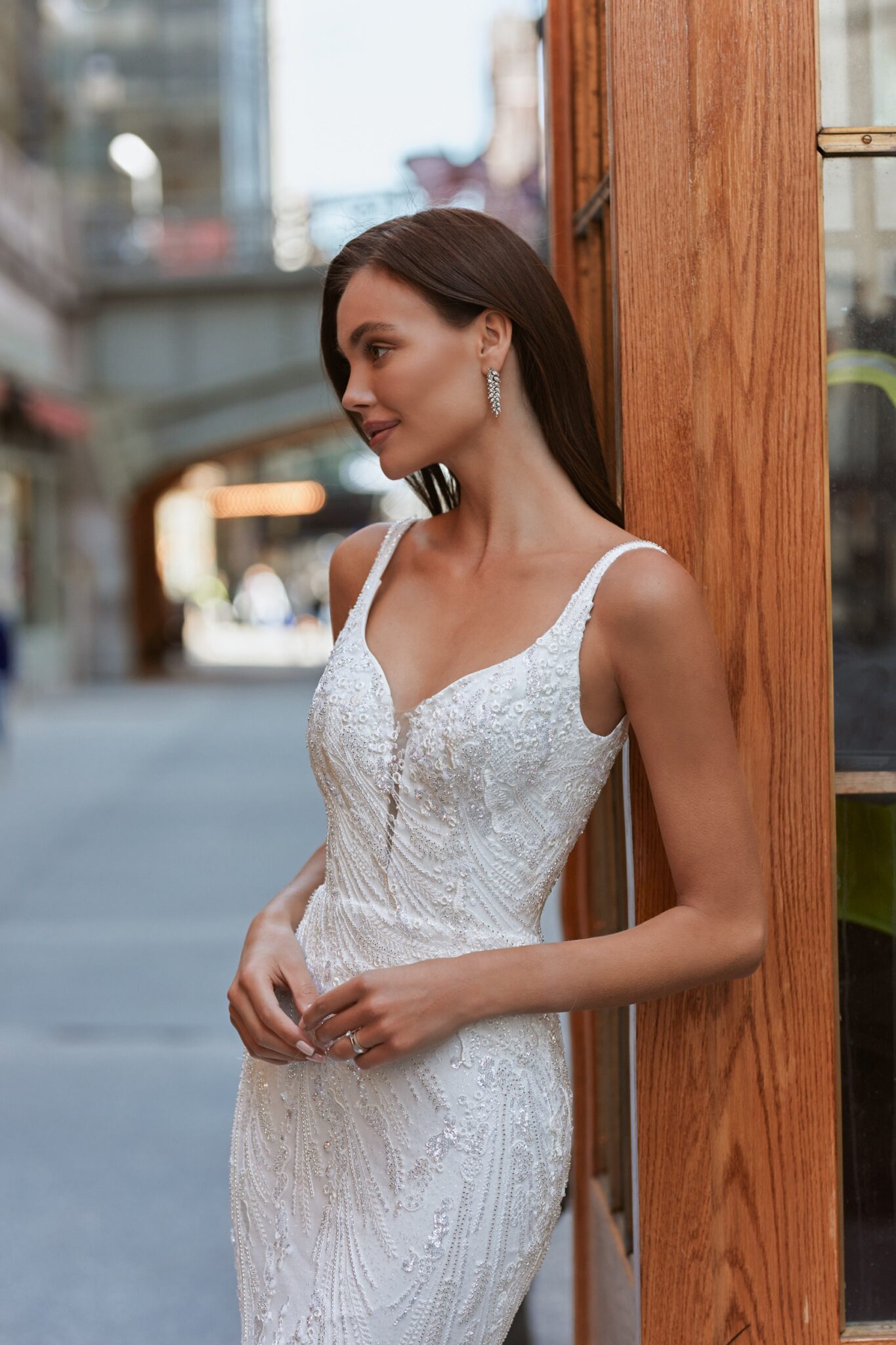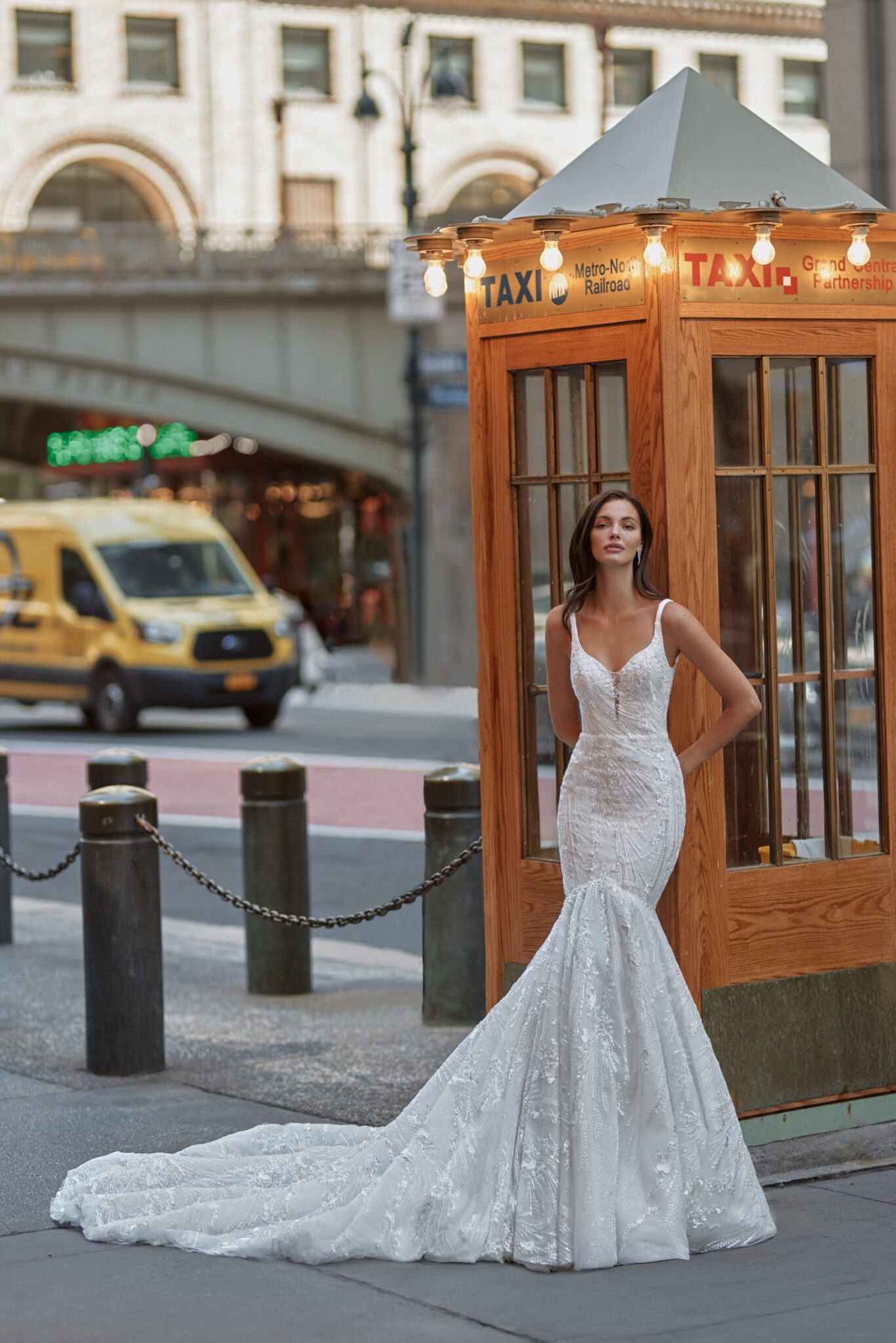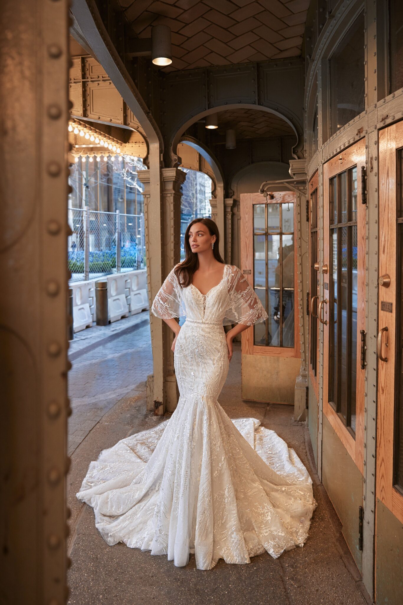 Love in the CityMaddison is a gorgeous dress for a royal wedding look. The main dress is of mermaid silhouette. The corset is embellished with V-shaped low neckline with thin straps and is decorated with embroidered lace. An exquisite bolero created of transparent lace with beads and crystals is fixed on the waistline. The skirt is fitted on the hips and widens down passing into a majestic train.